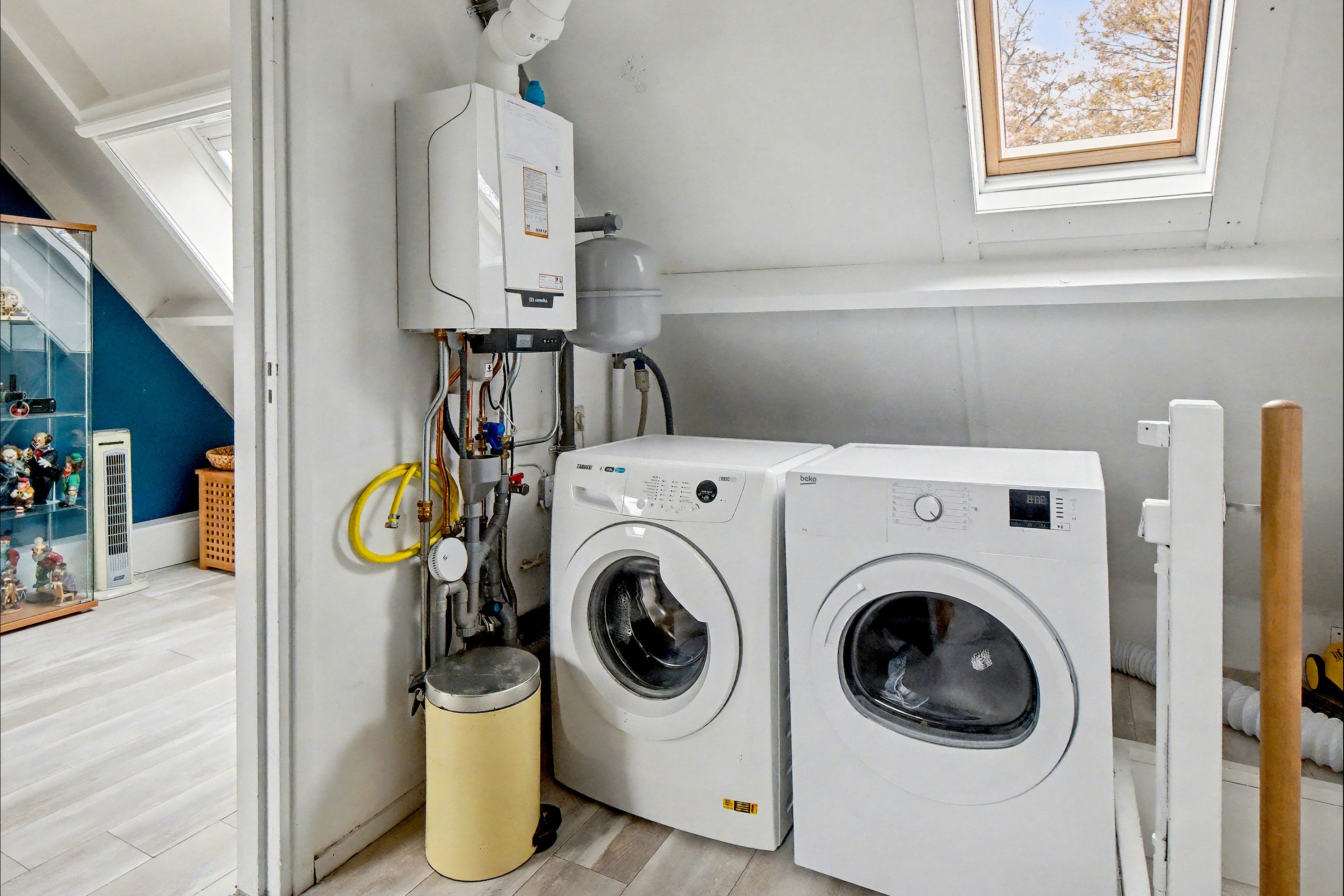 Via de vaste trap kom je op de tweede verdieping, waar nog twee slaapkamers te vinden zijn van 10,7 m² en 4,5 m². De grootste kamer beschikt over een eigen wastafel. Dankzij meerdere dakramen profiteert deze verdieping van veel lichtinval. Op de overloop bevinden zich bovendien de aansluitingen voor de wasmachine en droger.