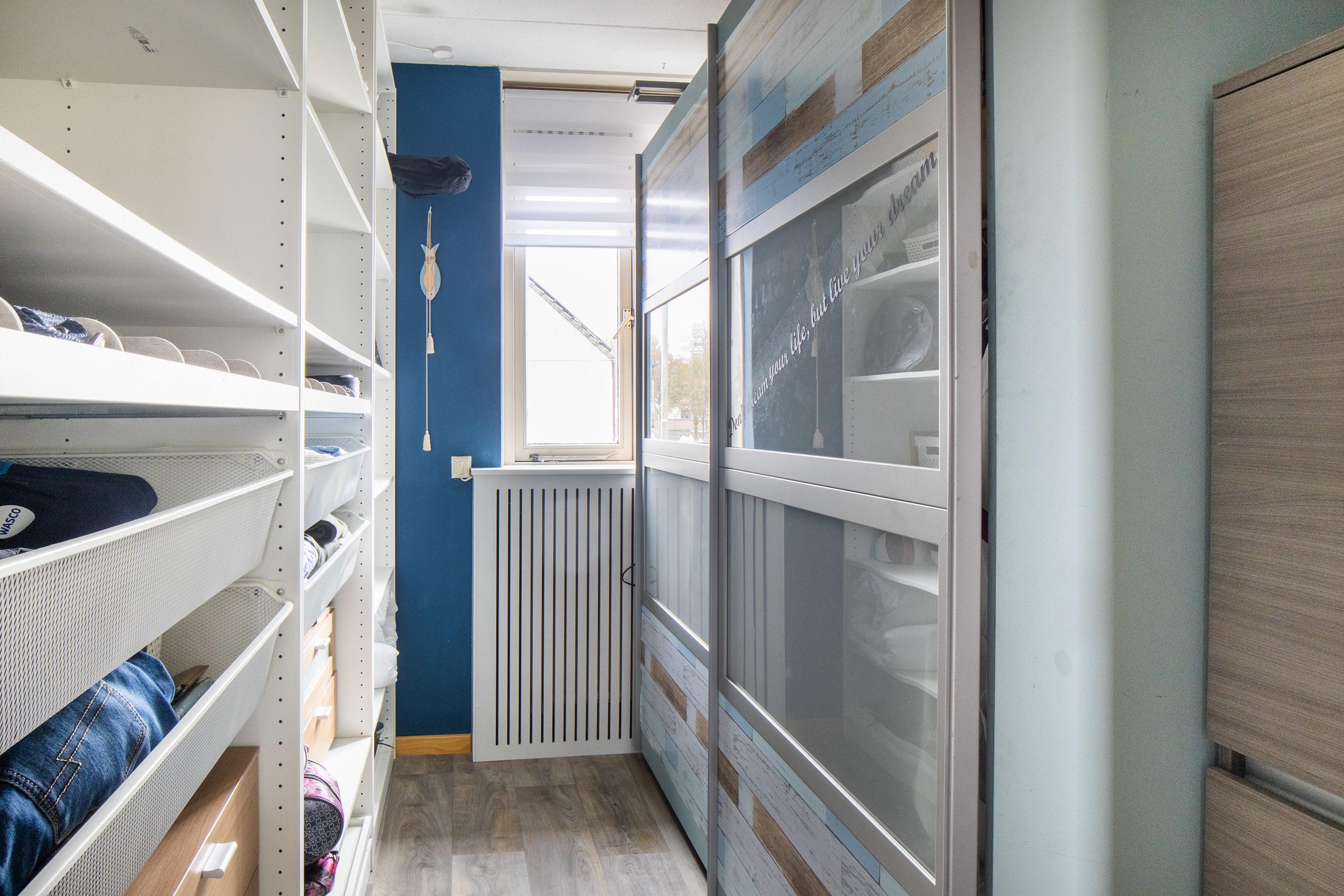 De overloop geeft toegang tot alle ruimtes op deze verdieping. Er zijn twee slaapkamers aanwezig, met afmetingen van 12,8 m² en 8,3 m². Daarnaast is er een kamer van 4,9m² die momenteel gebruikt wordt als kledingkamer en voorzien is van een vaste kastenwand (deze blijft niet achter). De moderne badkamer van 3,8 m² is uitgerust met een inloopdouche, wastafelmeubel en toilet. Het dakraam zorgt voor prettig daglicht.