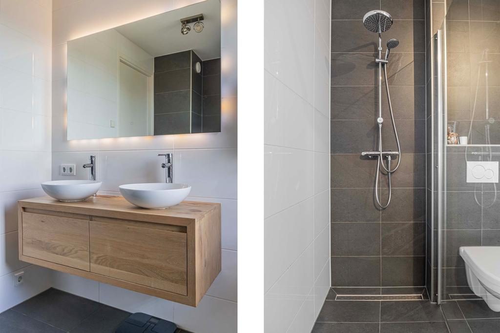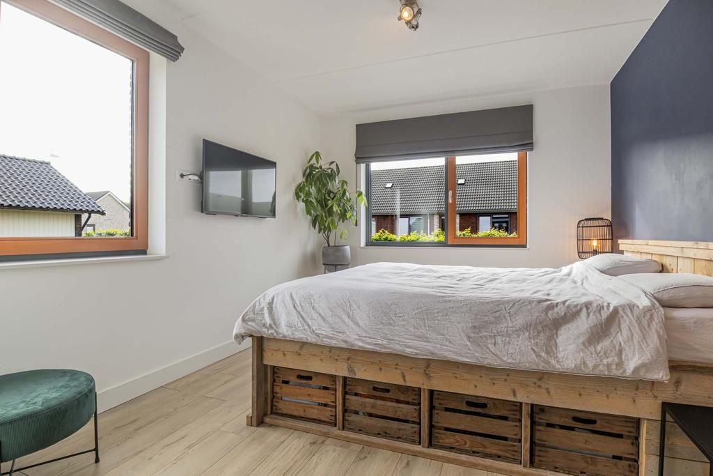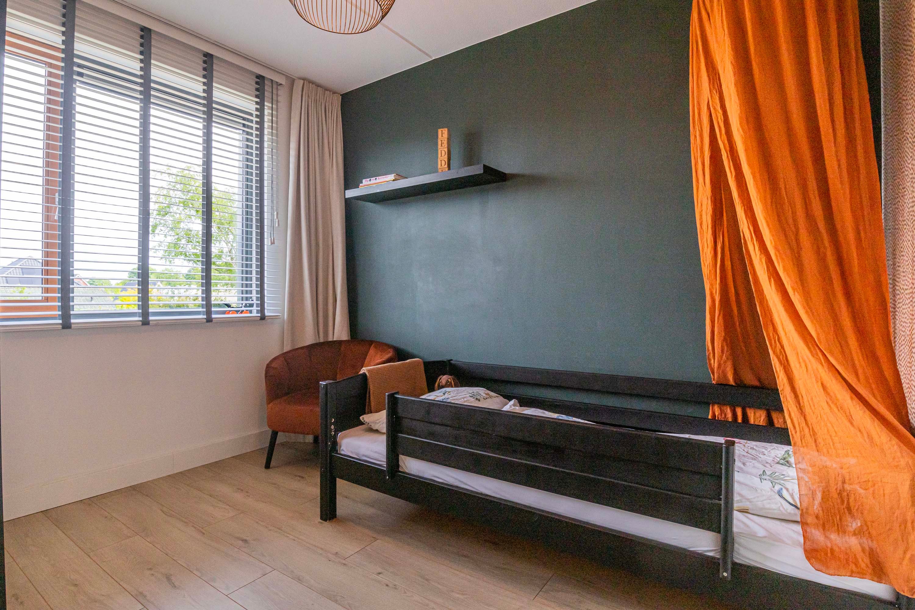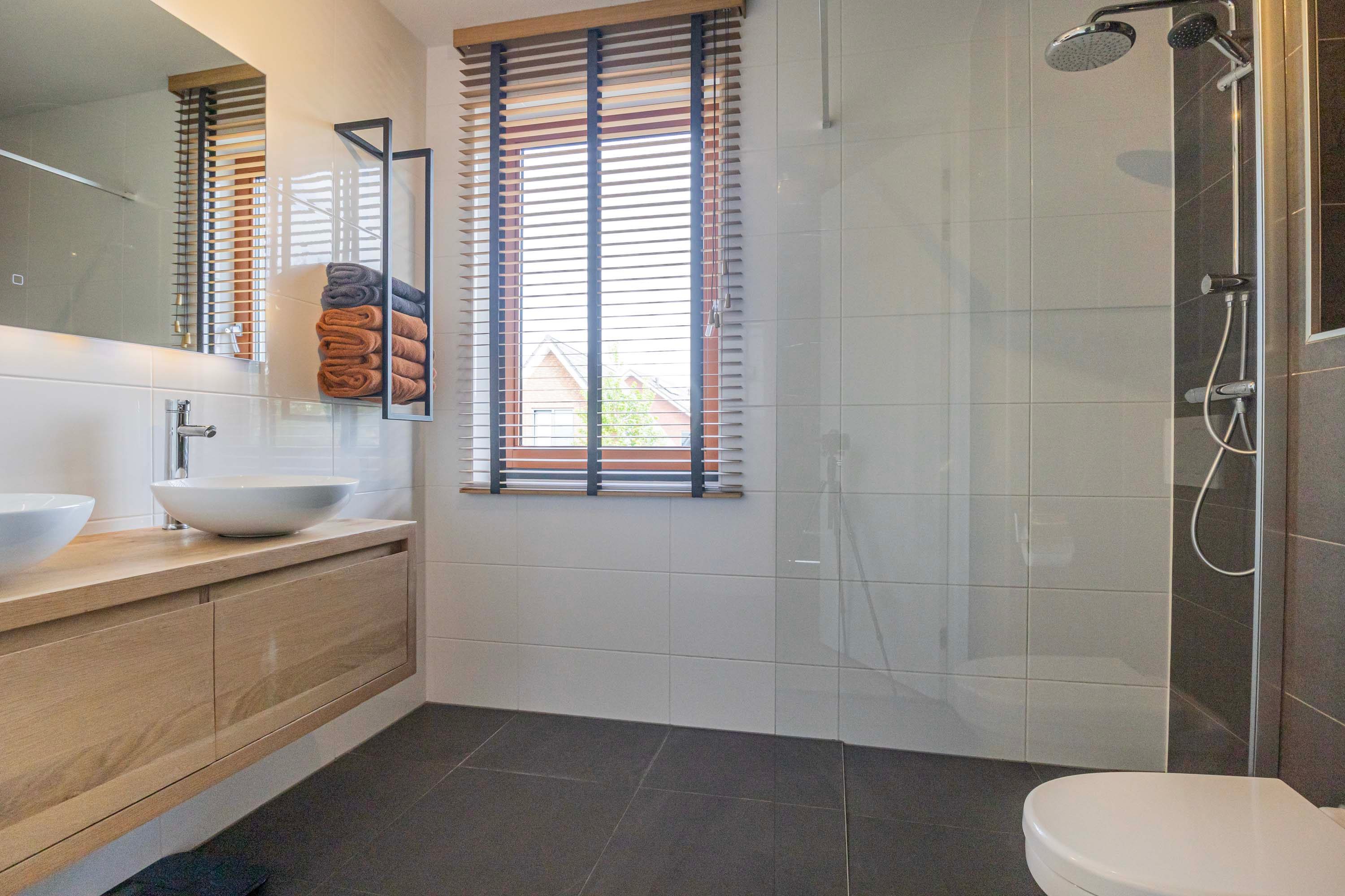 Op de eerste verdieping bevindt zich een overloop, drie slaapkamers en een moderne badkamer. Een ruime slaapkamer aan de voorzijde van circa 10 m², een kleinere slaapkamer aan de achterzijde van circa 7 m² en een royale ouderslaapkamer van circa 18 m² met grote ramen die zorgen voor veel daglicht. Deze slaapkamer is tevens voorzien van een inloopkast en airconditioning. De moderne badkamer beschikt over een inloopdouche, een toilet en een dubbele wastafel met eikenhouten meubel.