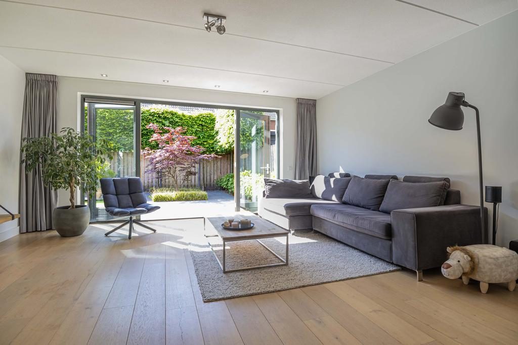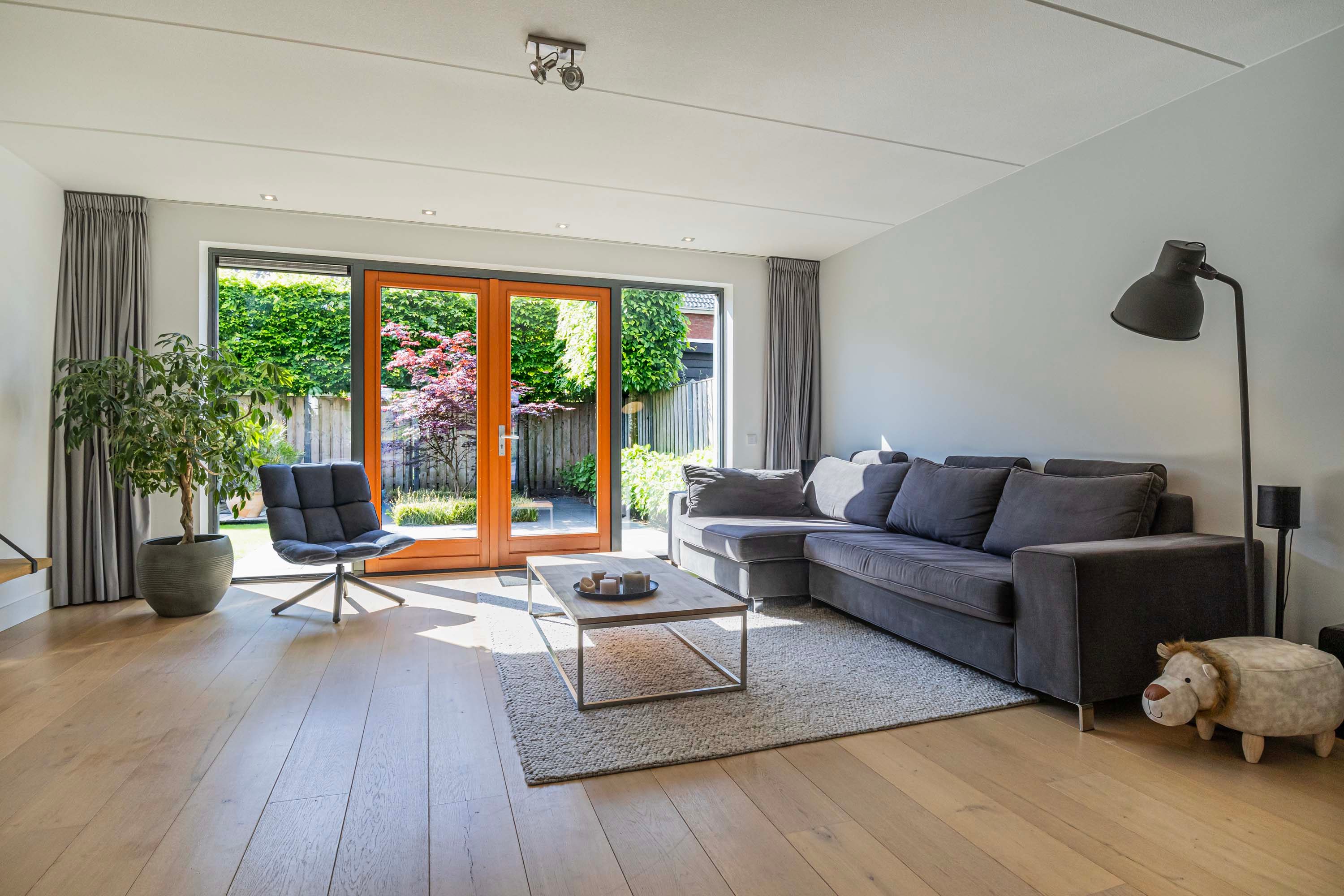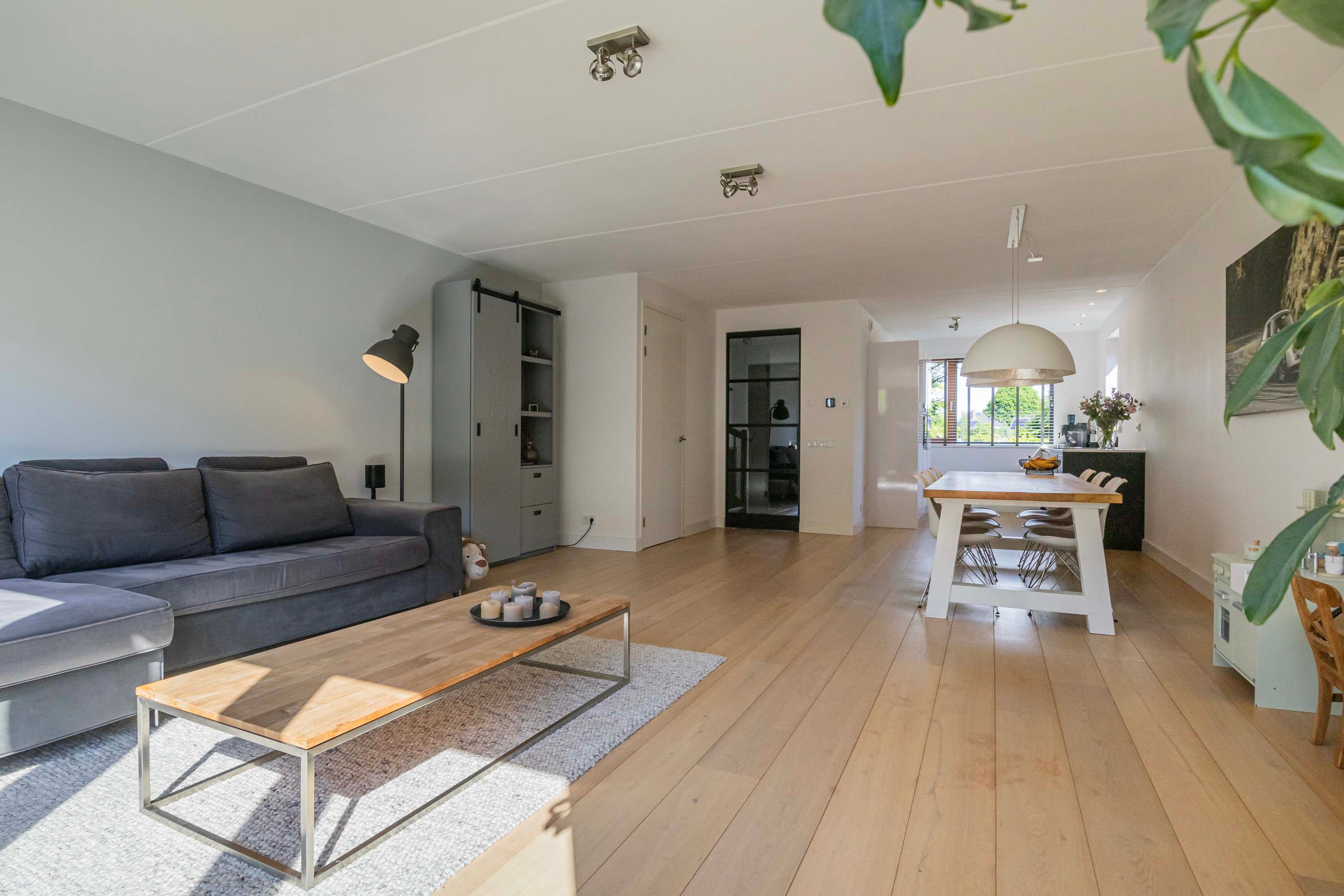 Bij binnenkomst tref je de entree met een luxe toilet voorzien van een fonteintje, een meterkast en de trapopgang naar de eerste verdieping. Via een moderne stalen deur kom je in de riante en lichte woonkamer met een oppervlakte van circa 41 m². Aan de achterzijde bij het zitgedeelte van de woning zijn er openslaande deuren naar de ruime tuin. In de woonkamer bevindt zich een handige trapkast, perfect te gebruiken als voorraadruimte.