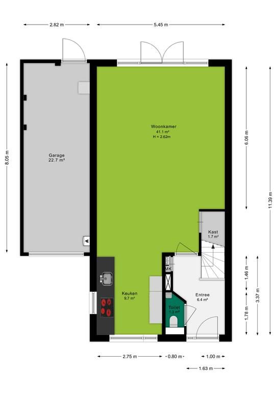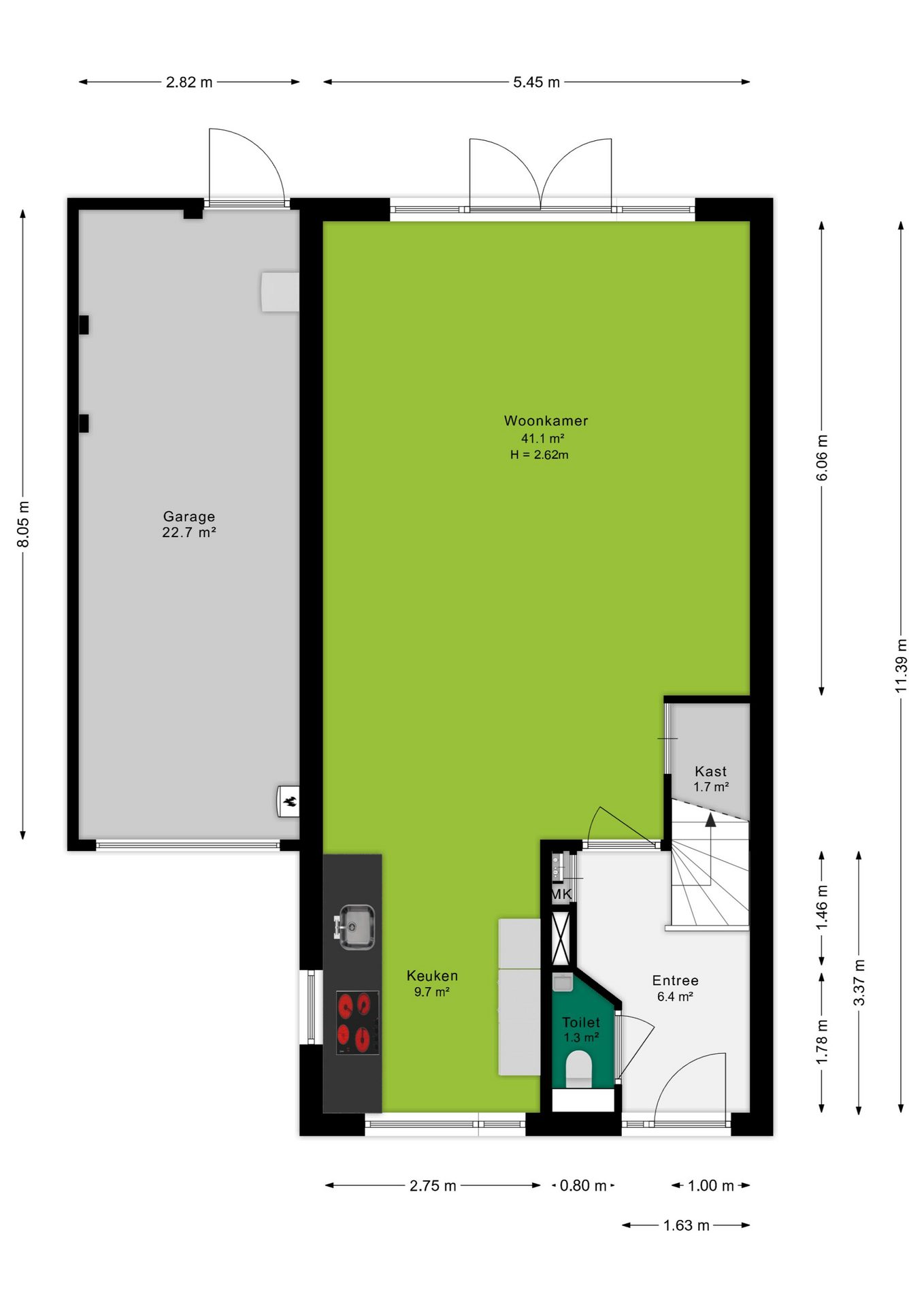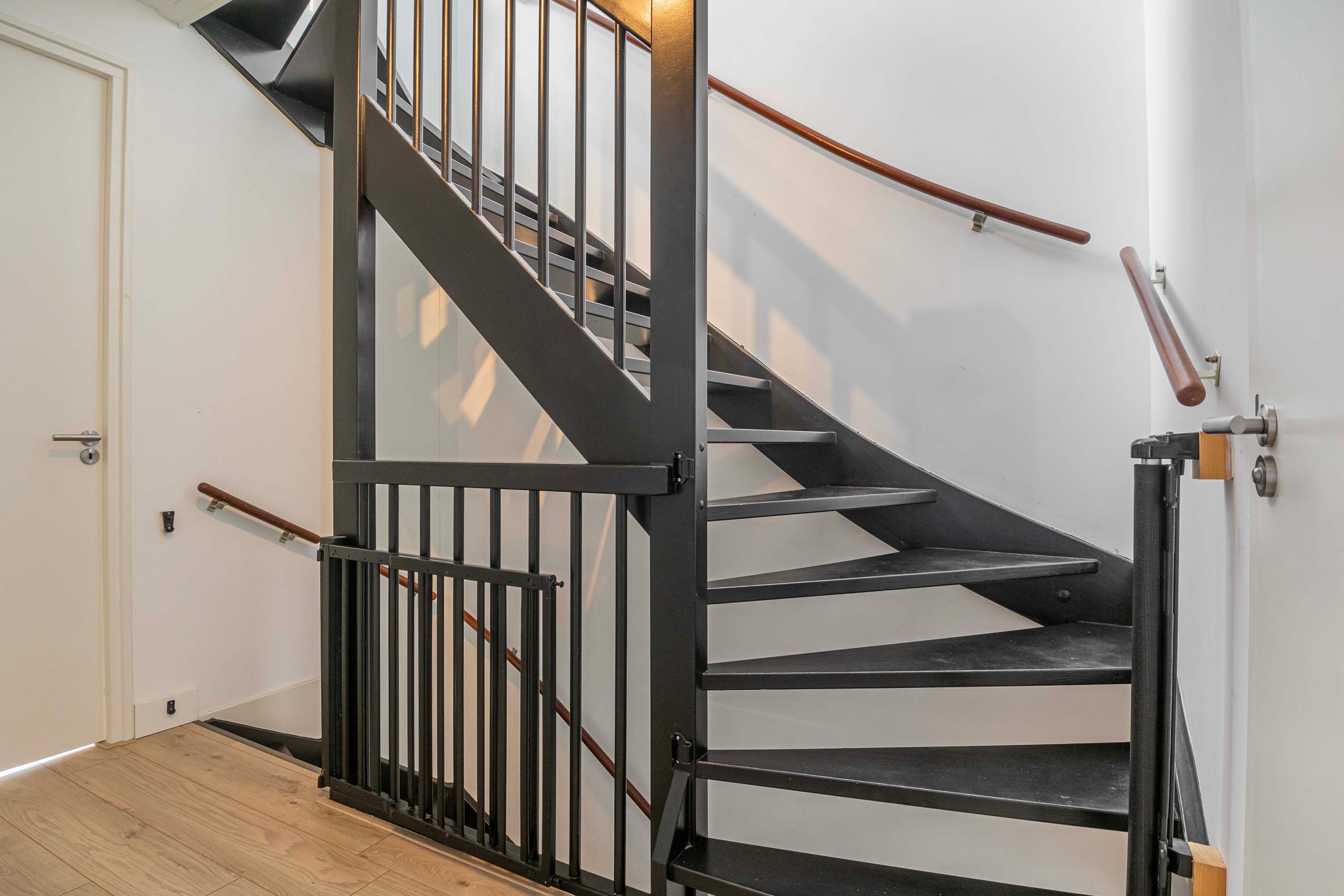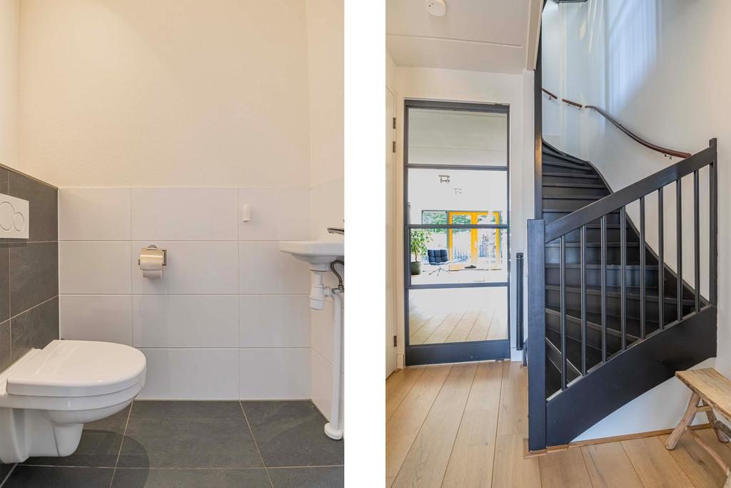 Bij binnenkomst tref je de entree met een luxe toilet voorzien van een fonteintje, een meterkast en de trapopgang naar de eerste verdieping. Via een moderne stalen deur kom je in de riante en lichte woonkamer met een oppervlakte van circa 41 m². Aan de achterzijde bij het zitgedeelte van de woning zijn er openslaande deuren naar de ruime tuin. In de woonkamer bevindt zich een handige trapkast, perfect te gebruiken als voorraadruimte.