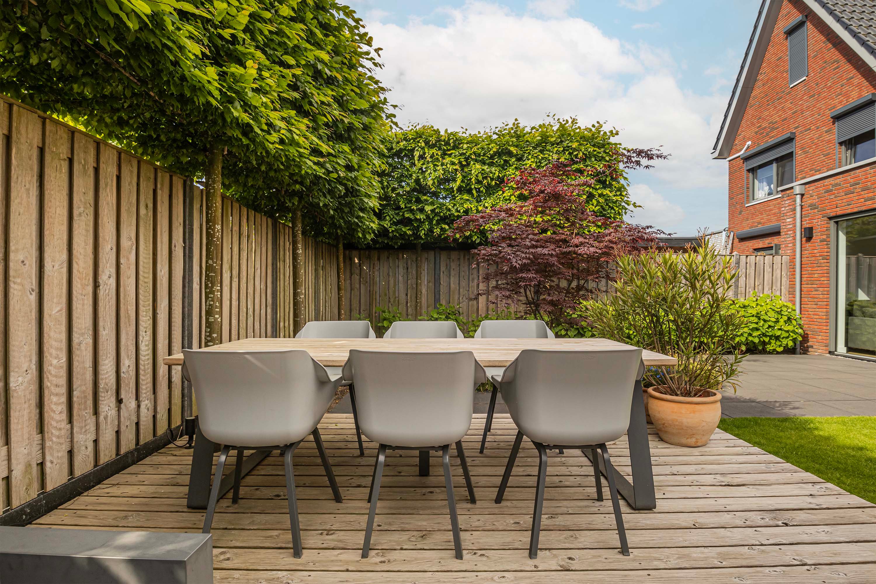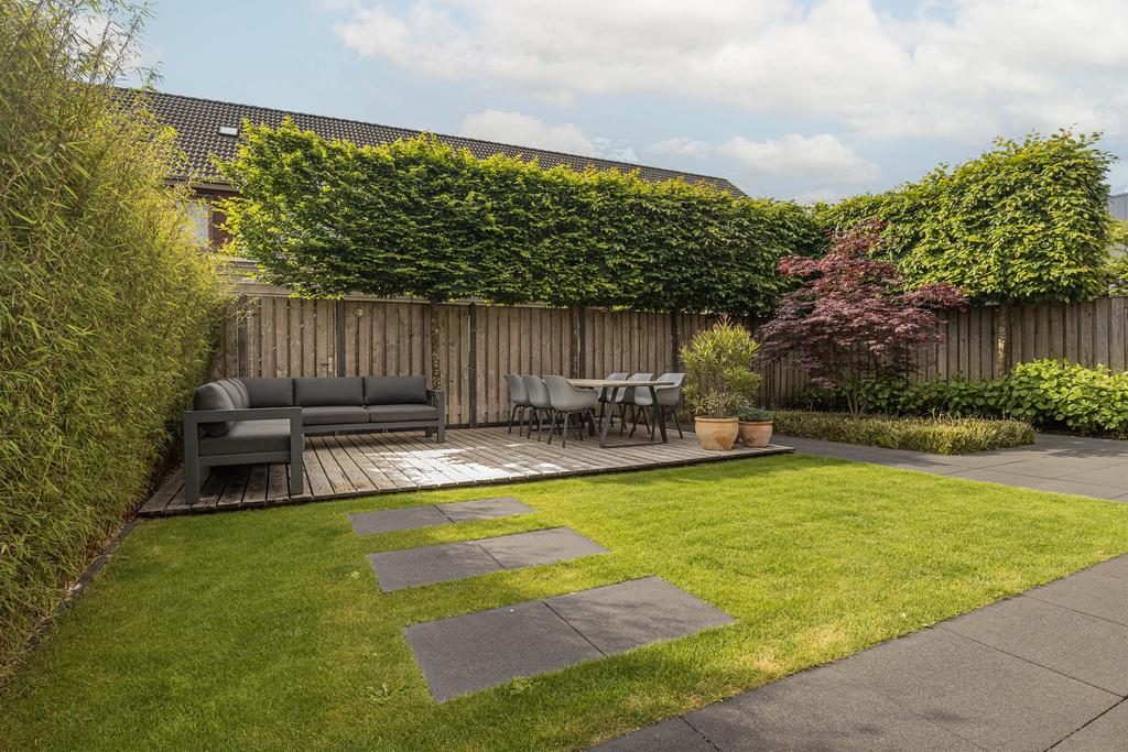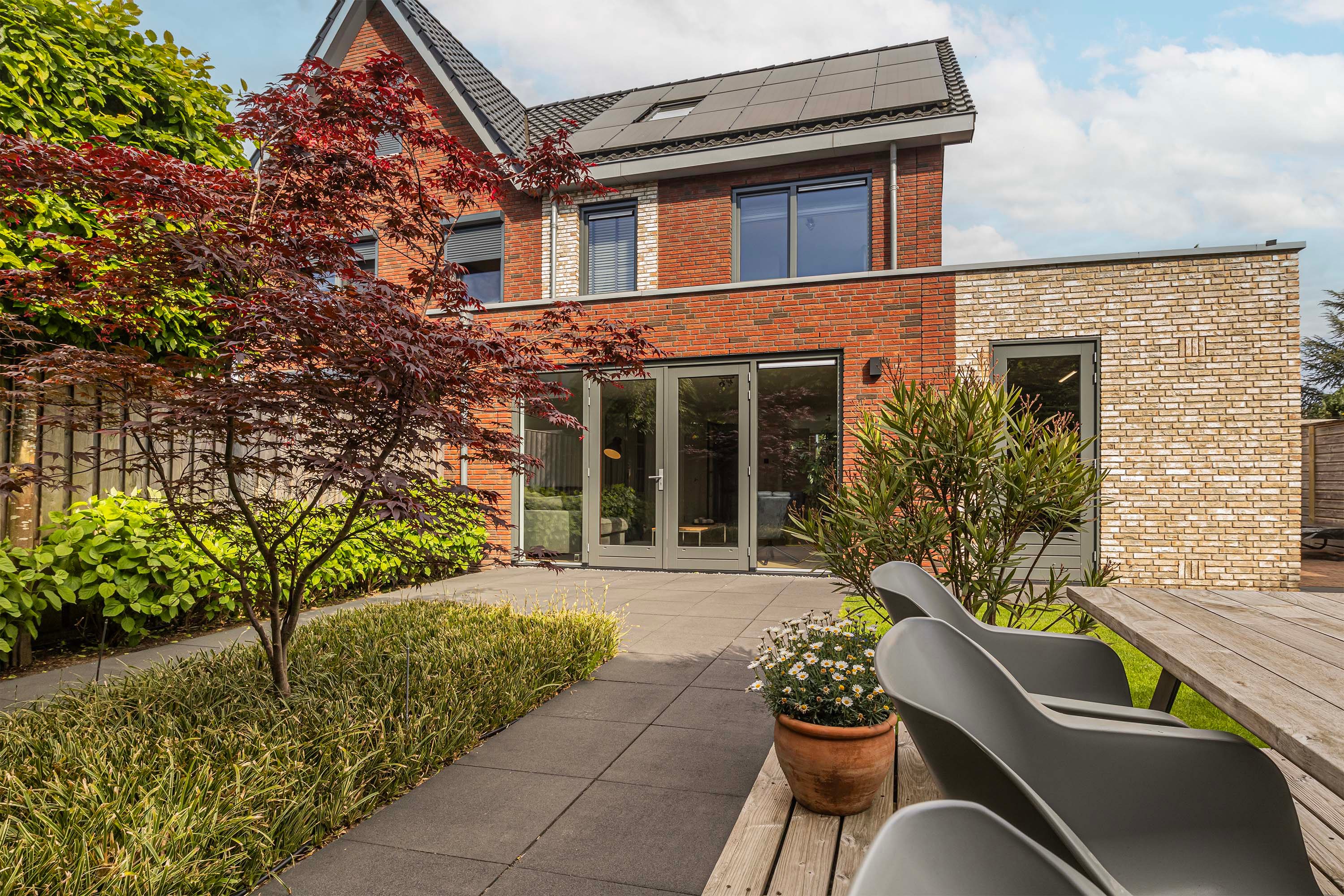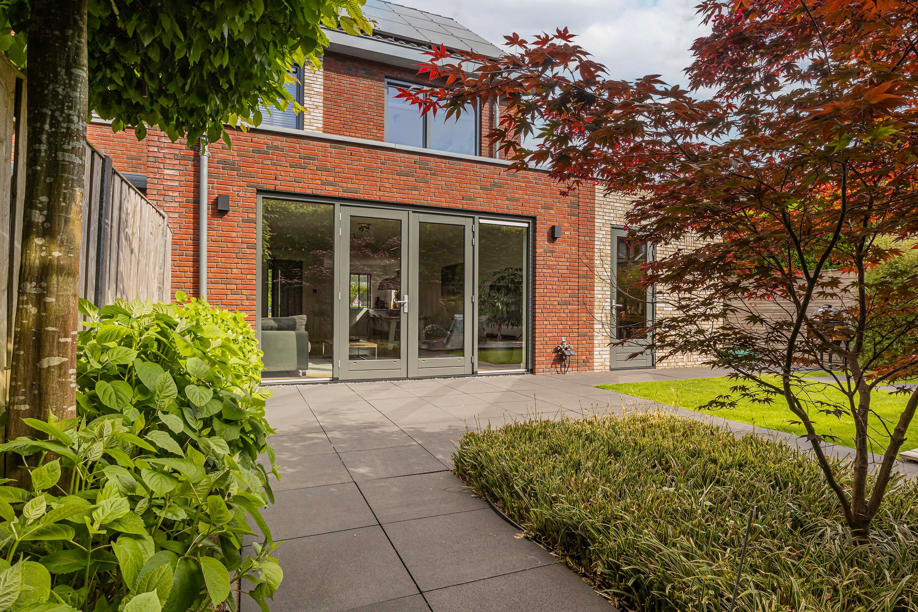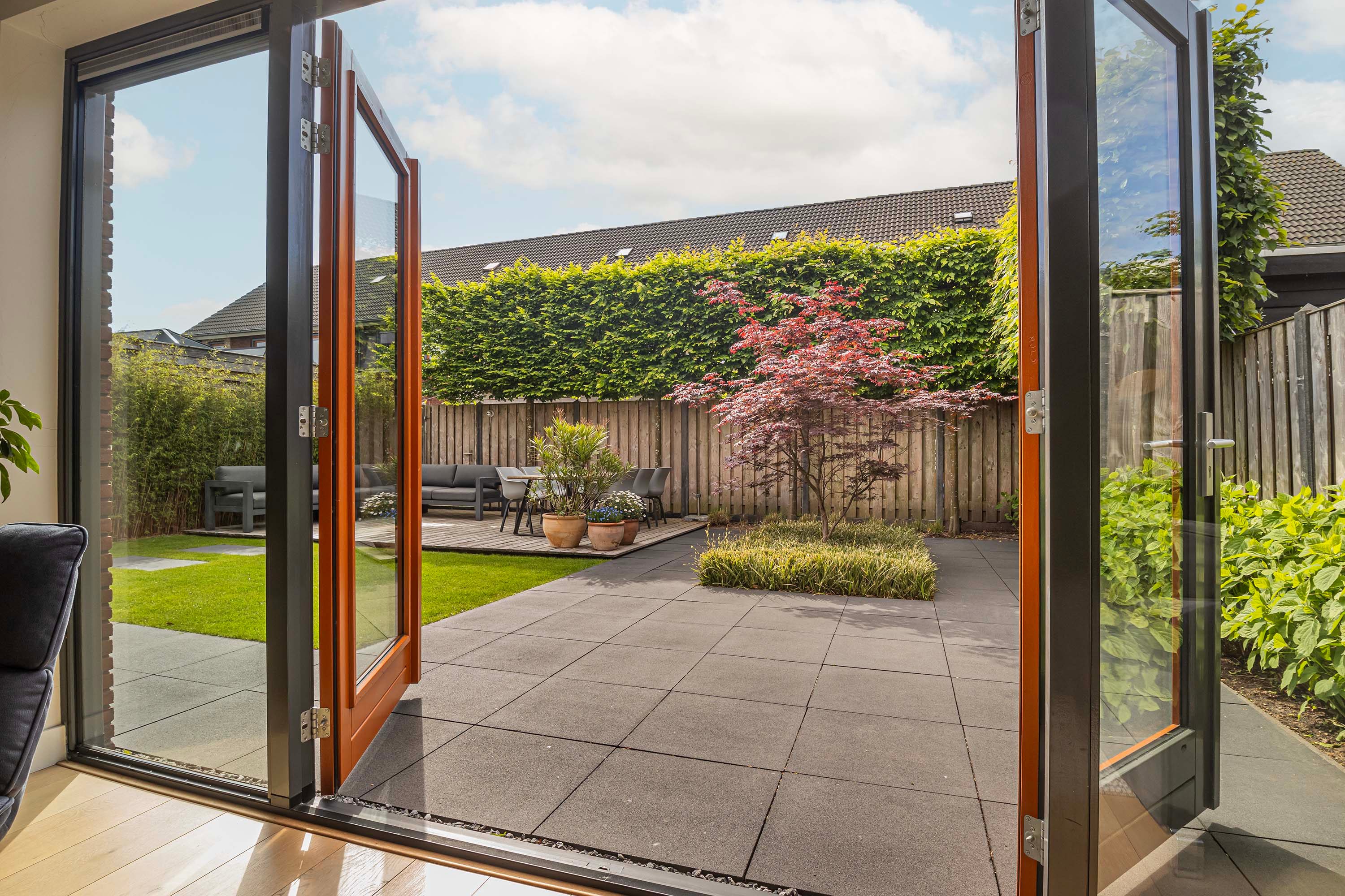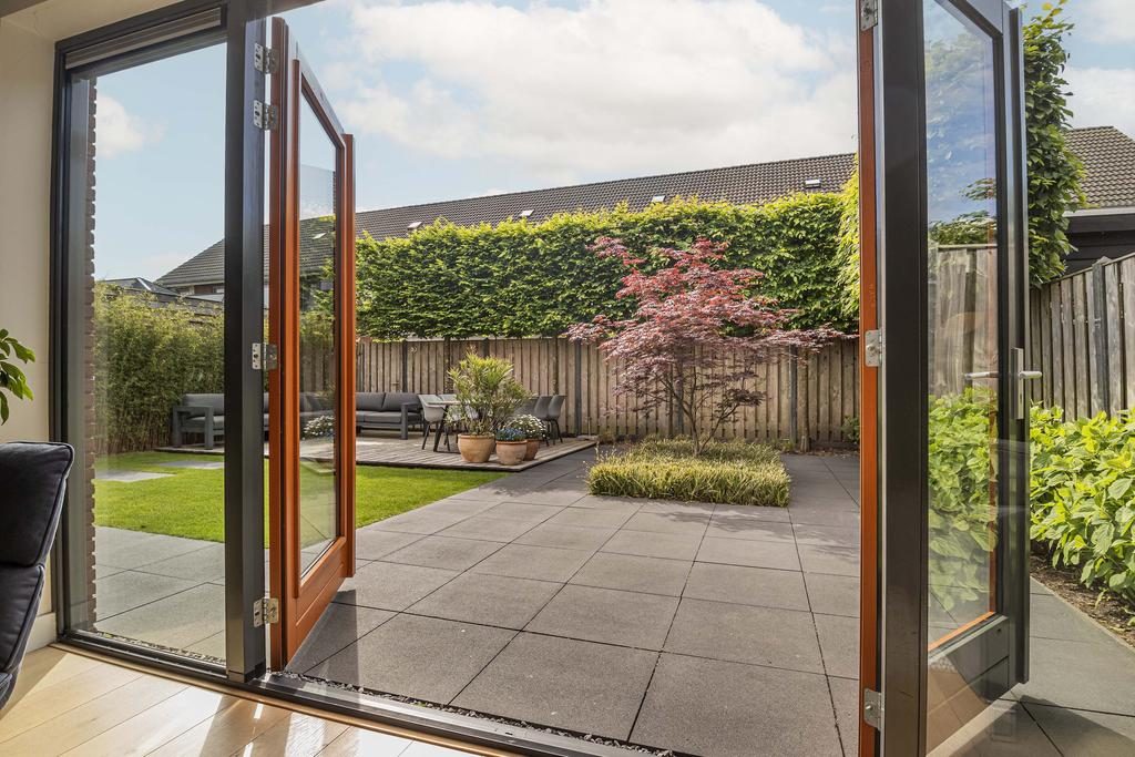 Via de openslaande deuren in de woonkamer kom je in de zonnige, onder architectuur aangelegde achtertuin, gelegen op het zuidoosten. De fraai aangelegde tuin beschikt over twee terrassen en is bereikbaar via achterom. De brede achtertuin is voorzien van voldoende zon- en schaduwplekken en beschikt over een beregeningssysteem.