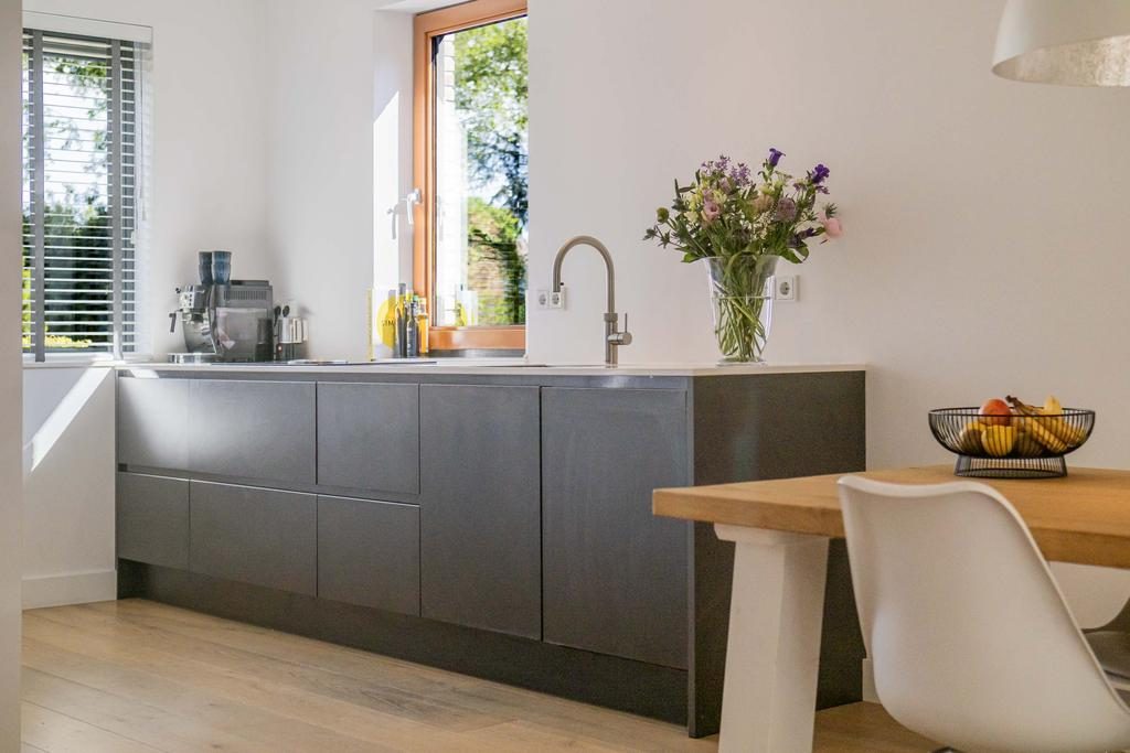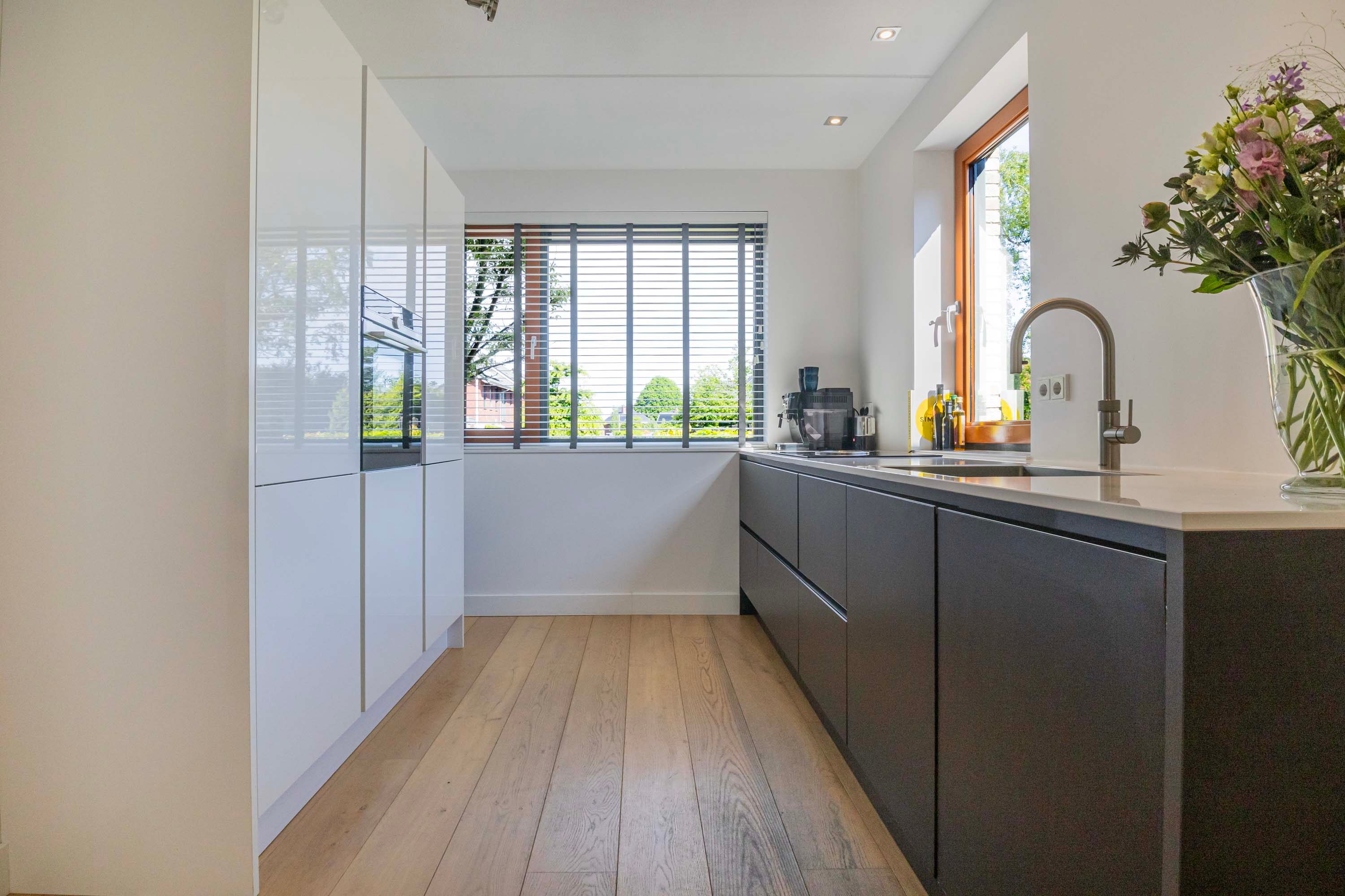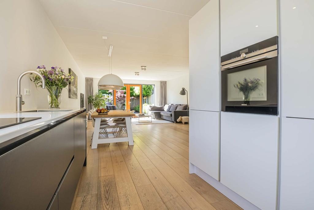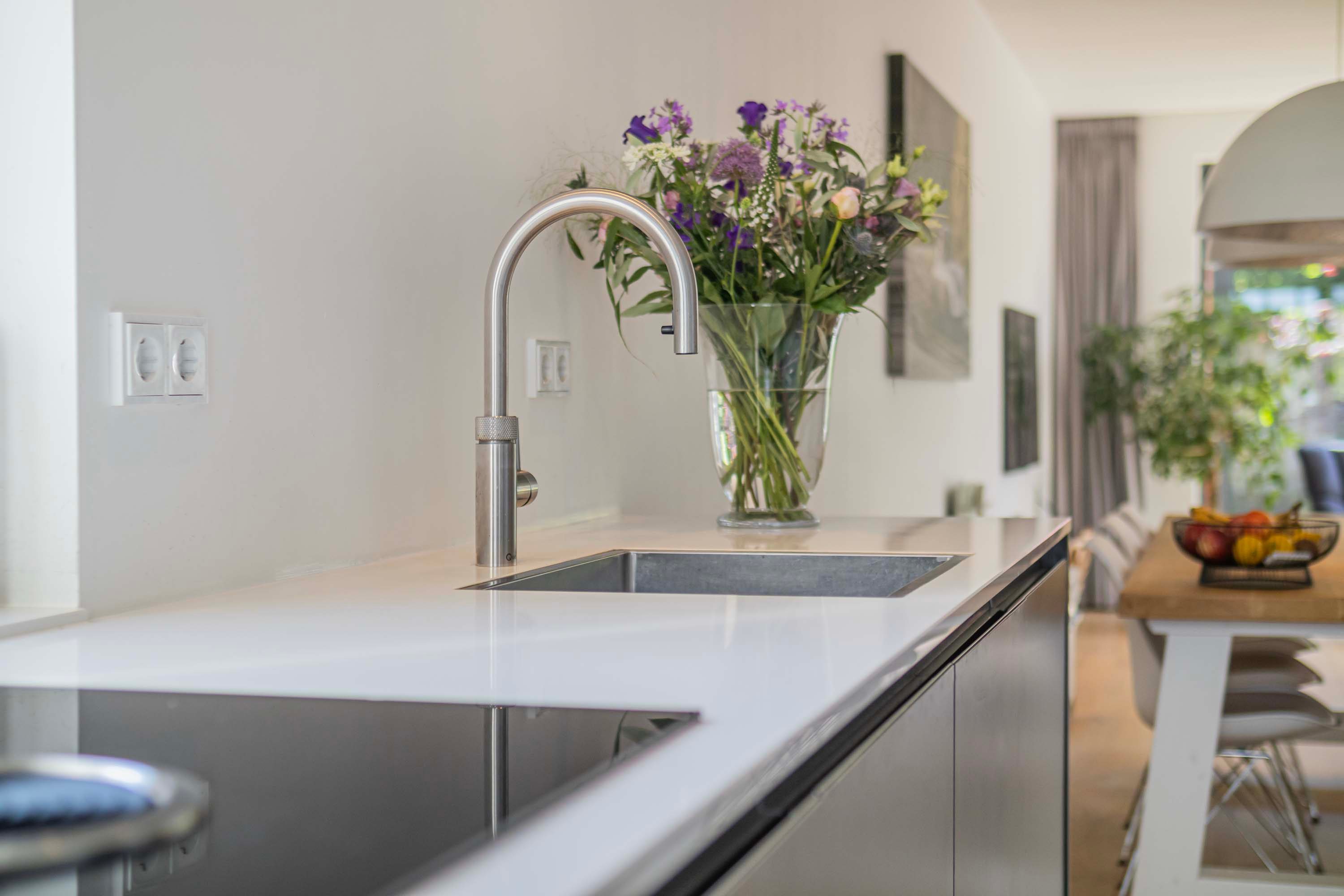 De open keuken is stijlvol ingericht en is voorzien van diverse hoogwaardige inbouwapparatuur, waaronder een inductiekookplaat met geïntegreerde afzuiging, een Quooker, een vaatwasser, een combi-oven en een koelvries-combinatie.