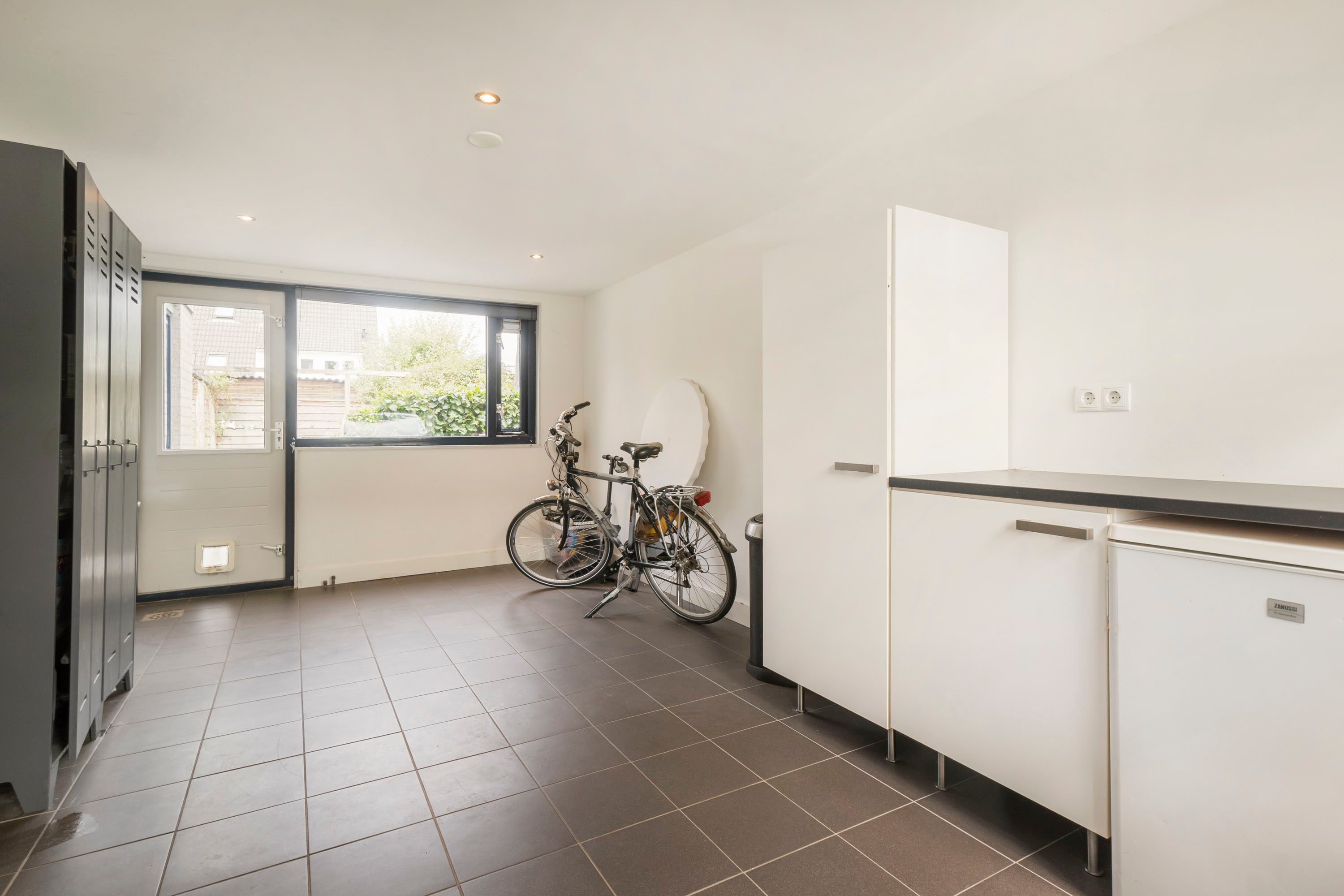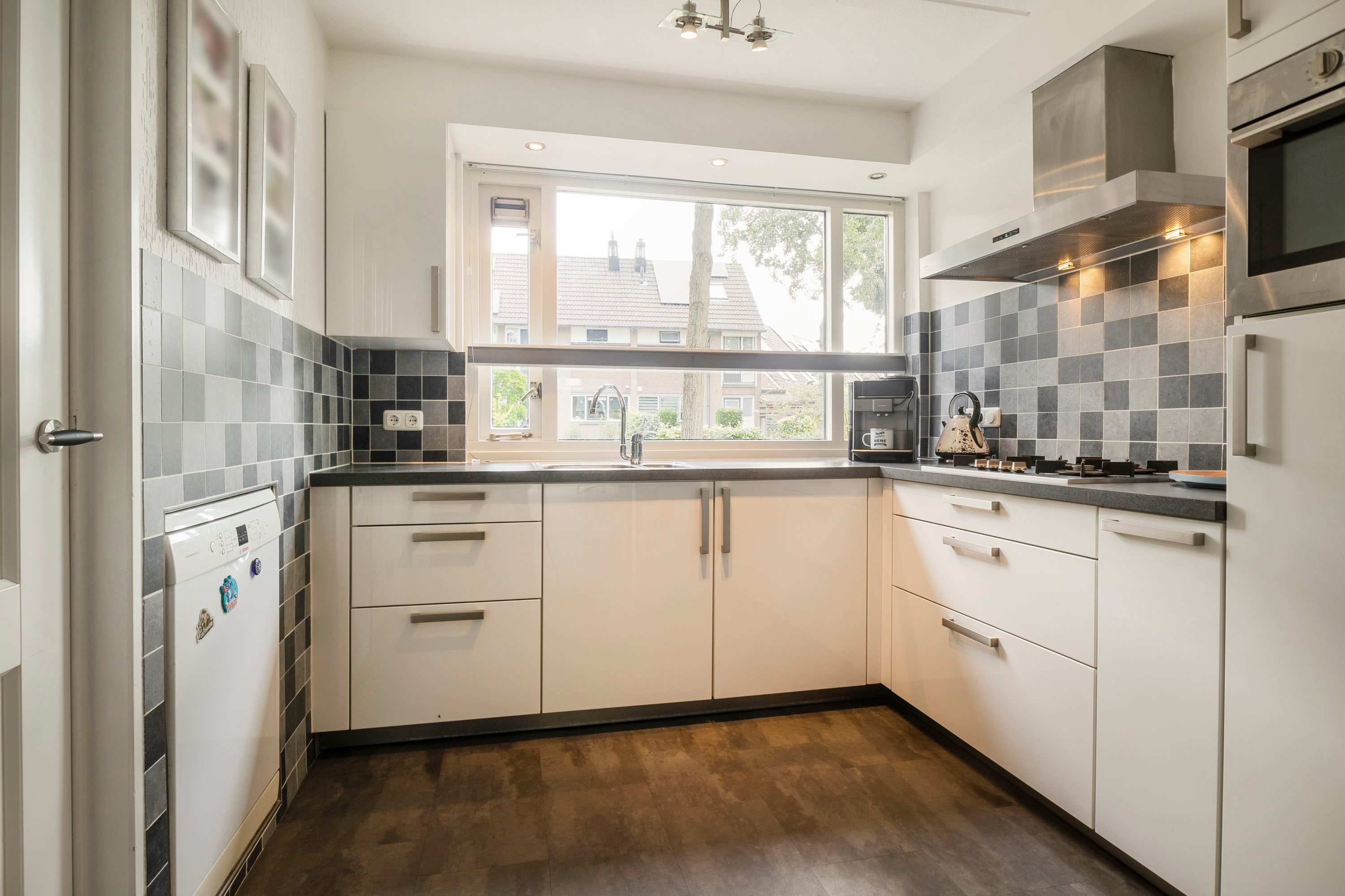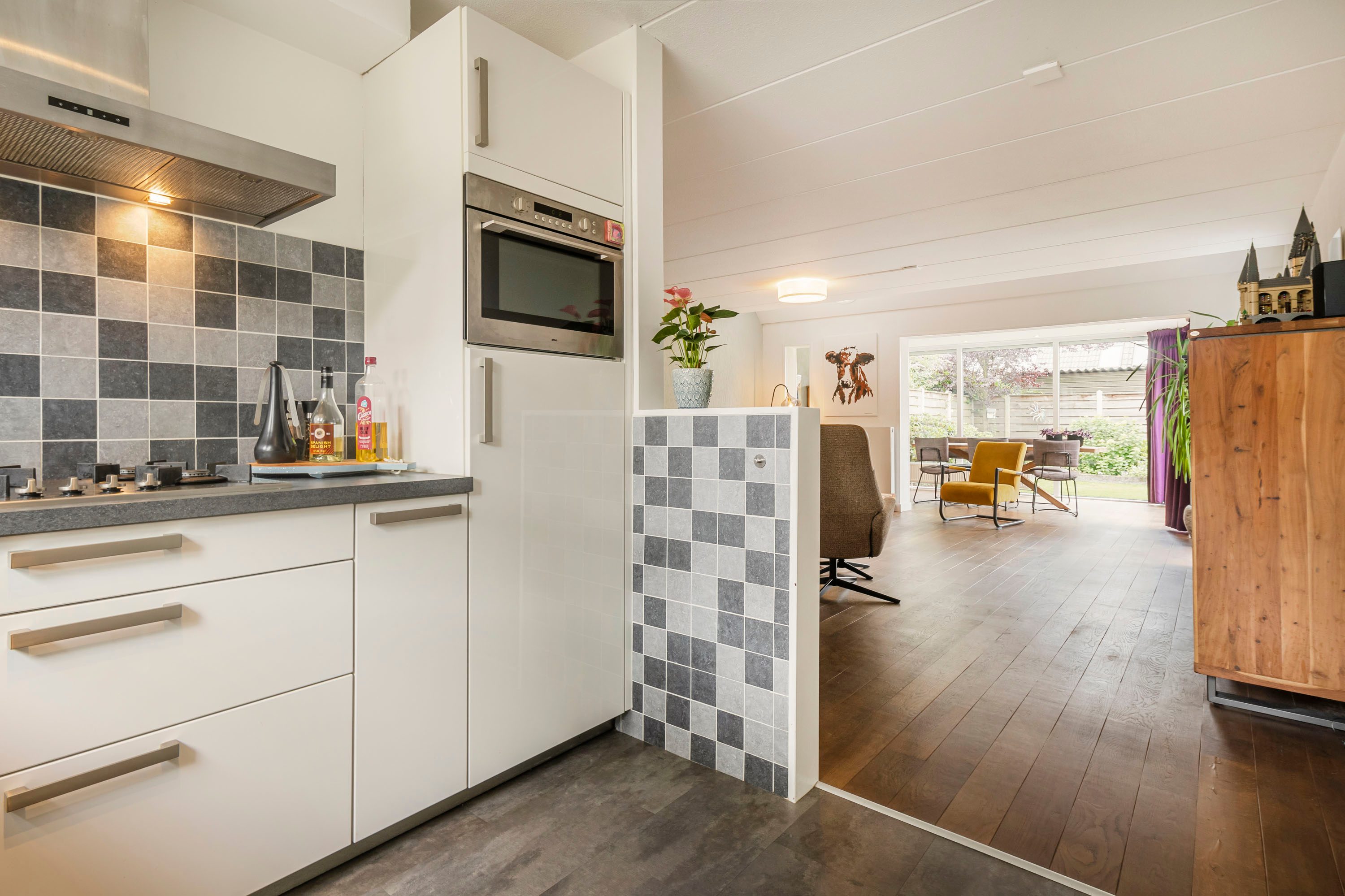 De keuken ligt aan de voorkant van de woning en is voorzien van moderne apparatuur, waaronder een gasfornuis, afzuigkap, combi-oven, koelkast en vaatwasser. Vanuit de keuken kijk je uit op de voortuin, waardoor het een fijne, lichte ruimte is. De keuken biedt toegang tot de ruime bijkeuken, die oorspronkelijk dienstdeed als garage. Deze multifunctionele ruimte biedt talloze mogelijkheden, zoals het inrichten van een praktijk aan huis of het creëren van een comfortabele thuiswerkplek.
