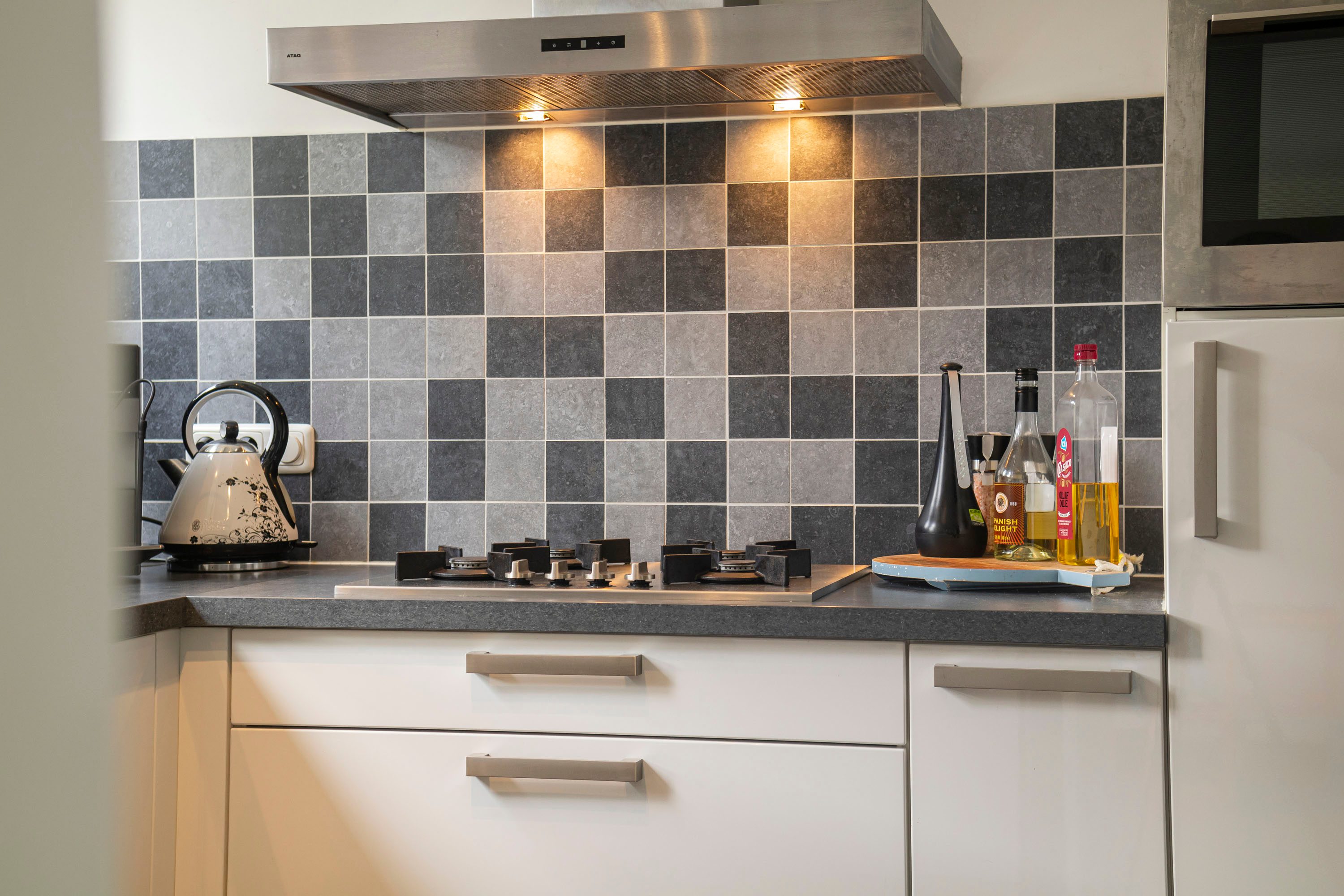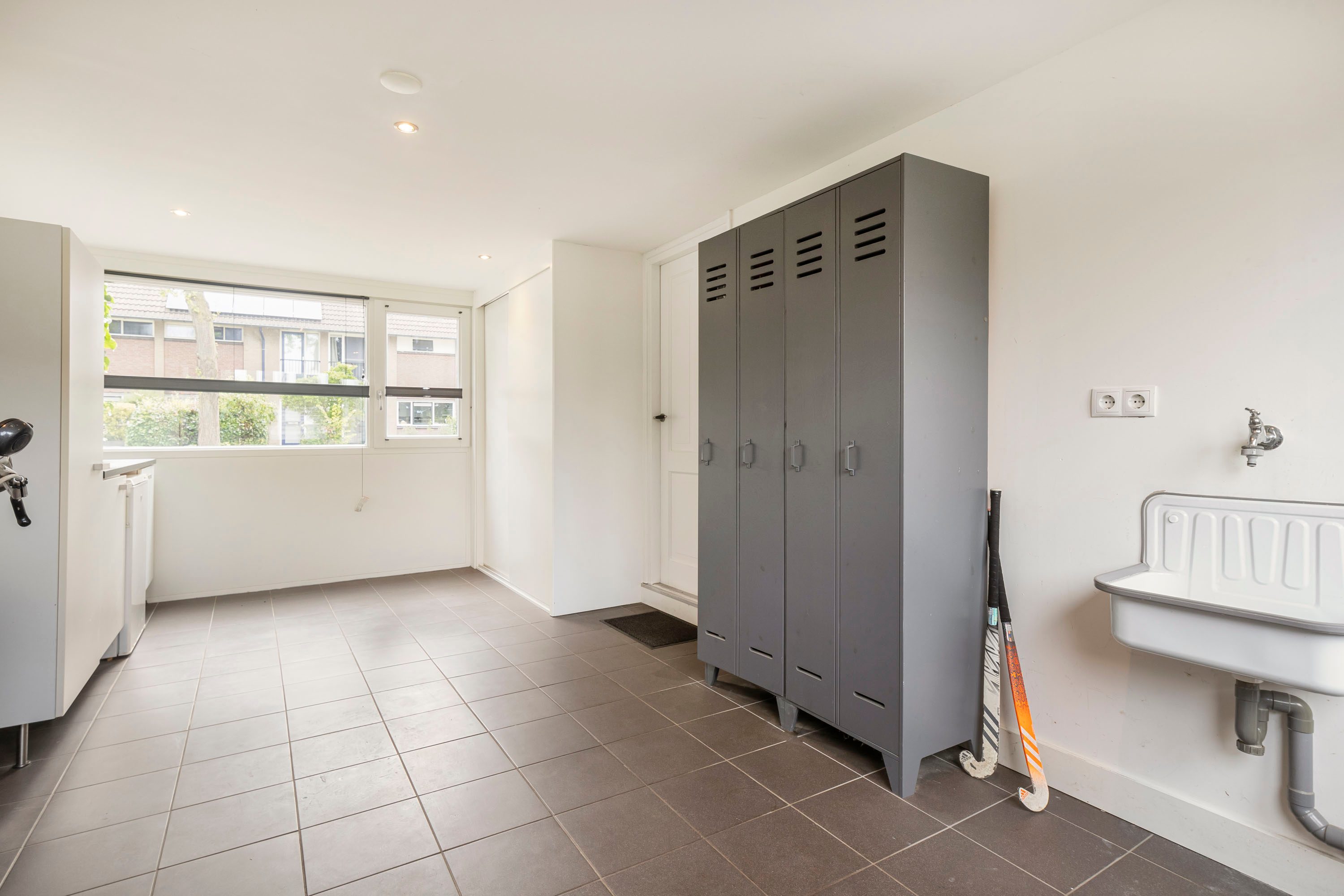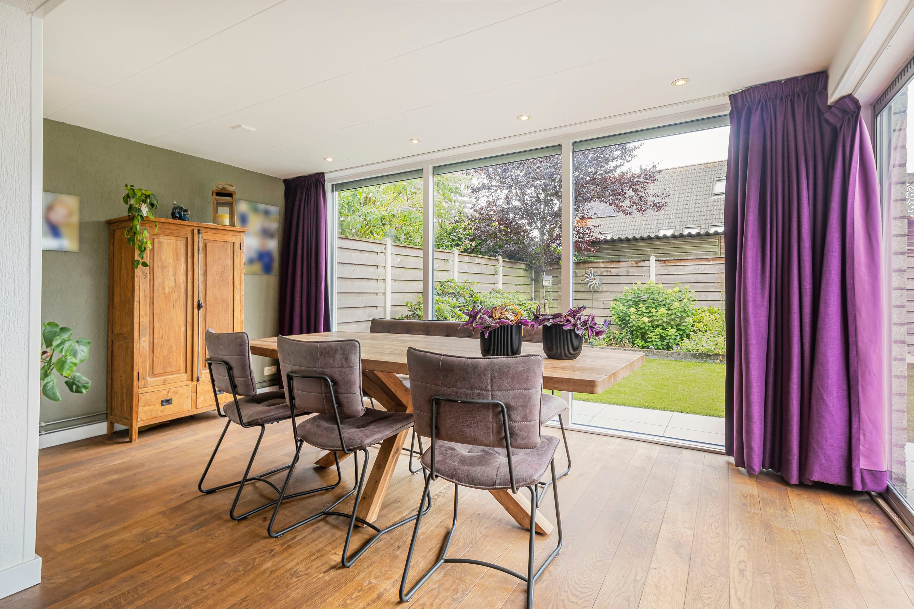De keuken ligt aan de voorkant van de woning en is voorzien van moderne apparatuur, waaronder een gasfornuis, afzuigkap, combi-oven, koelkast en vaatwasser. Vanuit de keuken kijk je uit op de voortuin, waardoor het een fijne, lichte ruimte is. De keuken biedt toegang tot de ruime bijkeuken, die oorspronkelijk dienstdeed als garage. Deze multifunctionele ruimte biedt talloze mogelijkheden, zoals het inrichten van een praktijk aan huis of het creëren van een comfortabele thuiswerkplek.