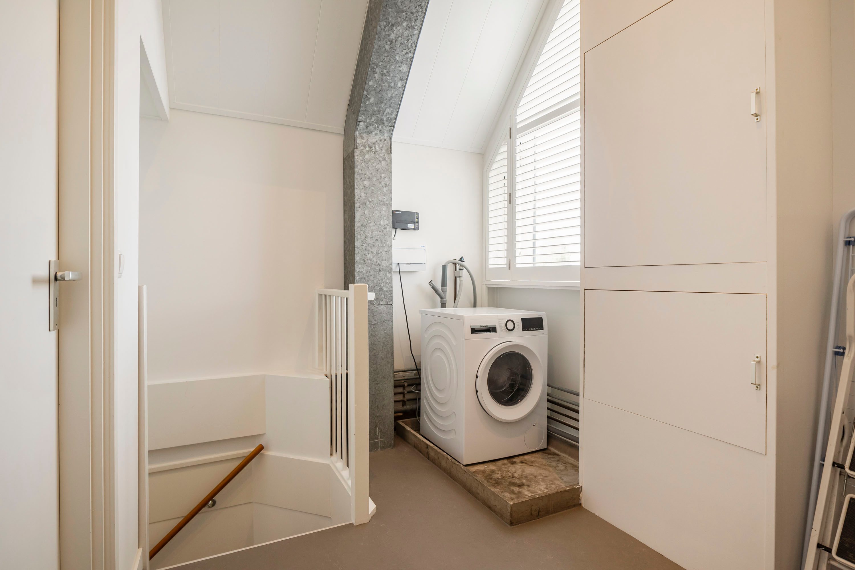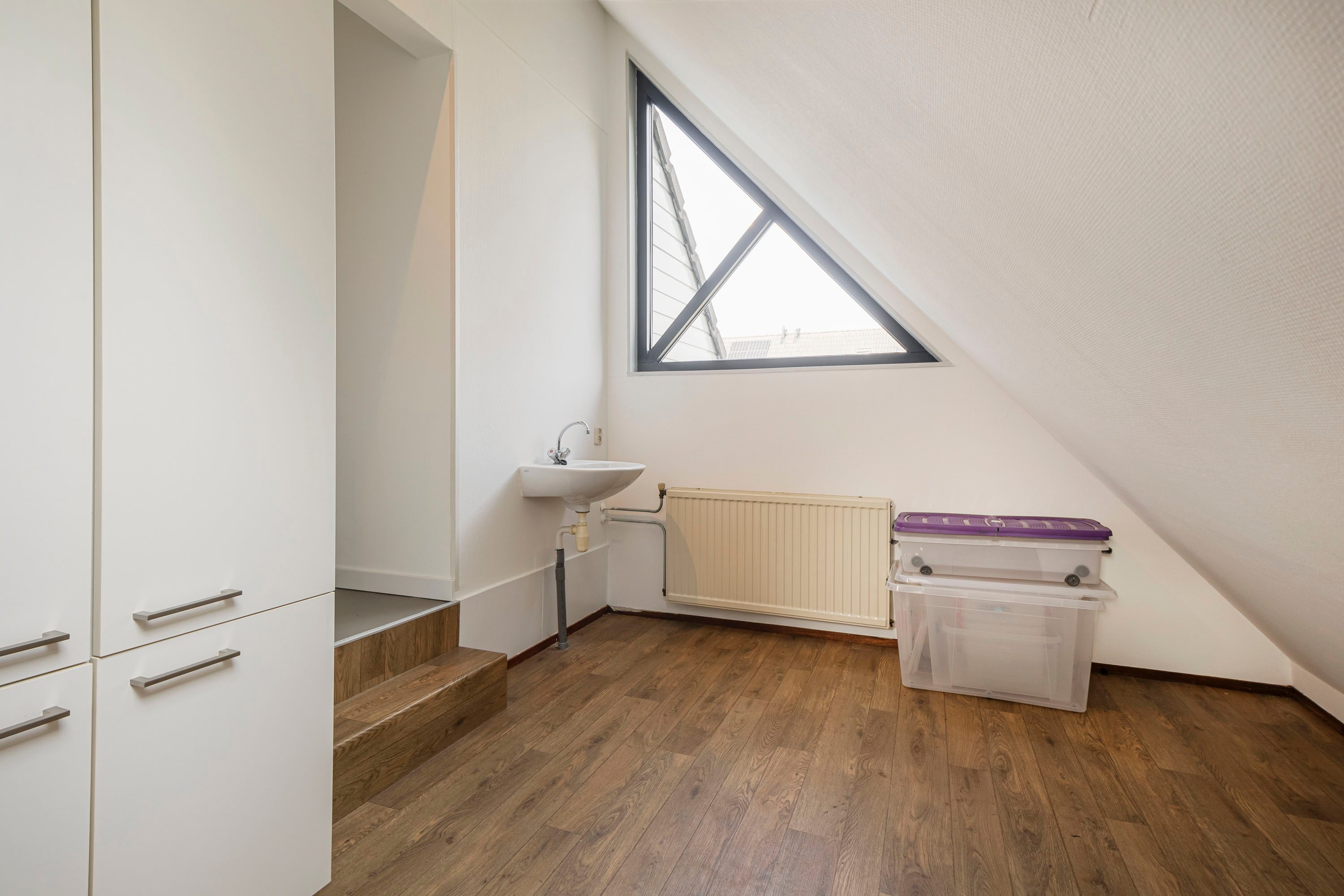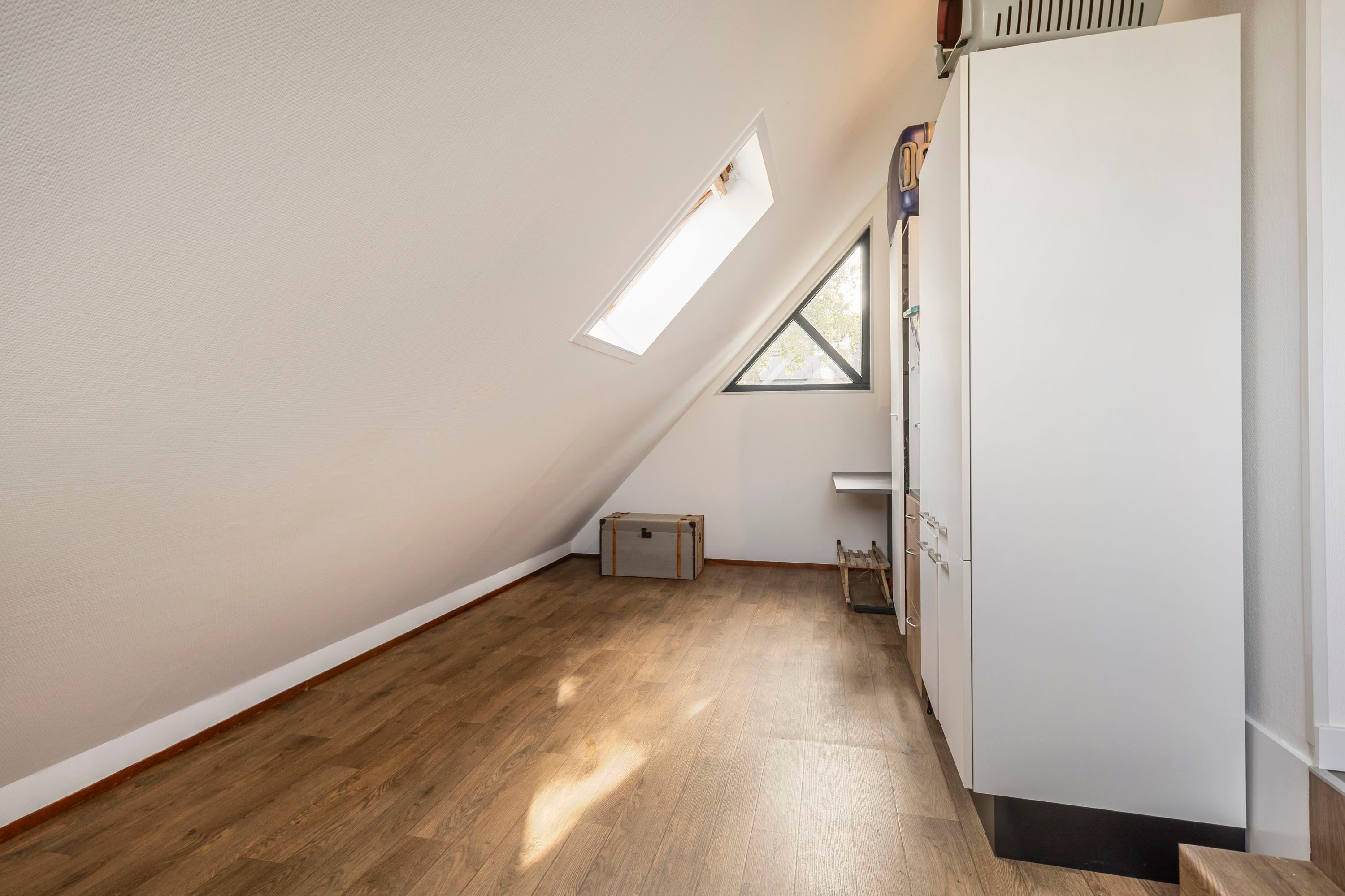 De tweede verdieping is te bereiken via een vaste trap. Hier bevinden zich de aansluiting voor de wasmachine en een vierde, ruime slaapkamer van 18 m². Deze kamer is voorzien van een dakkapel wat een lichte en prettige sfeer creëert, en biedt voldoende ruimte voor bijvoorbeeld een werkhoek.