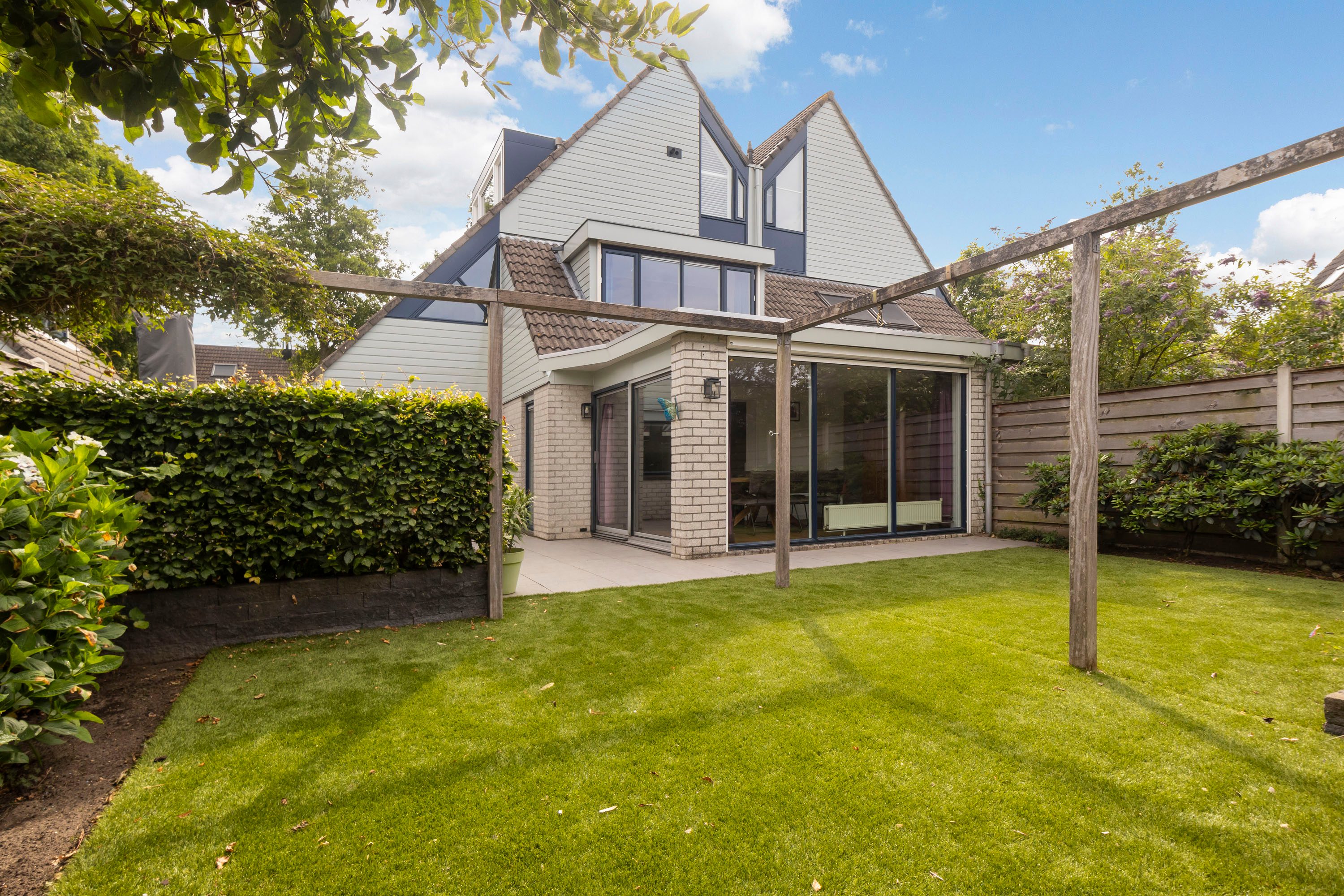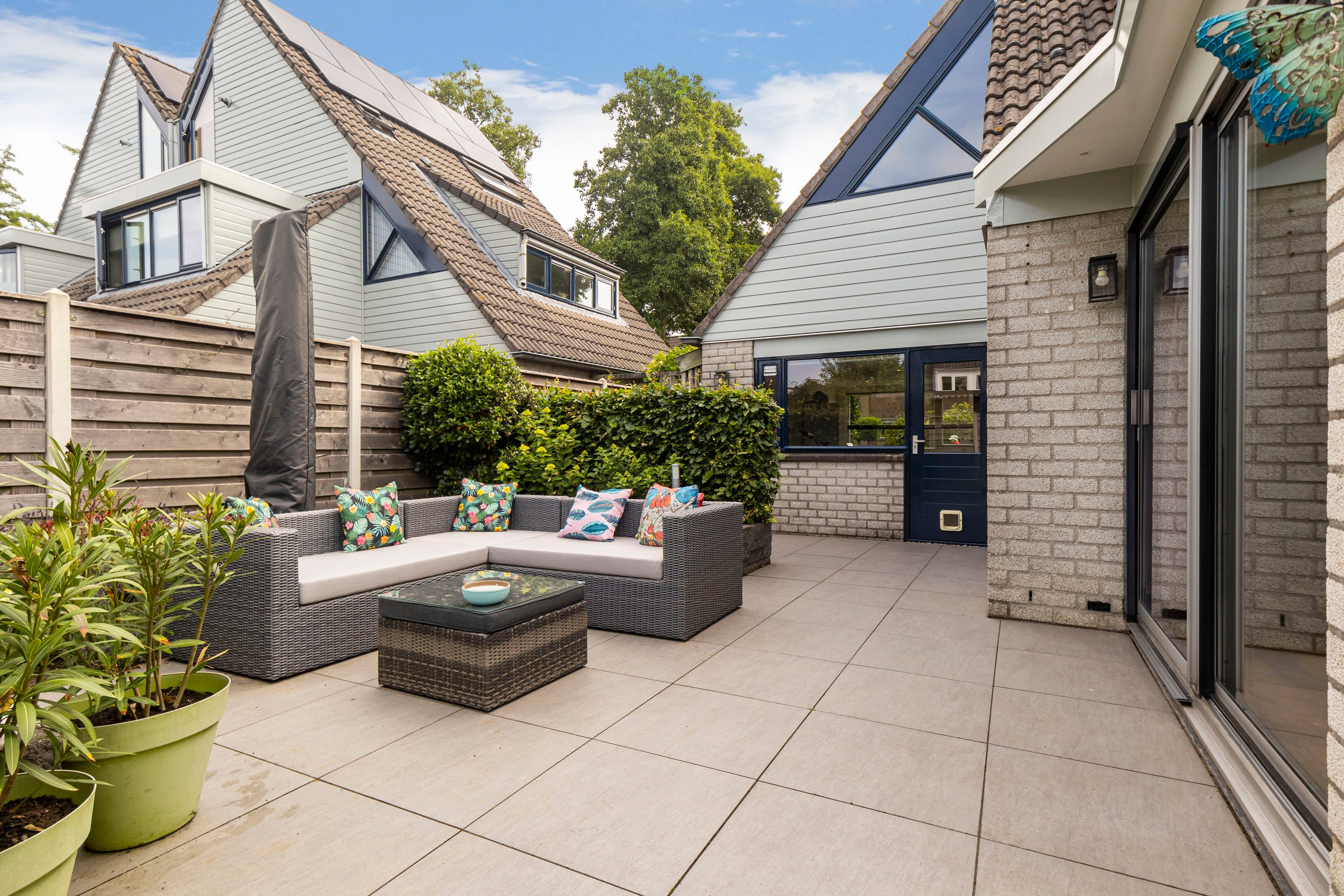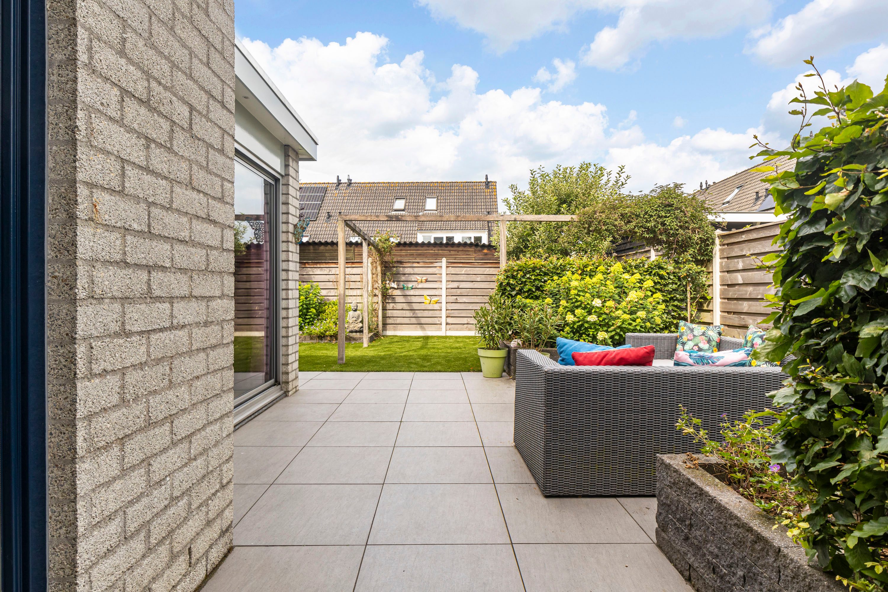 De achtertuin, bereikbaar via zowel de woonkamer als de bijkeuken en voorzien van een achterom, ligt op het westen. De tuin biedt volop ruimte voor een grote loungeset en heeft een grasveld waar kinderen fijn kunnen spelen. Door de gunstige ligging op het westen is het de perfecte plek om 's middags en 's avonds van de zon te genieten.