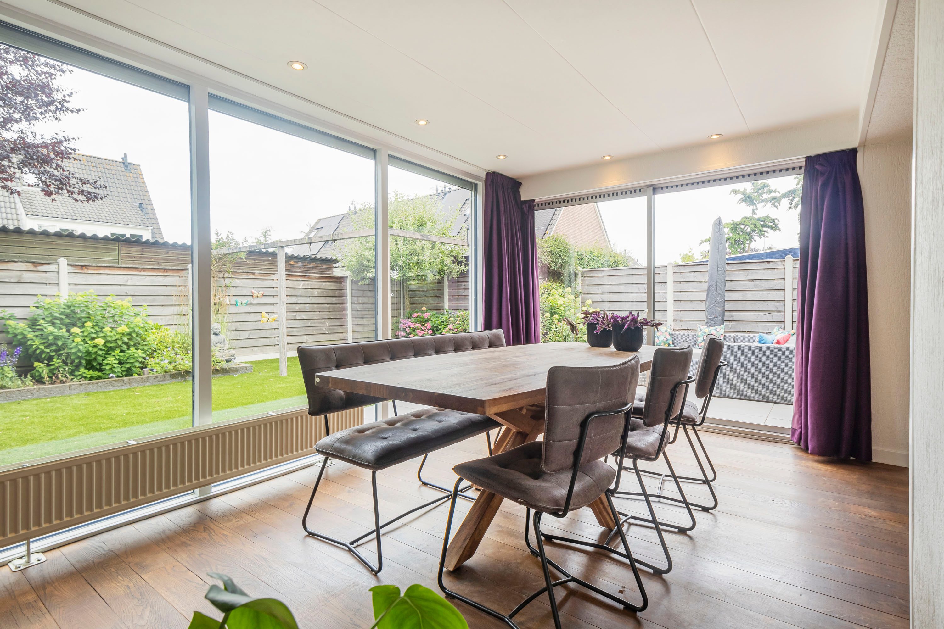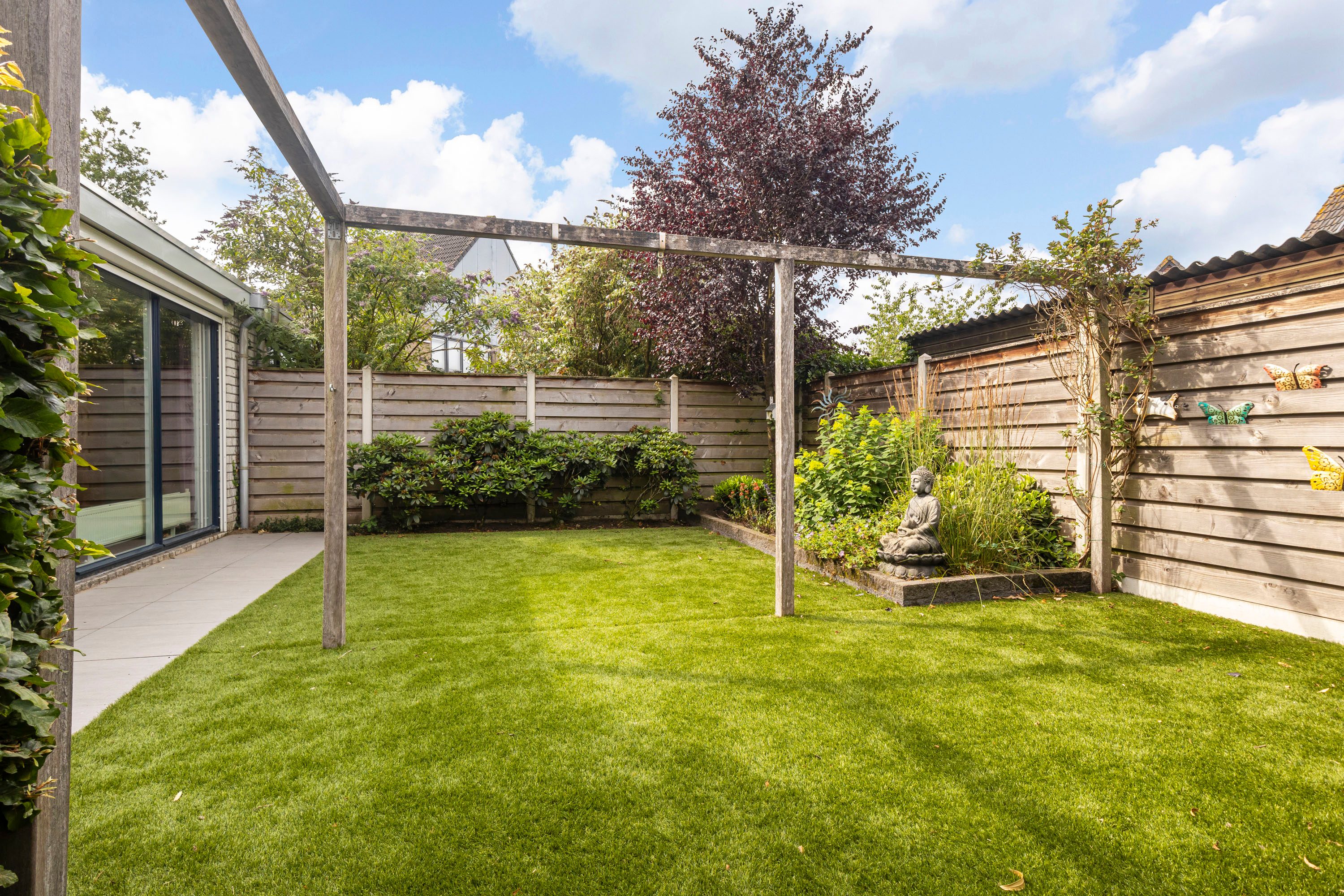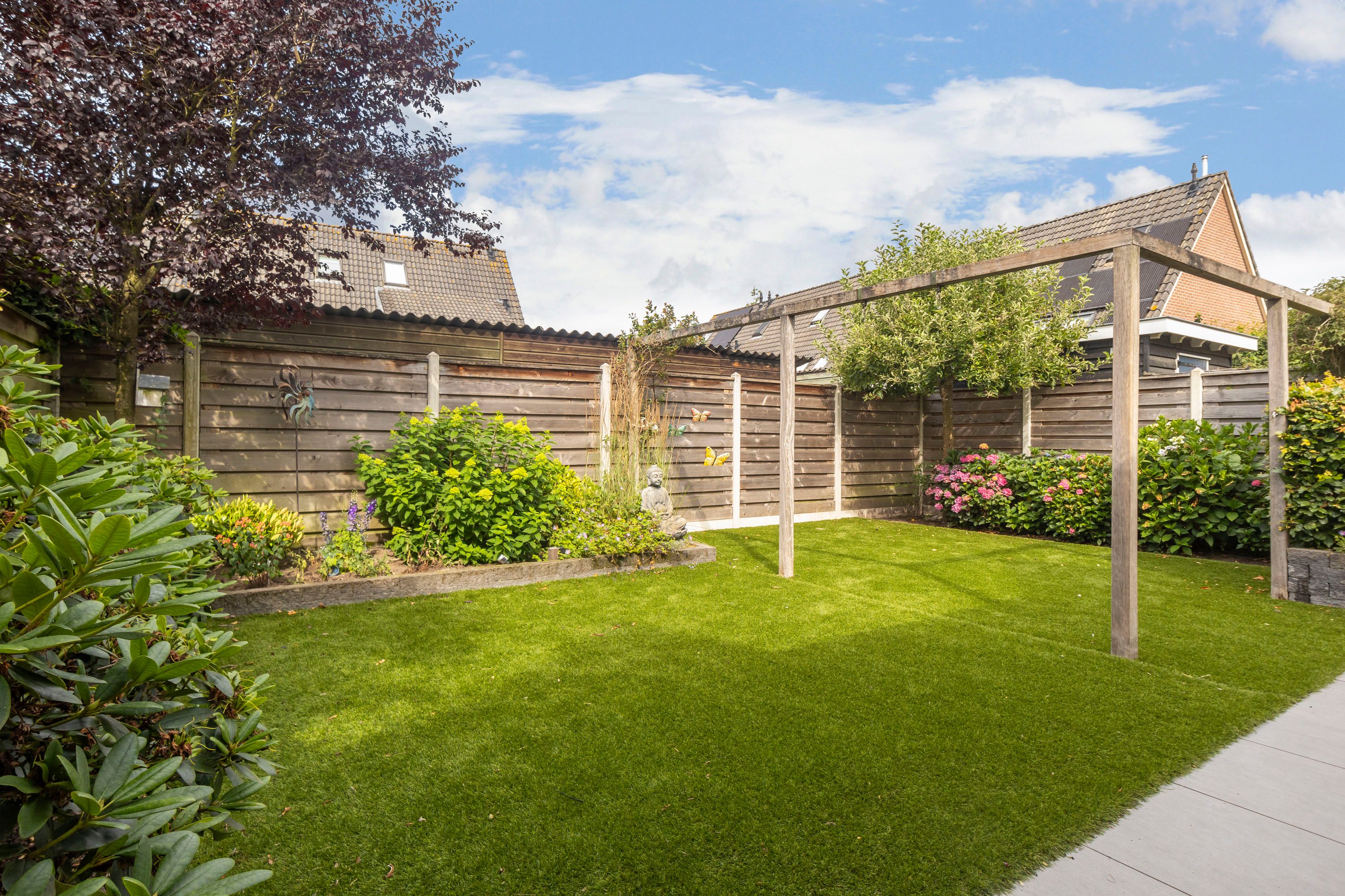 De achtertuin, bereikbaar via zowel de woonkamer als de bijkeuken en voorzien van een achterom, ligt op het westen. De tuin biedt volop ruimte voor een grote loungeset en heeft een grasveld waar kinderen fijn kunnen spelen. Door de gunstige ligging op het westen is het de perfecte plek om 's middags en 's avonds van de zon te genieten.