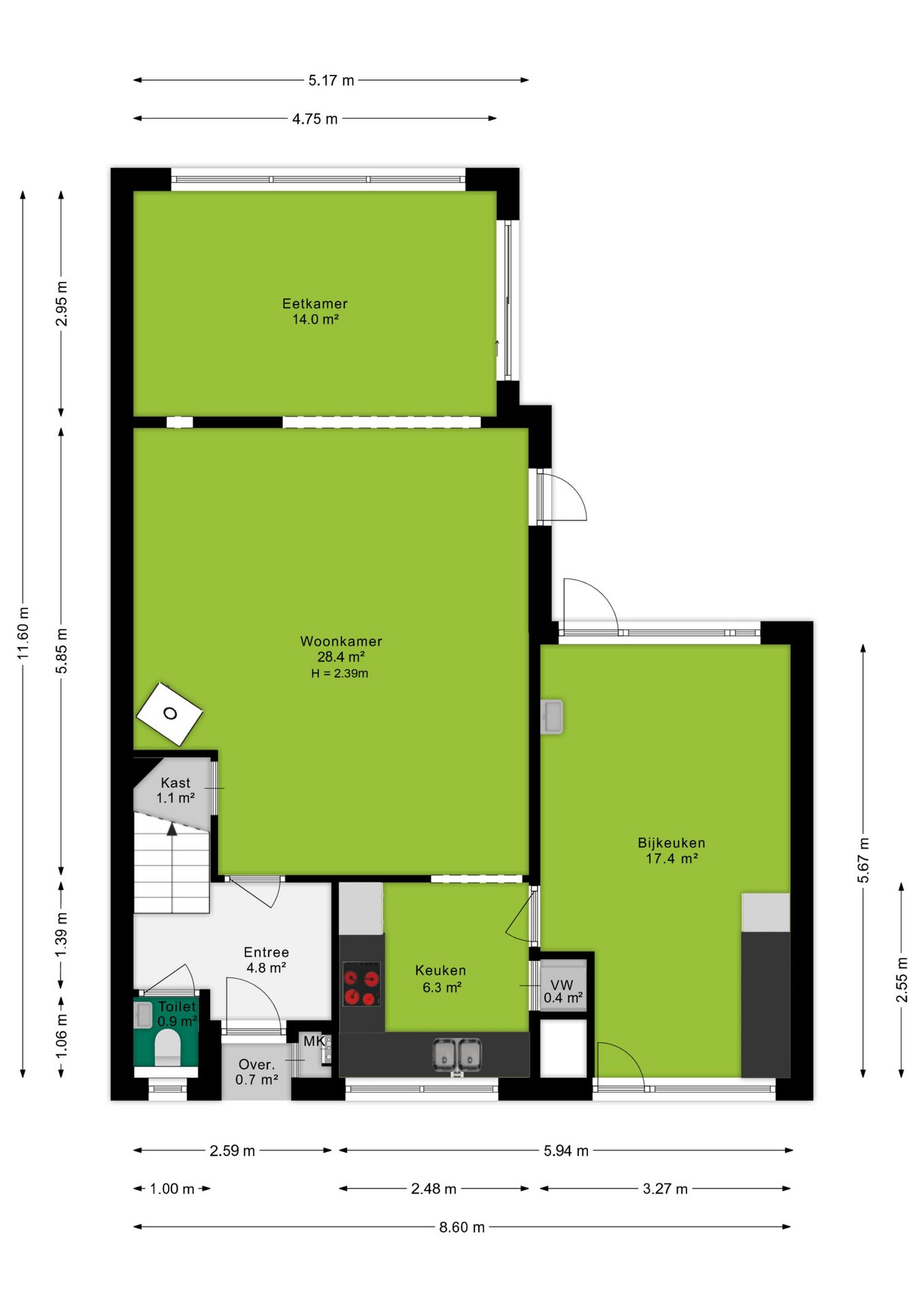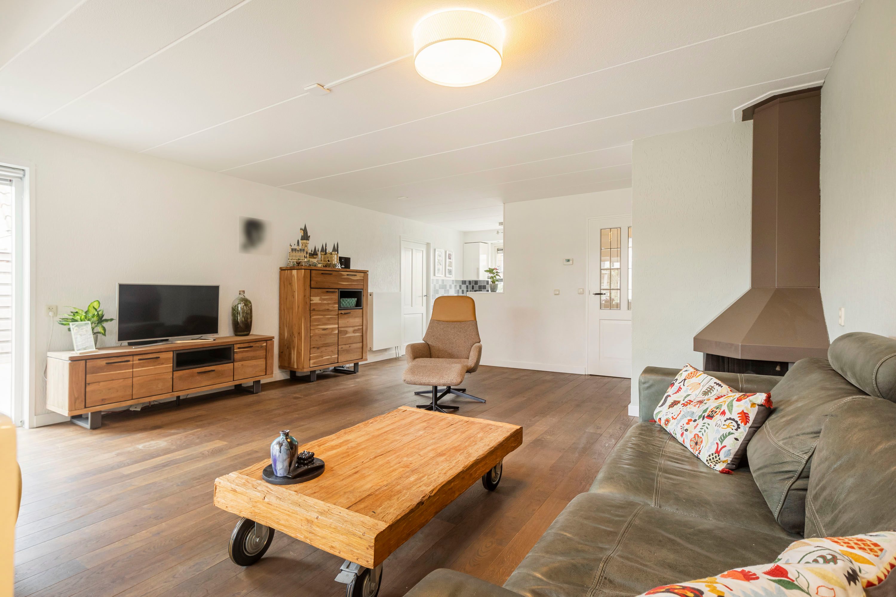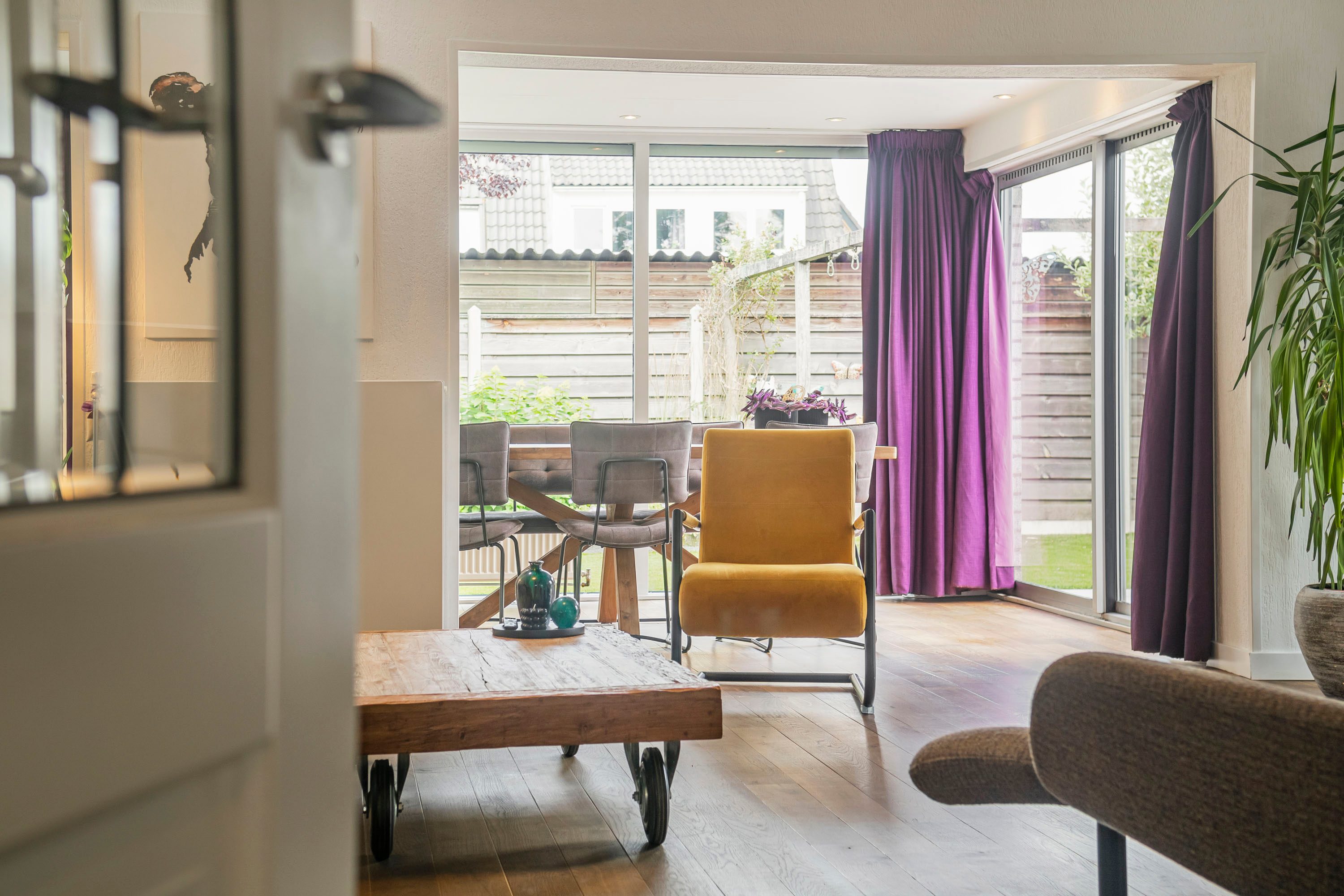 Via de entree, voorzien van een trapopgang, toilet en meterkast, stap je binnen in de ruime en lichte woonkamer. Deze fijne ruimte laat volop daglicht binnen en biedt alle mogelijkheden om een knusse zithoek te creëren bij de sfeervolle houtkachel. Aan de achterzijde van de woonkamer vind je het eetgedeelte, een ideale plek voor gezellige diners met een mooi uitzicht op de achtertuin.
