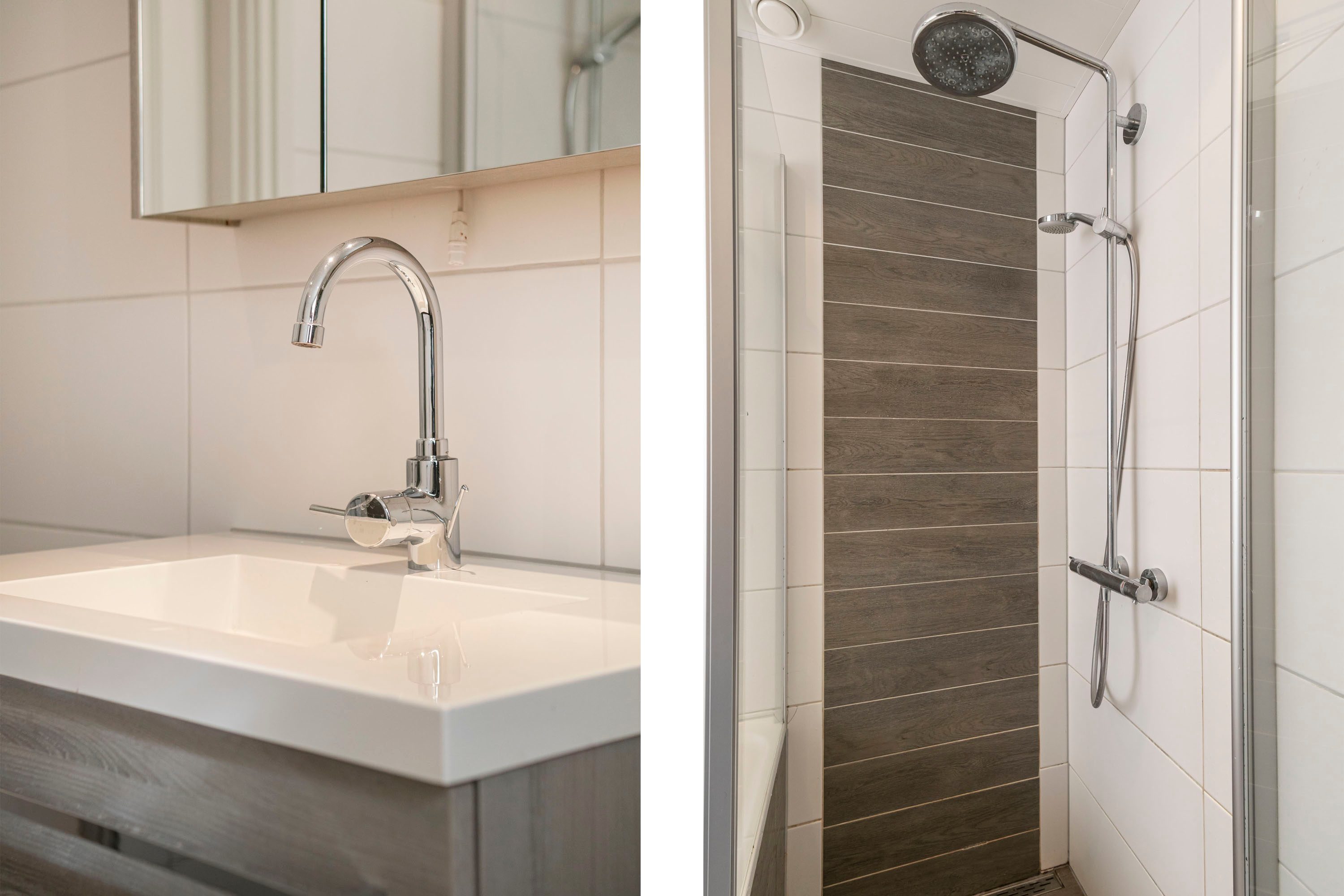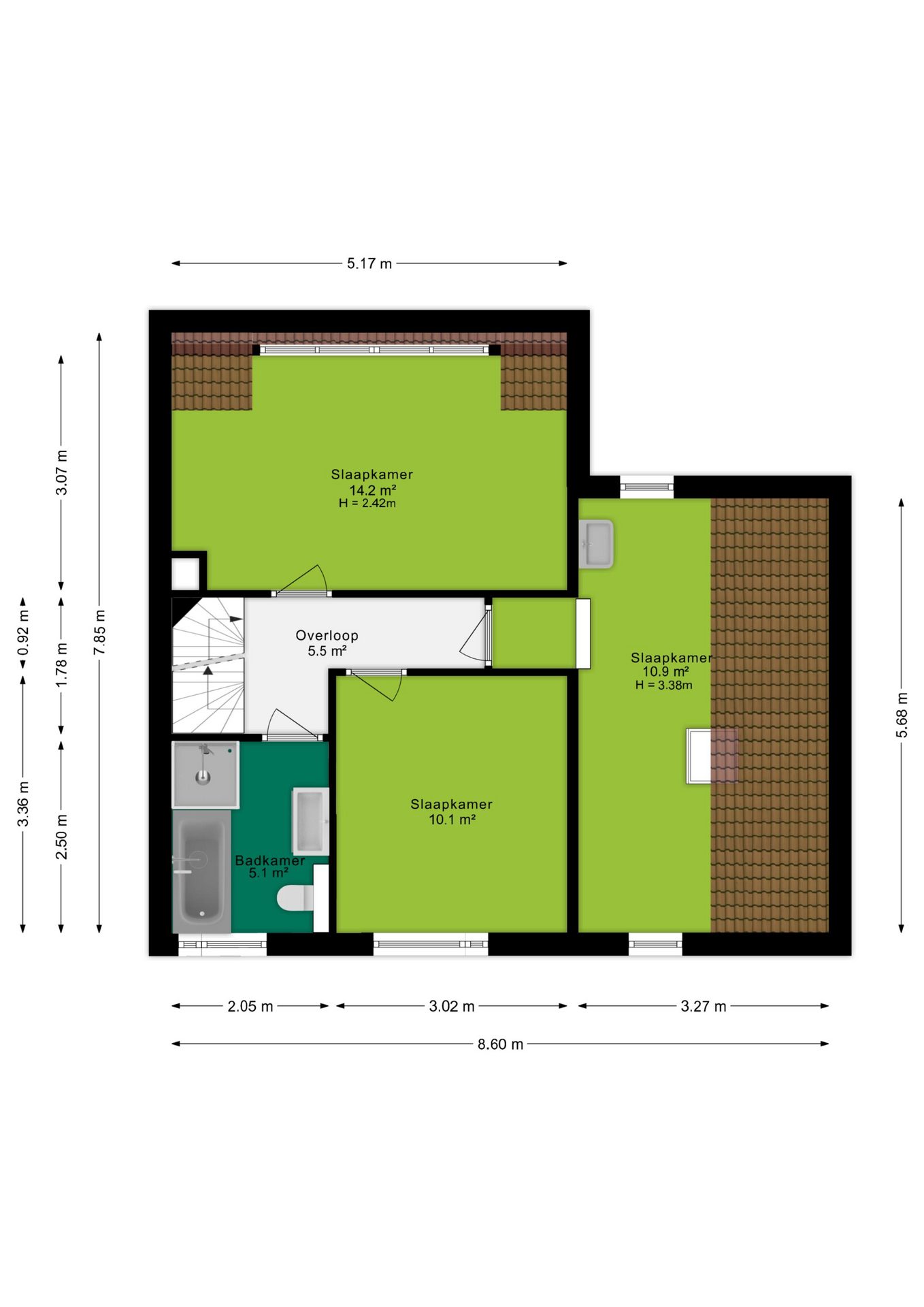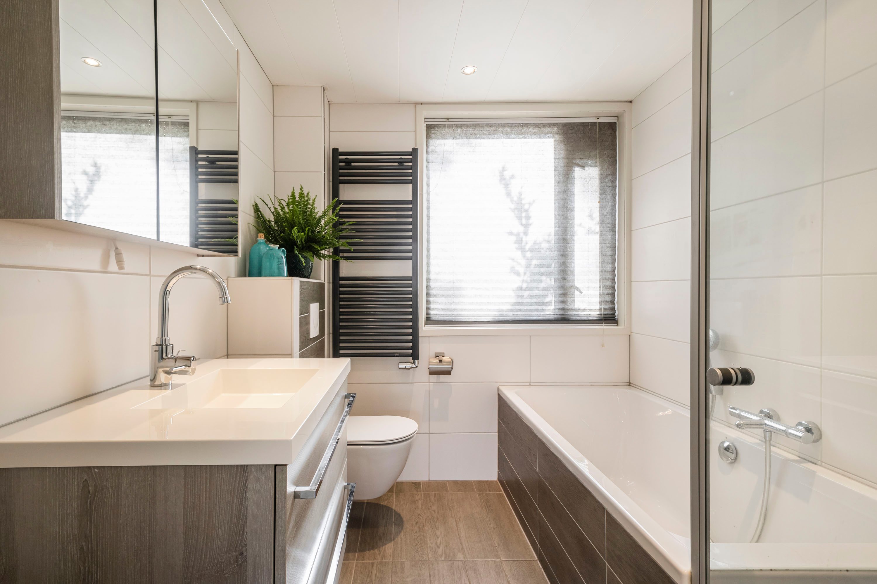 Op de eerste verdieping biedt de overloop toegang tot drie ruime slaapkamers van ongeveer 14m², 11m² en 10m². De slaapkamer aan de achterzijde is voorzien van een dakkapel, waardoor extra ruimte en licht ontstaat. De badkamer is modern afgewerkt en uitgerust met een inloopdouche, ligbad, een royaal wastafelmeubel, designradiator en een toilet. Dankzij het aanwezige raam is er bovendien natuurlijke ventilatie mogelijk.