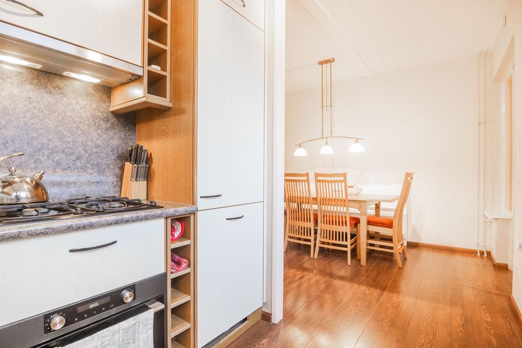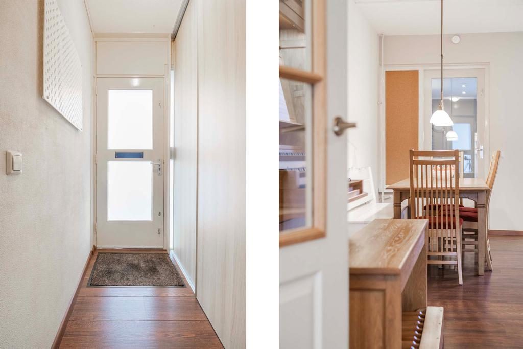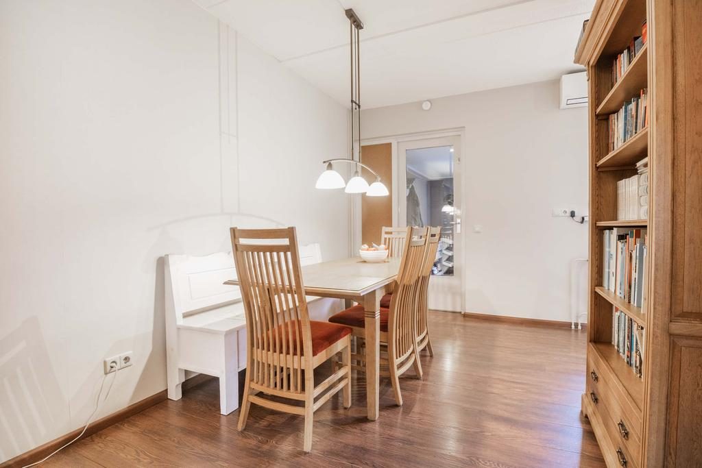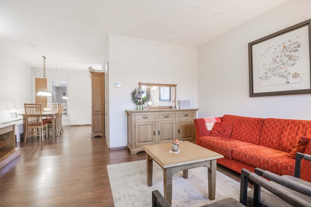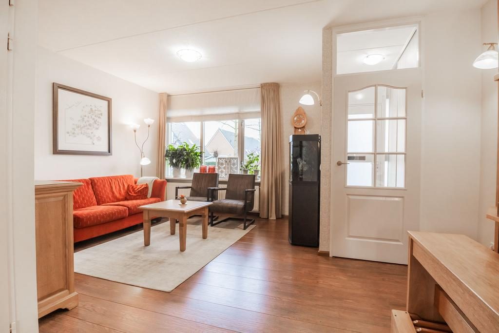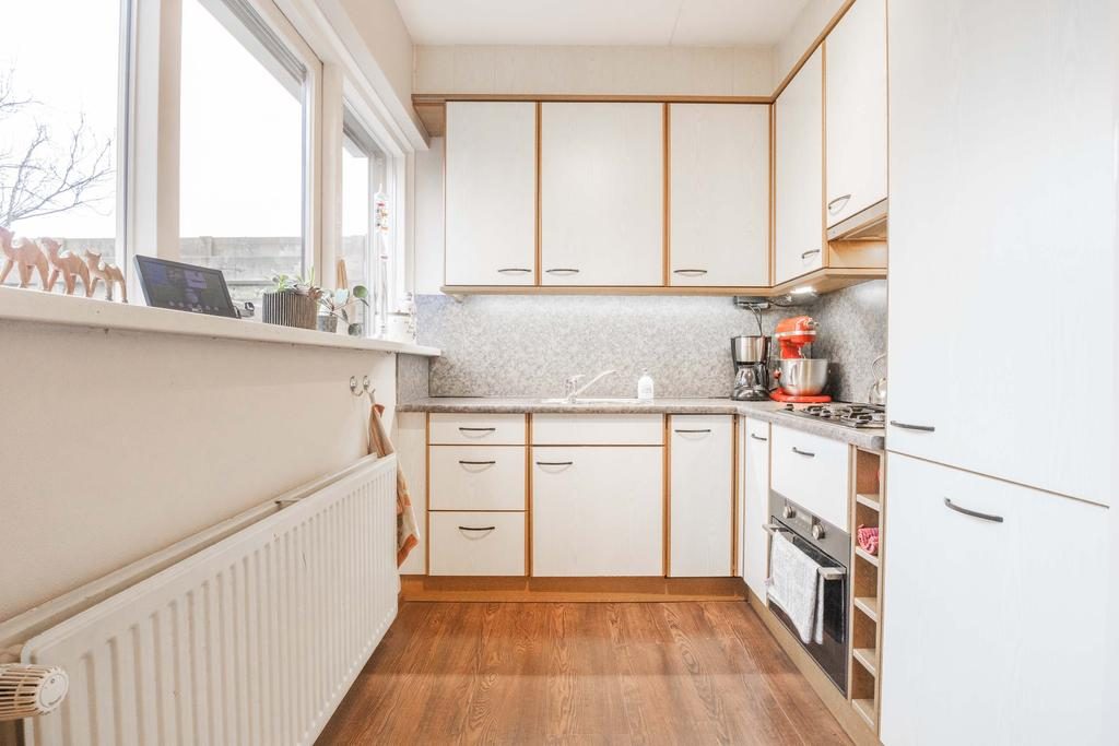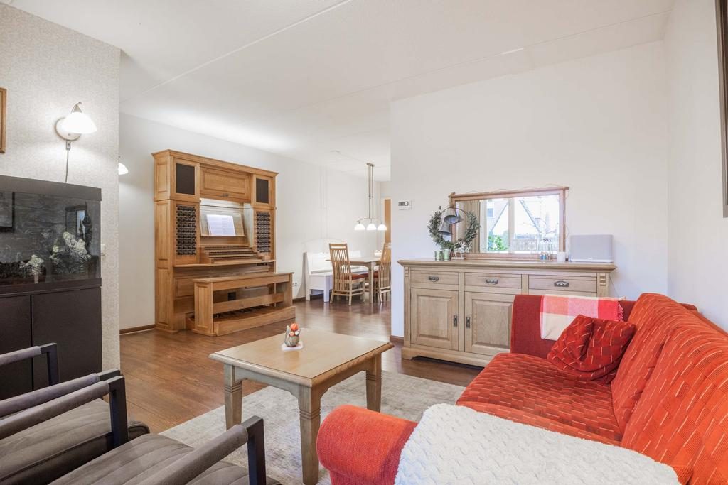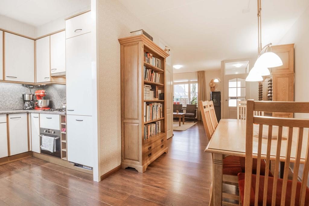 Binnenkomst via de entree, waar zich ook de berging en meterkast bevinden. De royale woonkamer is ongeveer 30 m². Vanuit de woonkamer loop je zo de eetkamer in. Vanuit de eetkamer heb je toegang tot de bijkeuken, die ideaal is voor het opbergen van spullen en eventueel een extra koelkast. Vanuit de bijkeuken kun je ook de tuin betreden. Ga je vanuit de eetkamer verder, dan kom je in de keuken. Deze is uitgevoerd in een lichte kleurstelling en voorzien van diverse inbouwapparaten, waaronder een vier-pits gasfornuis, afzuigkap, oven, koelkast en vaatwasser.