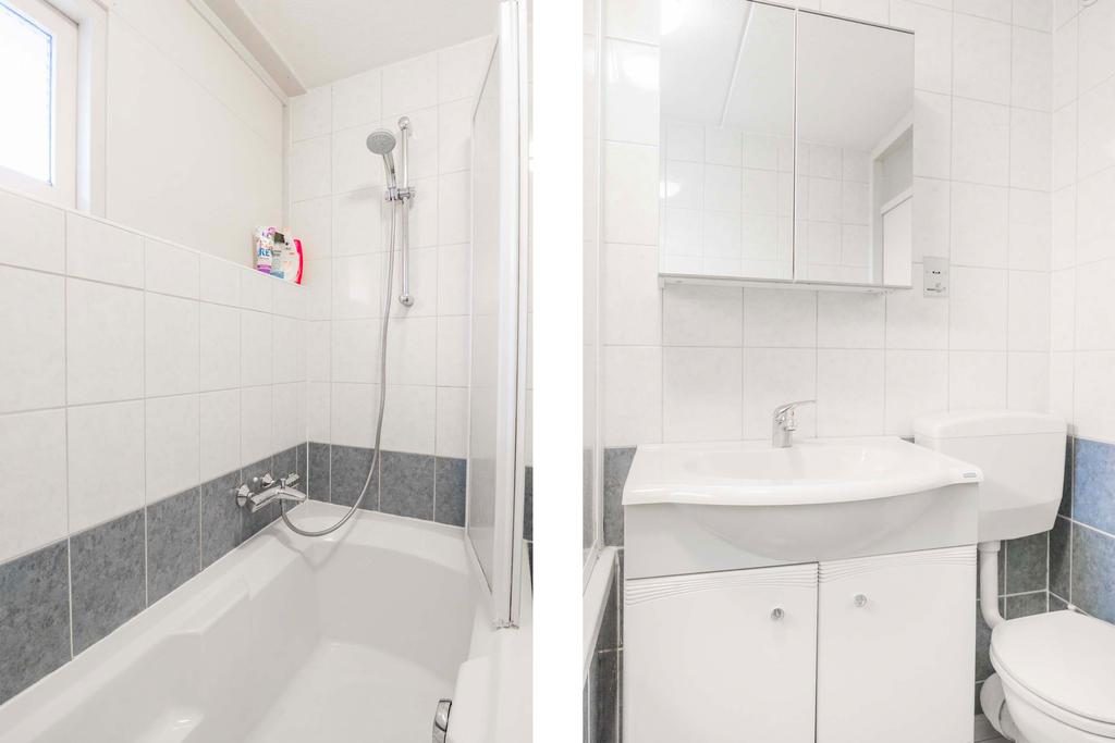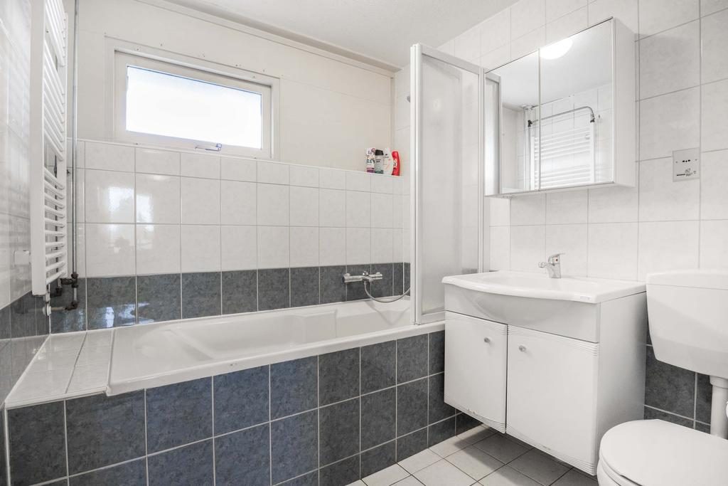 De volledig betegelde badkamer beschikt over een ligbad en douchecombinatie, een wastafelmeubel, een designradiator en een toilet.