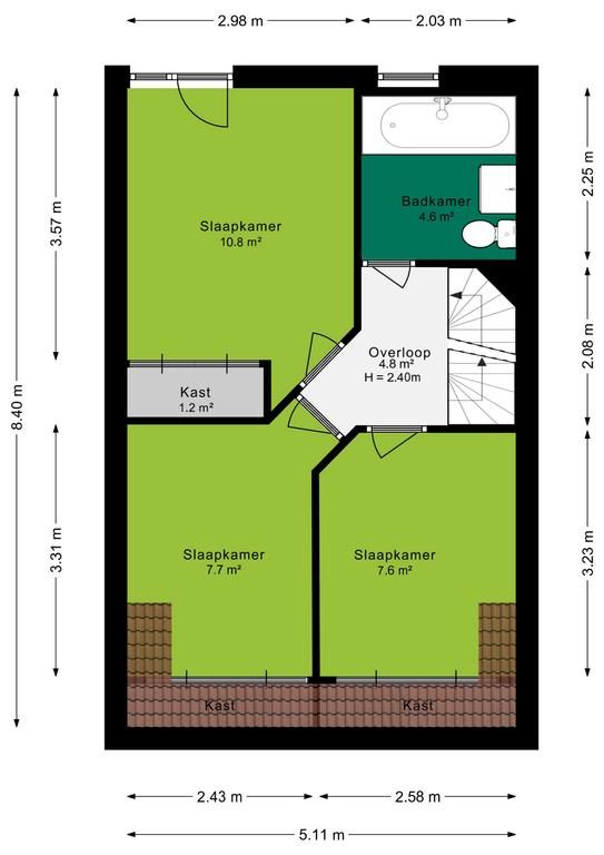 Overloop, drie ruime slaapkamers die zijn uitgerust met inbouwkasten. De slaapkamers aan de voorzijde van de woning zijn erg ruim door de dakkapel.