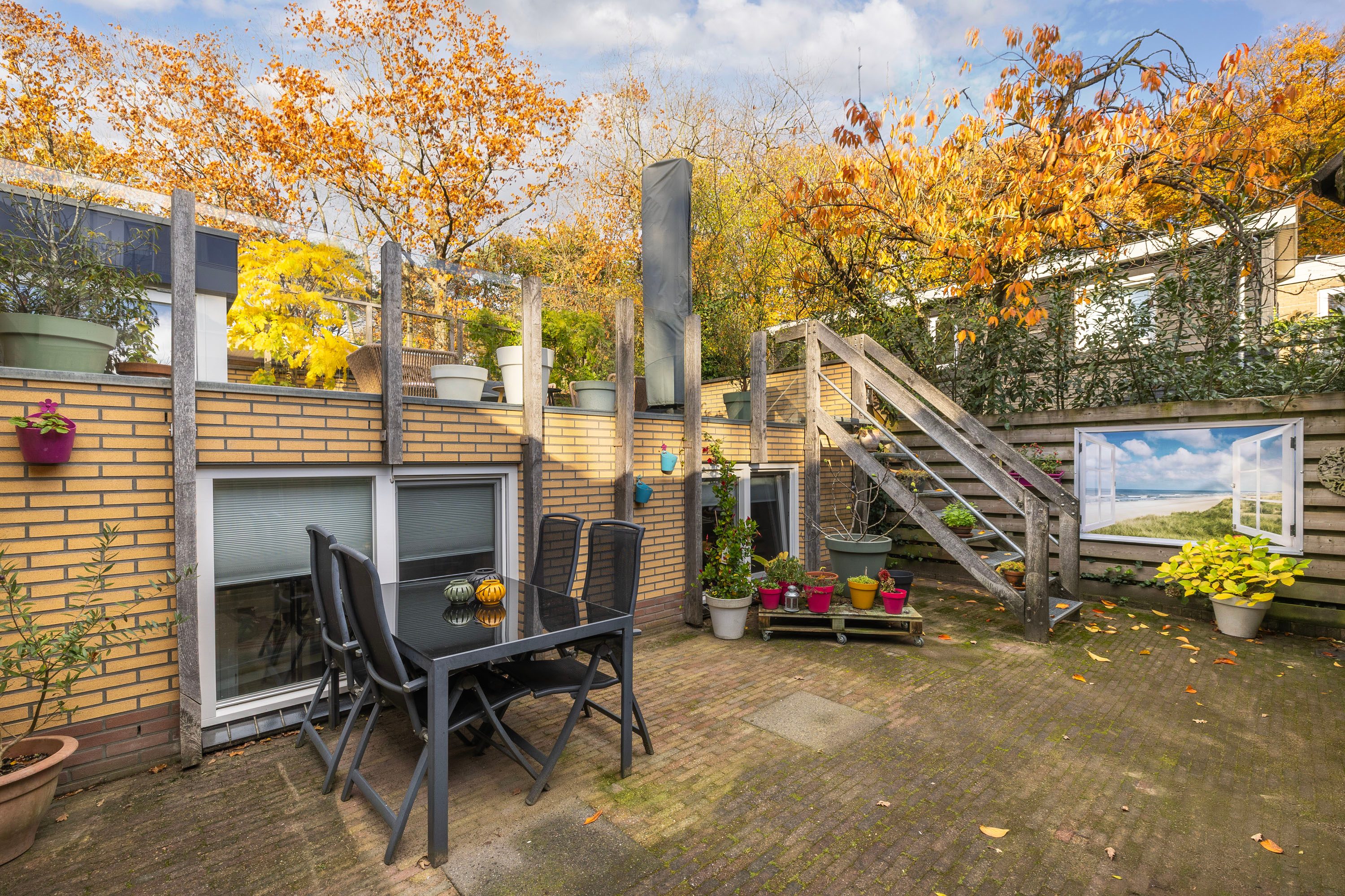 De tuin ligt op het oosten en biedt een fijne plek om van de ochtendzon te genieten. Vanuit de tuin is via een trap het dakterras bereikbaar, wat een extra buitenruimte creëert. Aan de voorzijde is de gelegenheid om van de avondzon te genieten. Eveneens is hier de oprit met de gelegenheid tot het parkeren van de auto op eigen terrein.