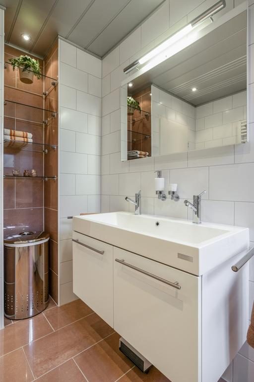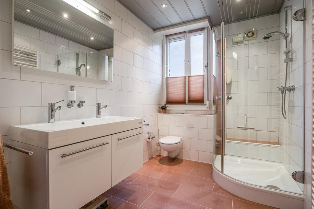 Wanneer je de trap opgaat naar de eerste verdieping, kom je uit op een ruime en lichte overloop. Vanaf hier heb je toegang tot de volledig betegelde badkamer, die van alle gemakken is voorzien. De badkamer beschikt over een dubbele wastafel, een moderne douche en een toilet.