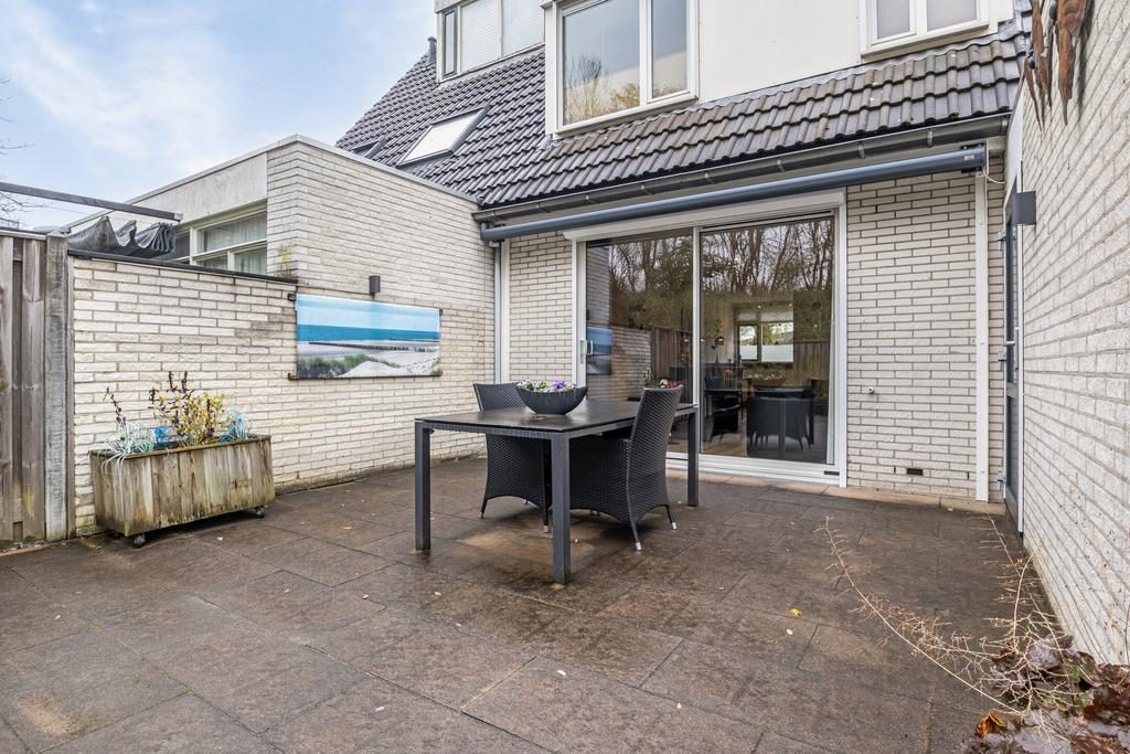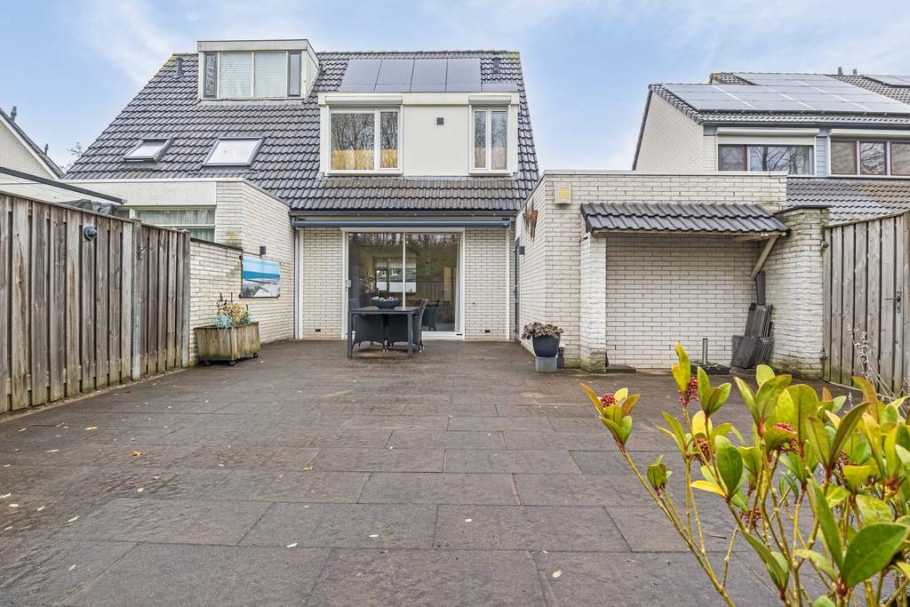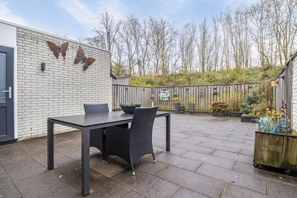 Via de schuifdeuren in de woonkamer stap je direct de tuin in, die volledig is betegeld voor een onderhoudsvriendelijke buitenruimte. Deze tuin biedt een ideale plek om te ontspannen en te genieten van de buitenlucht. Achter de woning kun je heerlijk beschut zitten onder het recent geplaatste zonnescherm, waardoor je op zonnige dagen altijd een aangenaam plekje in de schaduw hebt. Het is een perfecte plek voor een gezellige zithoek waar je kunt ontspannen met een goed boek of kunt genieten van een maaltijd in de buitenlucht.