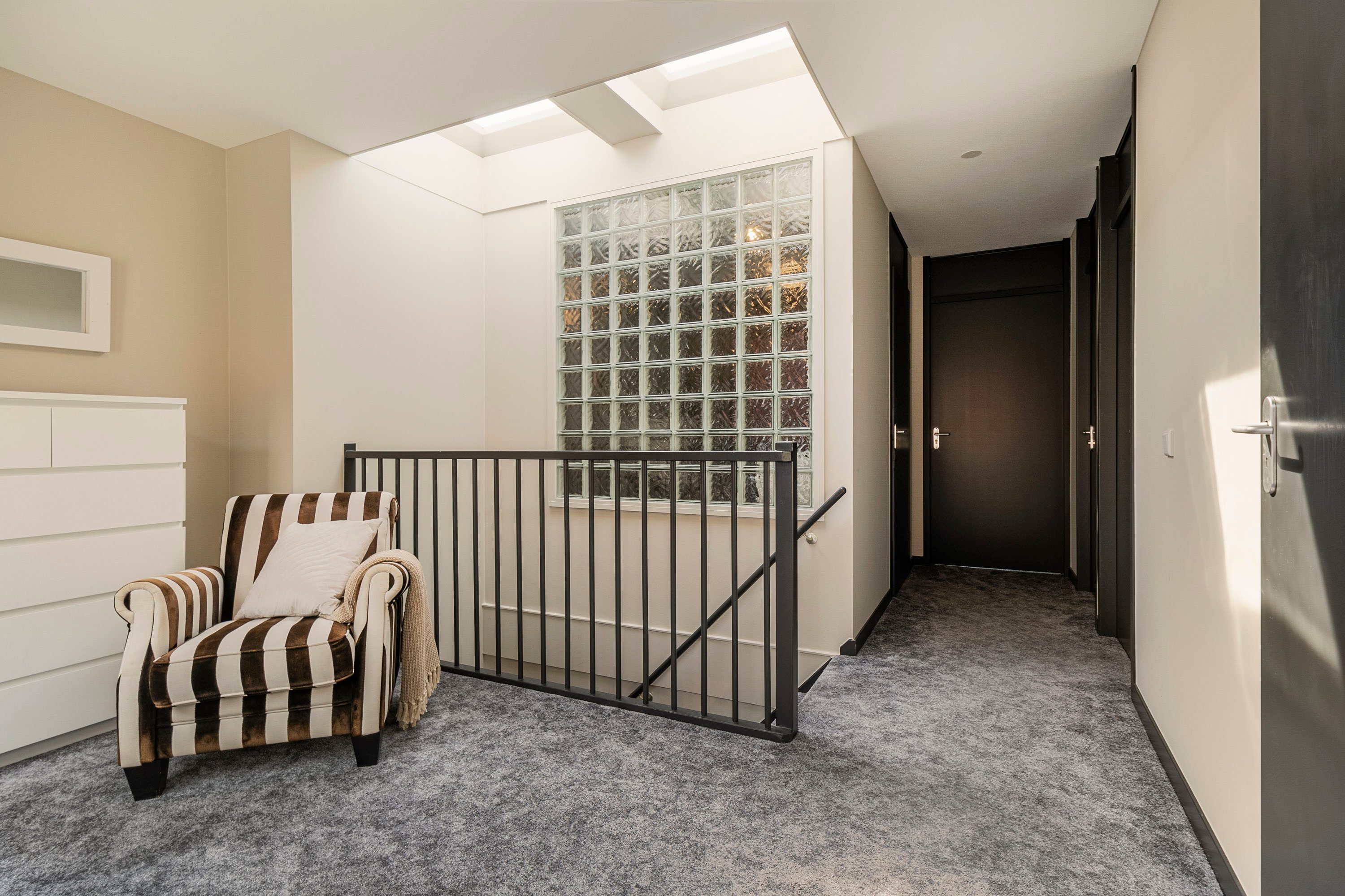 In de gang zorgen lichtkoepels in het dak voor natuurlijk daglicht, dat via een glazen wand de badkamer binnenvalt. Zo profiteer je van een heldere, lichte ruimte met volledige privacy, omdat het glas wel licht doorlaat maar niet doorzichtig is. Voor extra comfort is de badkamer voorzien van ingebouwde afzuiging én behaaglijke vloerverwarming, een fijne start van elke dag.