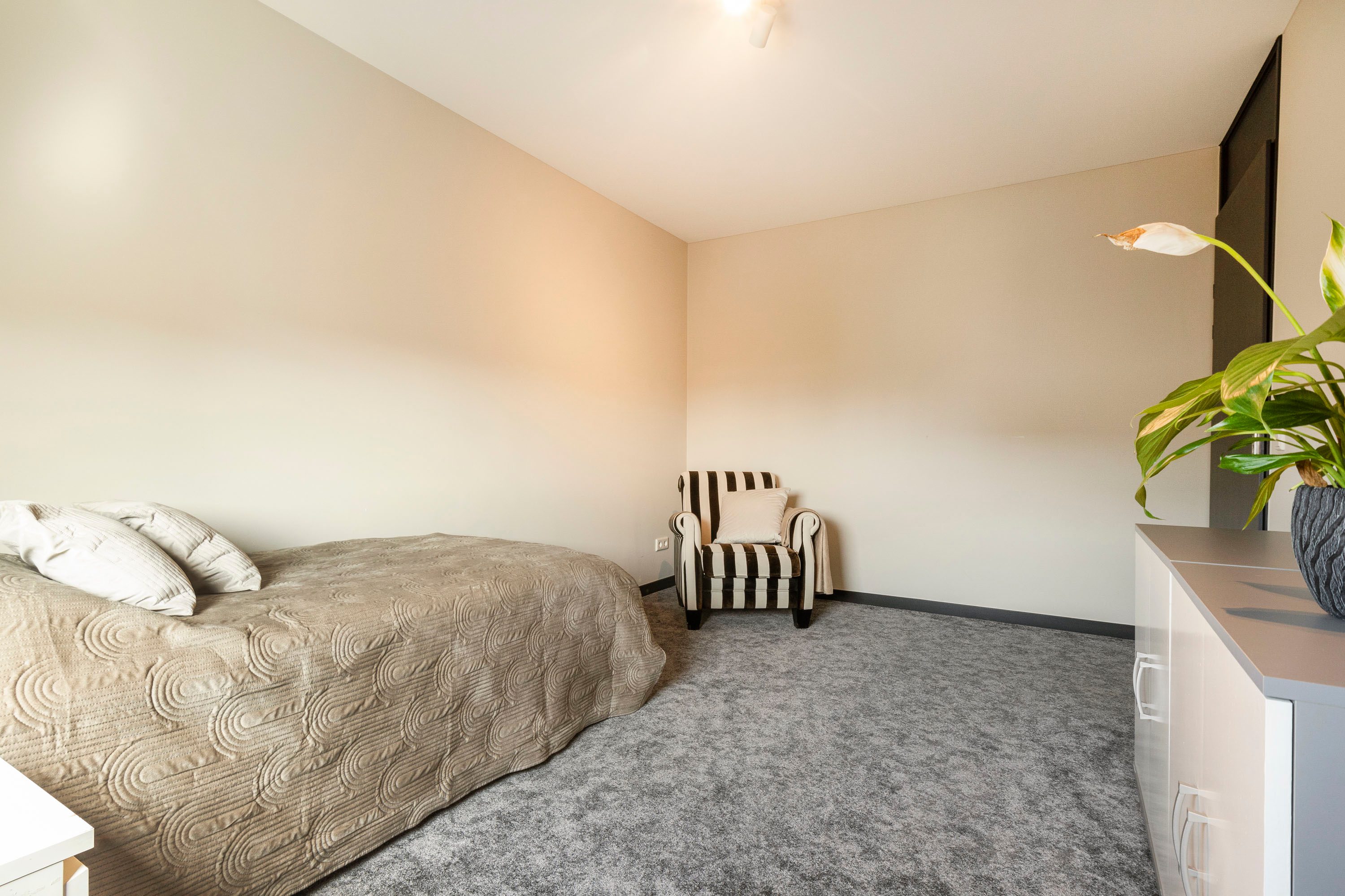De riante master bedroom is een heerlijke plek om tot rust te komen. Voorzien van ingebouwde airconditioning is het hier ook op warme dagen comfortabel vertoeven. Via een openslaande deur heb je direct toegang tot de patio, perfect voor een ontspannen kop koffie in de ochtendzon. Een slaapkamer met het comfort van een hotel, gewoon bij je thuis.