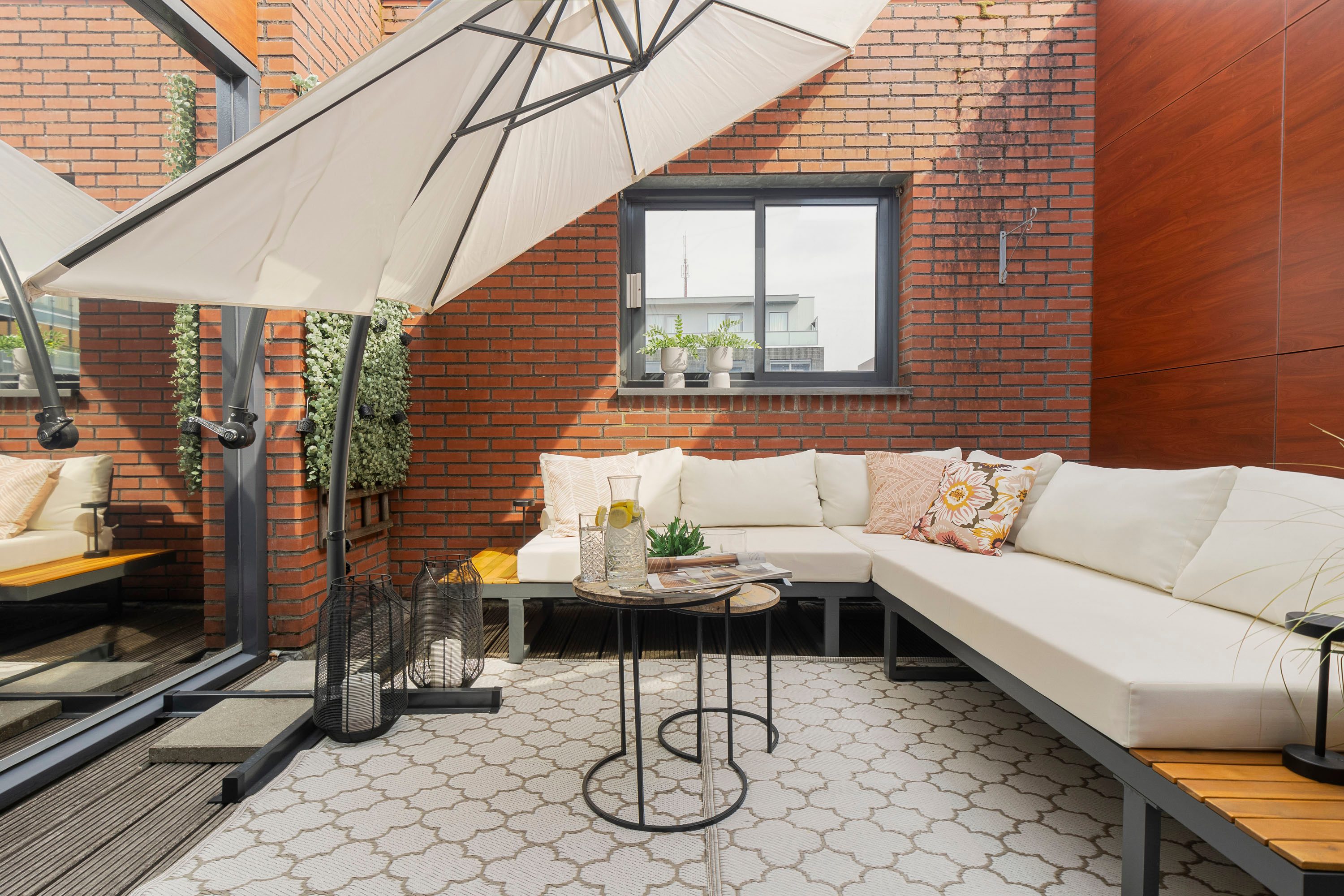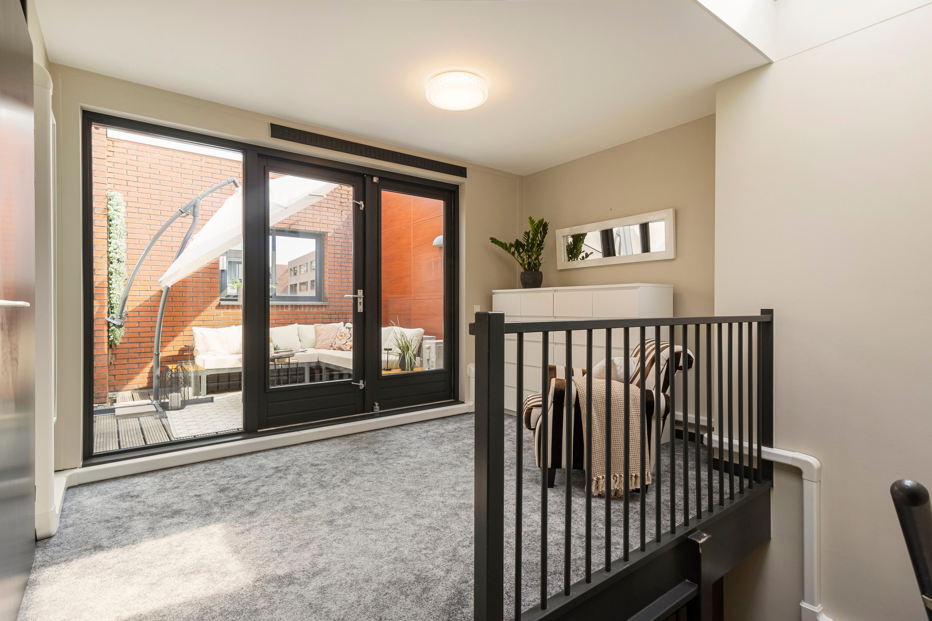 De ruime overloop vormt het centrale punt van de bovenverdieping en biedt toegang tot de drie slaapkamers, de moderne badkamer, de aparte wasruimte én de heerlijk beschutte patio. Via dubbel openslaande deuren bereik je de patio. Dankzij meerdere lichtkoepels in het dak is ook deze verdieping opvallend licht en aangenaam.