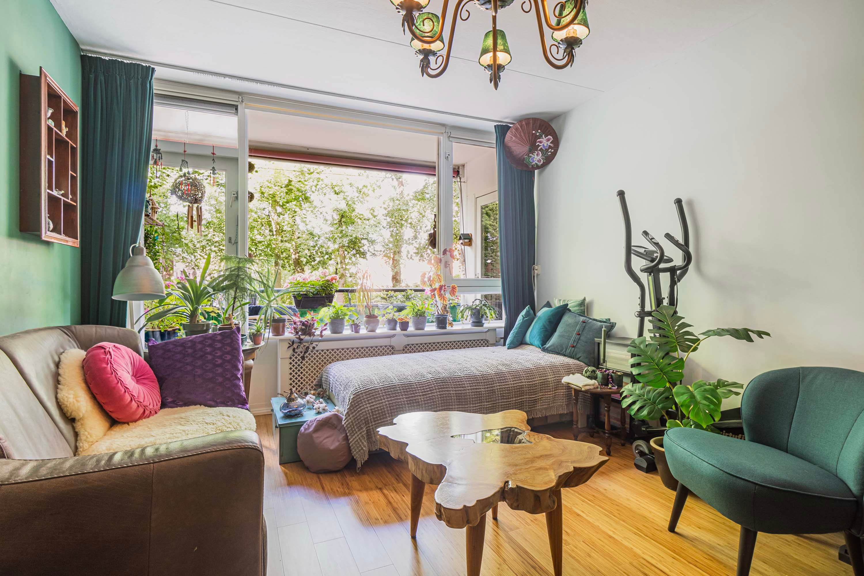 Je betreedt het appartement via de centrale hal met toegang tot zowel de keuken als de ruime woonkamer. Het leefgedeelte en de keuken zijn van elkaar gescheiden, zodat je van beide ruimtes optimaal kunt genieten. Dankzij de grote raampartijen in de woonkamer geniet je van volop daglicht en een prachtig uitzicht. Daarnaast is de hele woning voorzien van bamboeparket. Vanuit de woonkamer heb je toegang tot beide slaapkamers.