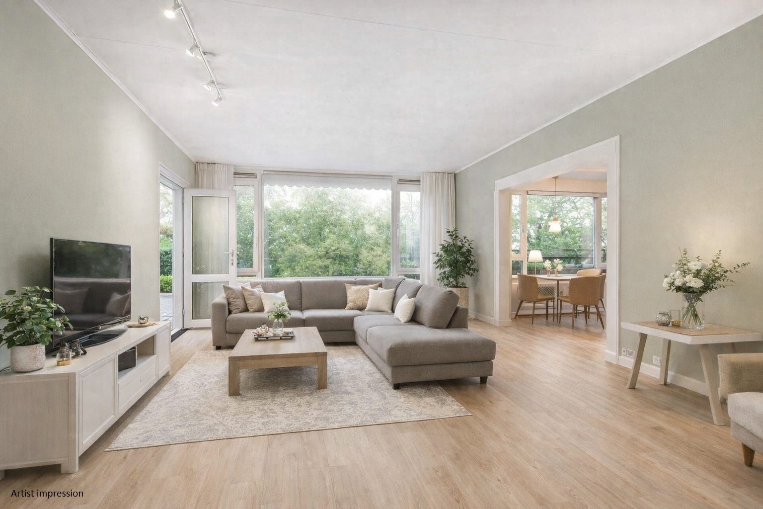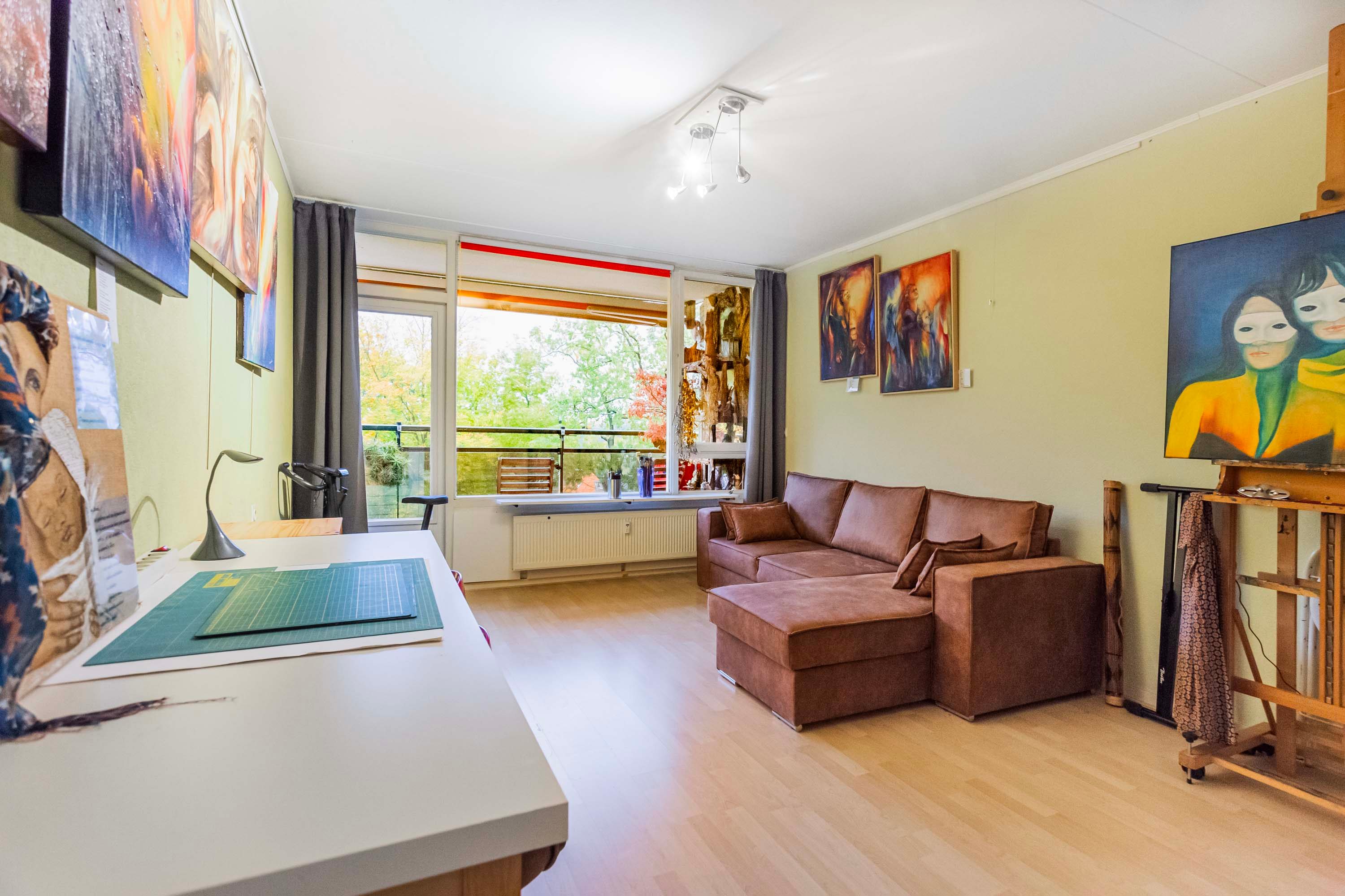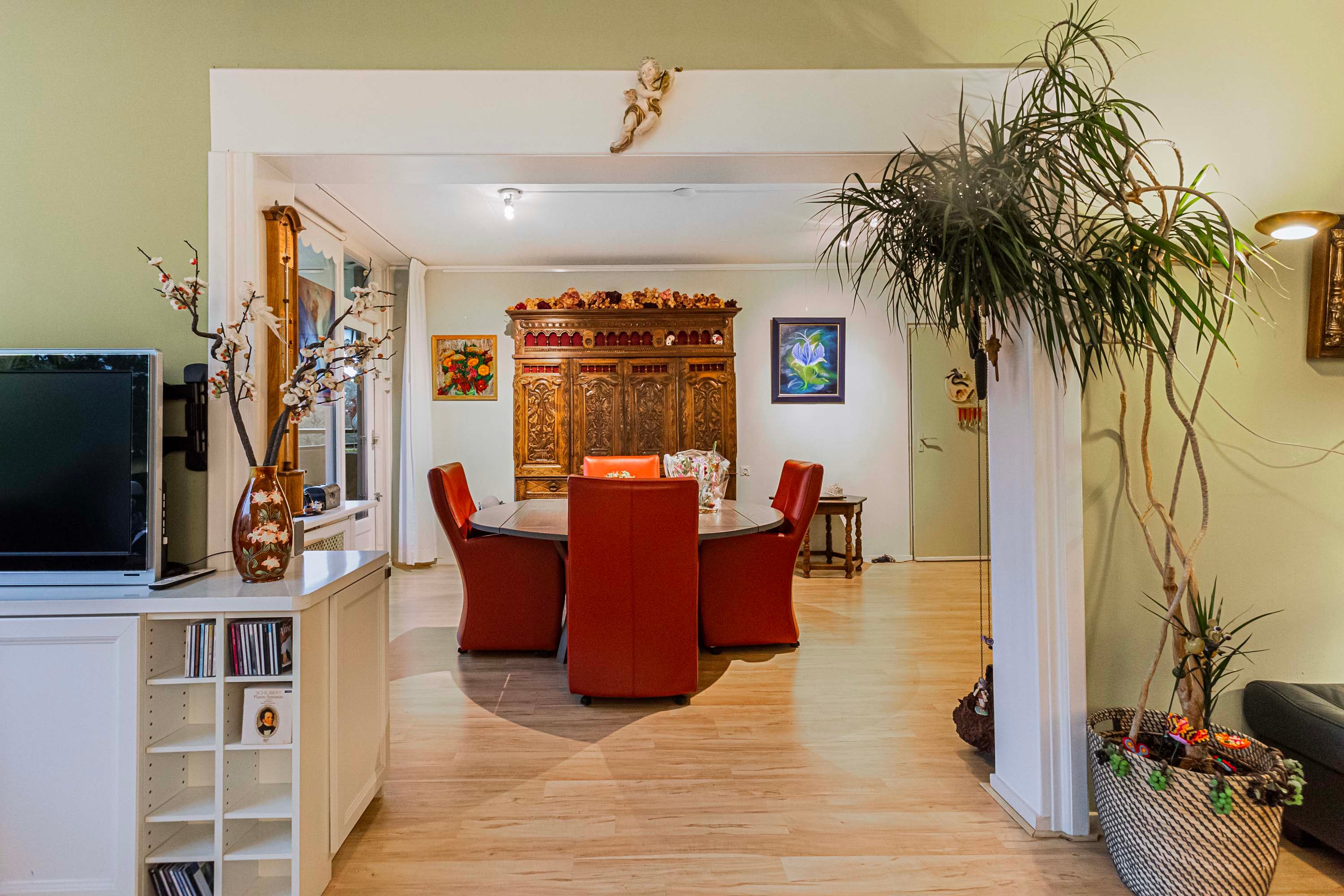 De ruime woonkamer is verdeeld in een zitgedeelte en een apart eetgedeelte, verbonden door een brede doorgang. Hierdoor voelt de ruimte open en gezinsvriendelijk aan en zijn er volop mogelijkheden om de woonkamer en eetkamer naar wens in te richten. Dit is te zien op de middelste foto van de woonkamer, welke een artist impression betreft. Vanuit de woonkamer zijn zowel het kleine als het grote balkon bereikbaar.