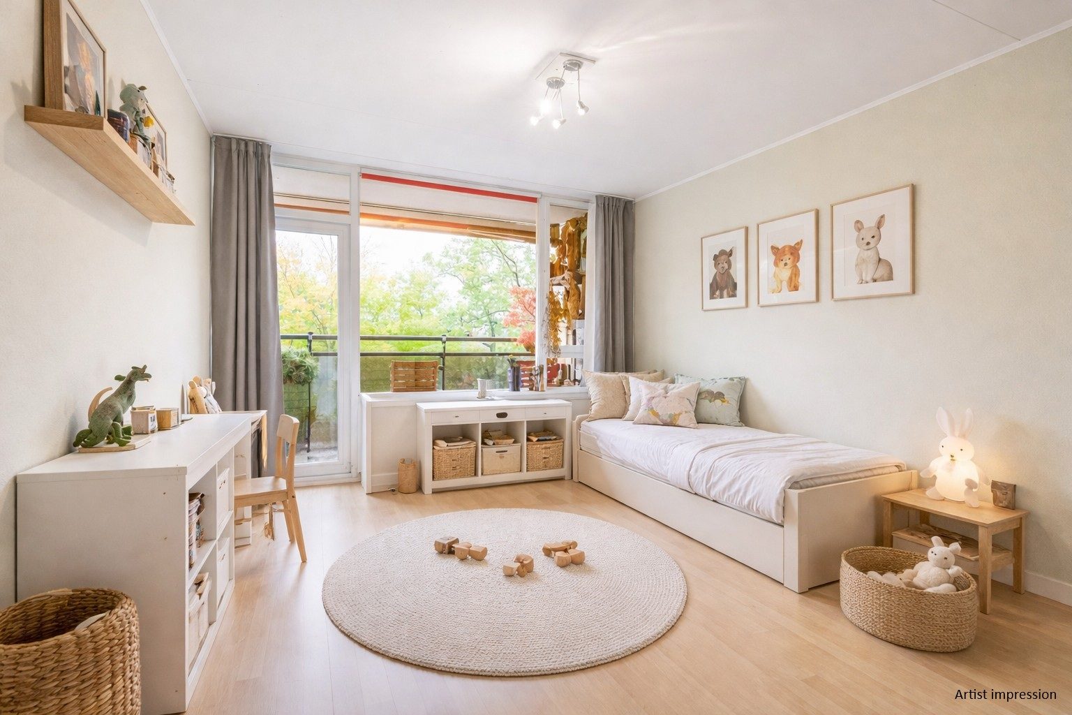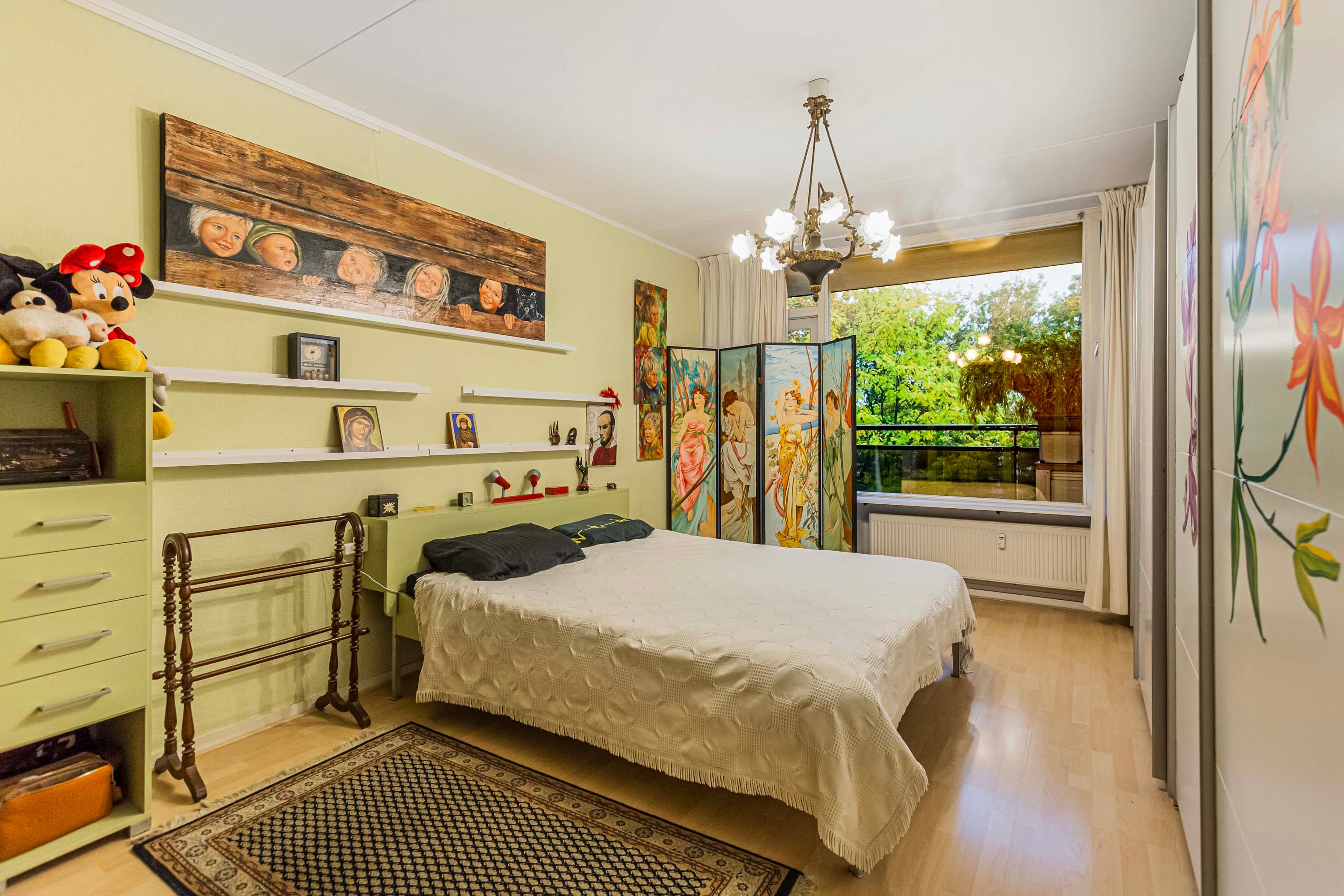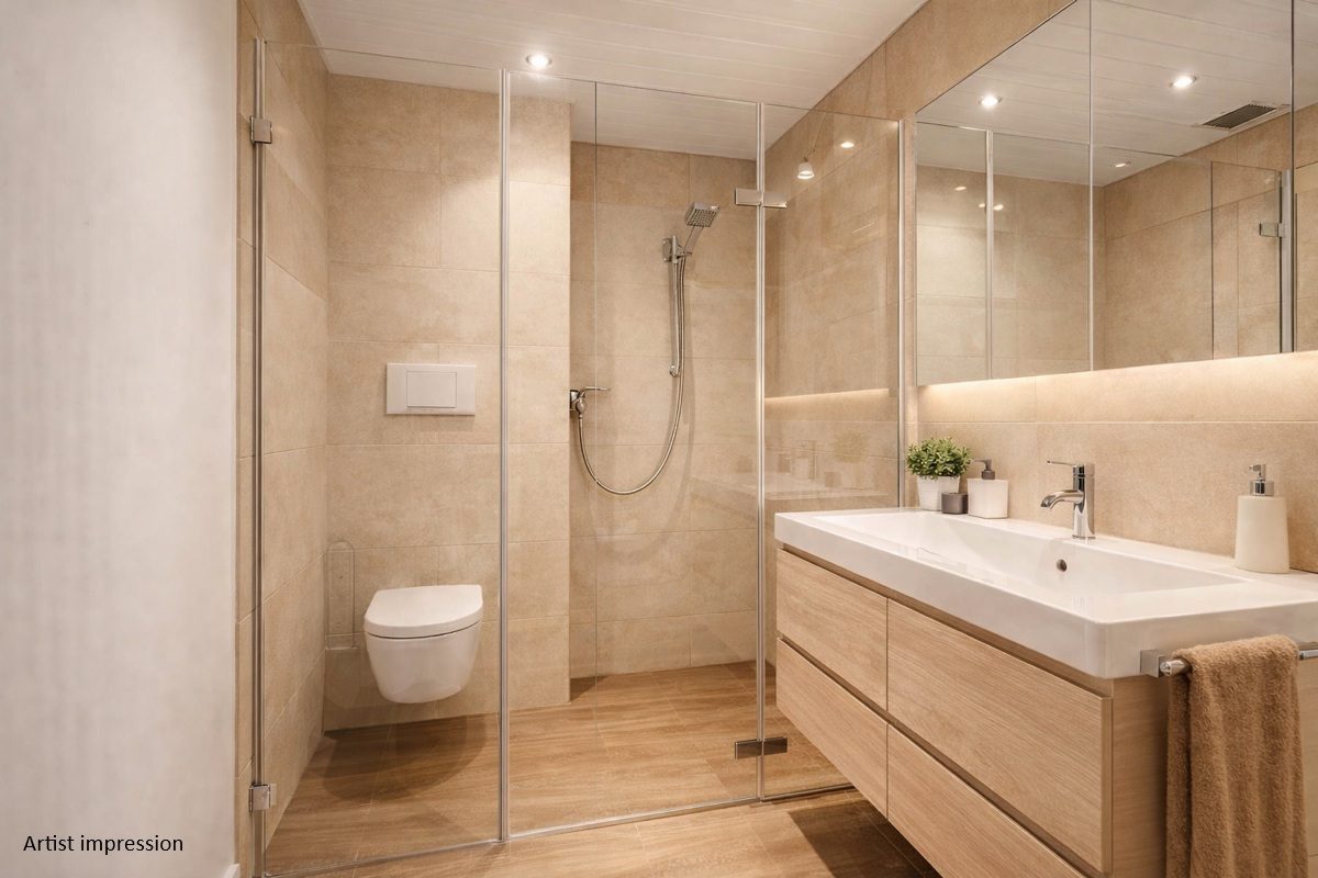 De hoofdslaapkamer beschikt over ingebouwde kastruimte en directe toegang tot de badkamer met inloopdouche, toilet en wastafelmeubel. De tweede slaapkamer, bijna even groot, ligt aan de andere zijde van het appartement en heeft net als de eetkamer toegang tot het grote balkon. Door de royale afmetingen van het appartement en de flexibele indeling is er volop ruimte om een praktische en comfortabele gezinswoning te creëren. De slaapkamers zijn daarnaast veelzijdig inzetbaar als kinderkamer, werkruimte of logeerkamer. Precies wat starters en/of gezinnen goed kunnen gebruiken. De artist impression afbeelding geeft een mogelijke inrichting van de kinderkamer weer.