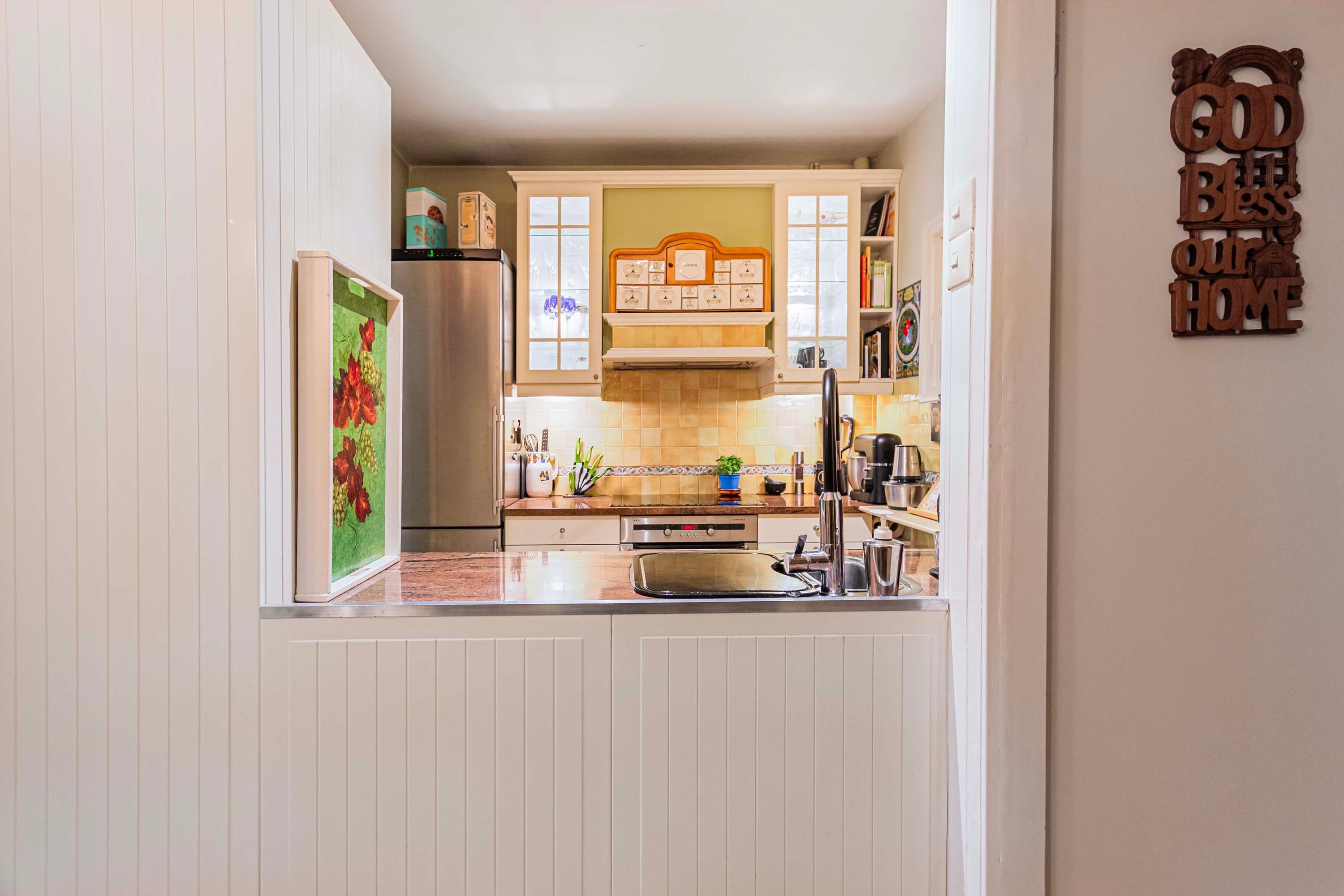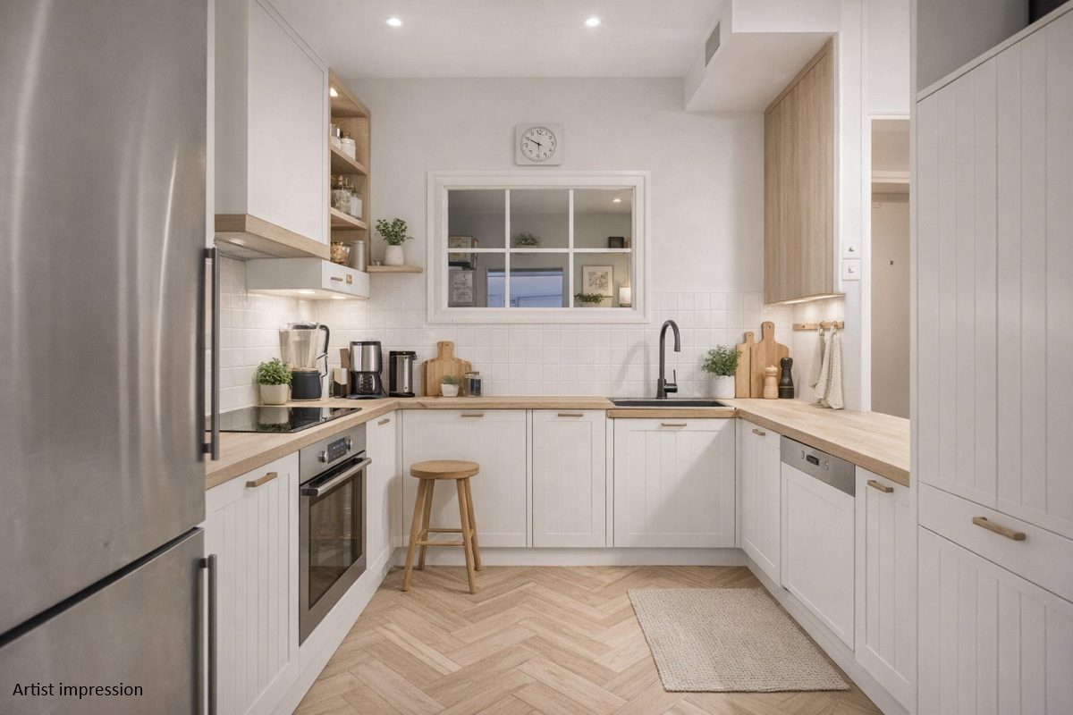 Bij binnenkomst kom je in de hal met toegang tot de vaste kast met wasmachineaansluiting, het toilet en de keuken. De hal staat in open verbinding met de keuken, wat zorgt voor extra licht en een ruimtelijk gevoel. De keuken is voorzien van een oven, kookplaat en vaatwasser, en biedt voldoende opbergruimte. Ideaal voor wie van koken houdt. De bovenste foto van de keuken betreft een artist impression en geeft een sfeerinpressie van hoe de keuken kan worden uitgevoerd.