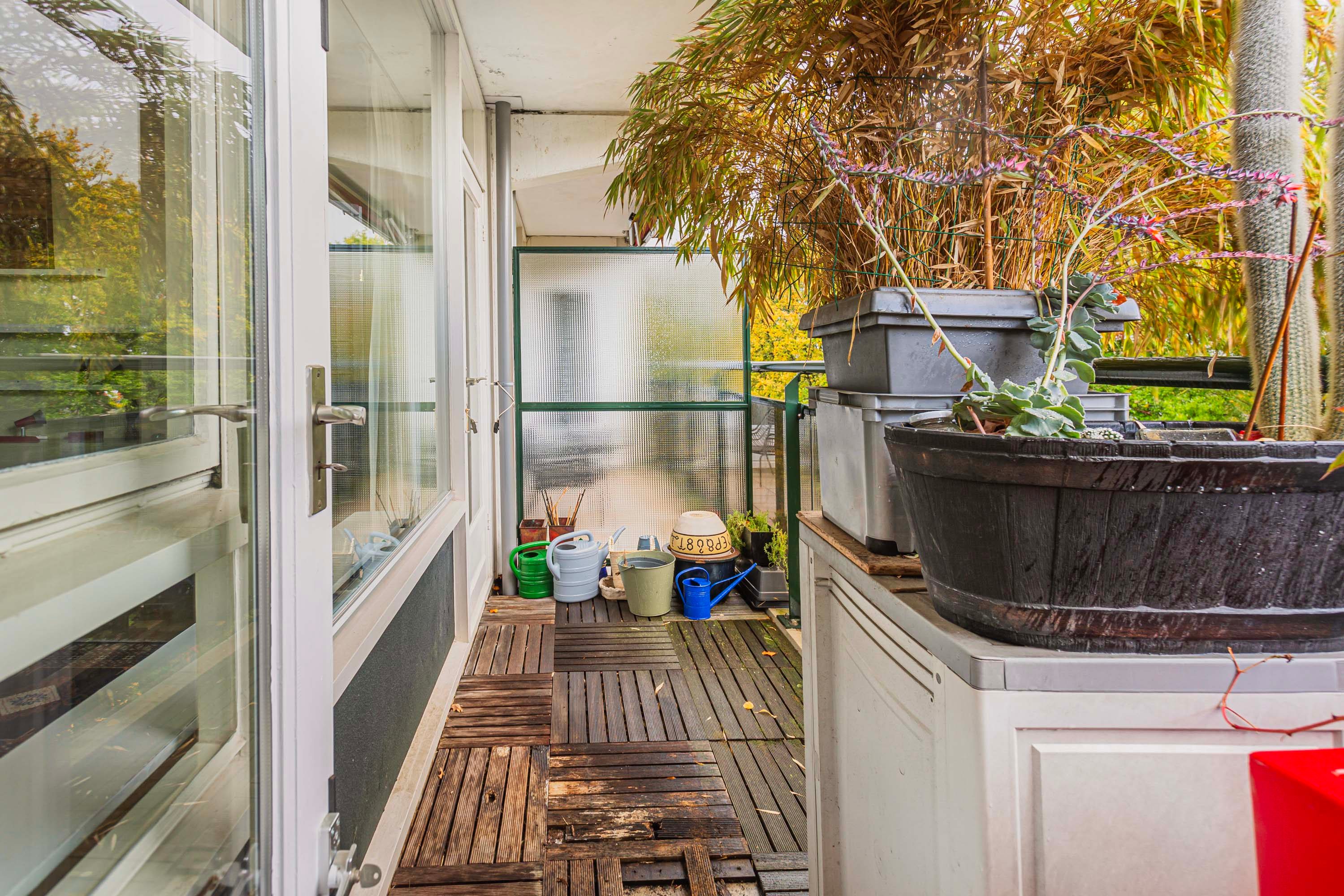Het appartement beschikt over twee balkons. Het grote balkon van circa 11 m² is toegankelijk via de eetkamer en tweede slaapkamer. Het kleinere balkon van bijna 6 m² grenst aan de woonkamer en hoofdslaapkamer. Beide balkons liggen op het westen en bieden een vrij uitzicht op een groene laan met bomen, wat zorgt voor veel privacy. Dankzij de drie elektrische zonneschermen zit je er op warme dagen altijd prettig, perfect voor een spelmoment met kinderen of een ontspannen avond voor die graag buiten zitten.