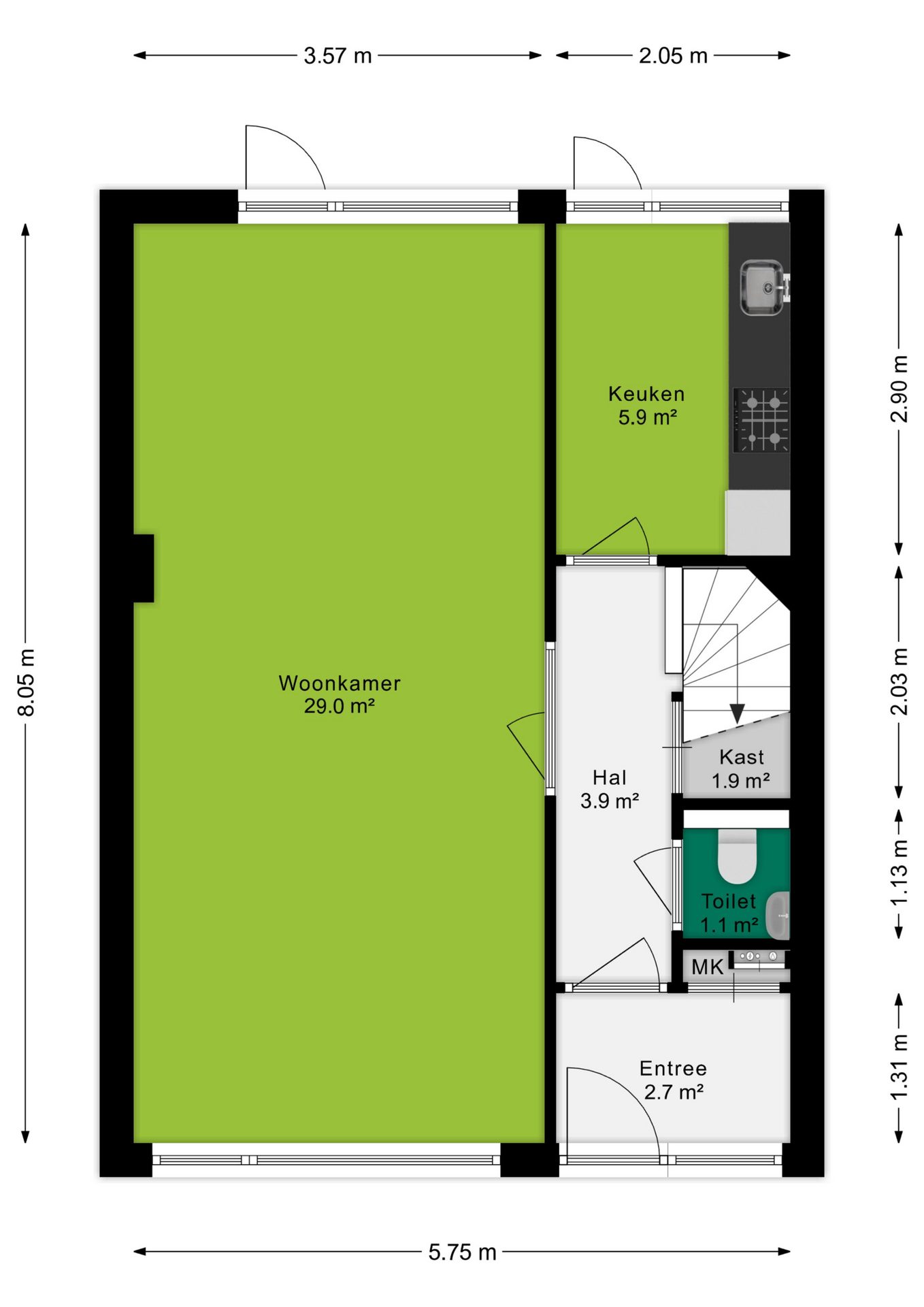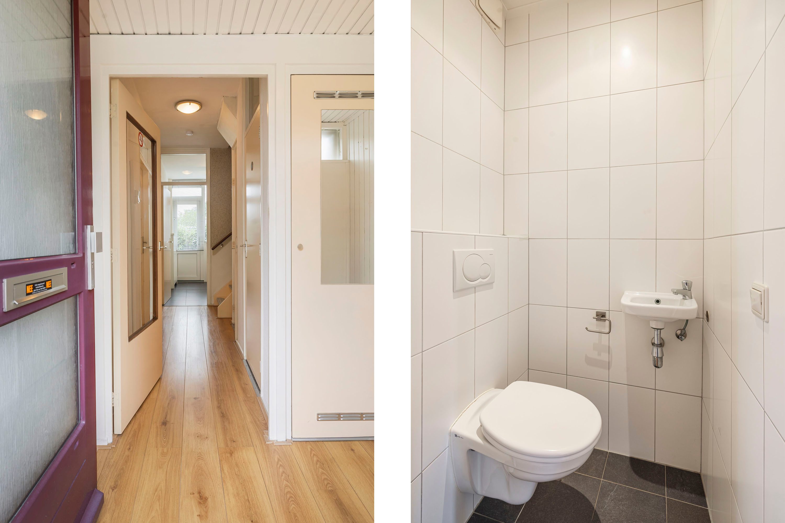 Bij binnenkomst heb je de beschikking over een garderobe hoek en is er toegang naar de hal. De hal geeft toegang naar de woonkamer en de keuken. De doorzon woonkamer, met een oppervlakte van circa 29m², heeft een deur die direct leidt naar de achtertuin. De gesloten keuken bevindt zich aan de achterzijde van de woning en is uitgevoerd in een rechte keukenopstelling met inbouwapparatuur. Tevens is er vanuit de keuken ook via een deur directe toegang naar de achtertuin. Terug in de hal, waar je ook de toiletruimte vindt en de beschikking hebt over een praktische trapkast (ideaal voor extra voorraad en opslag), bereik je via de trapopgang de eerste verdieping.