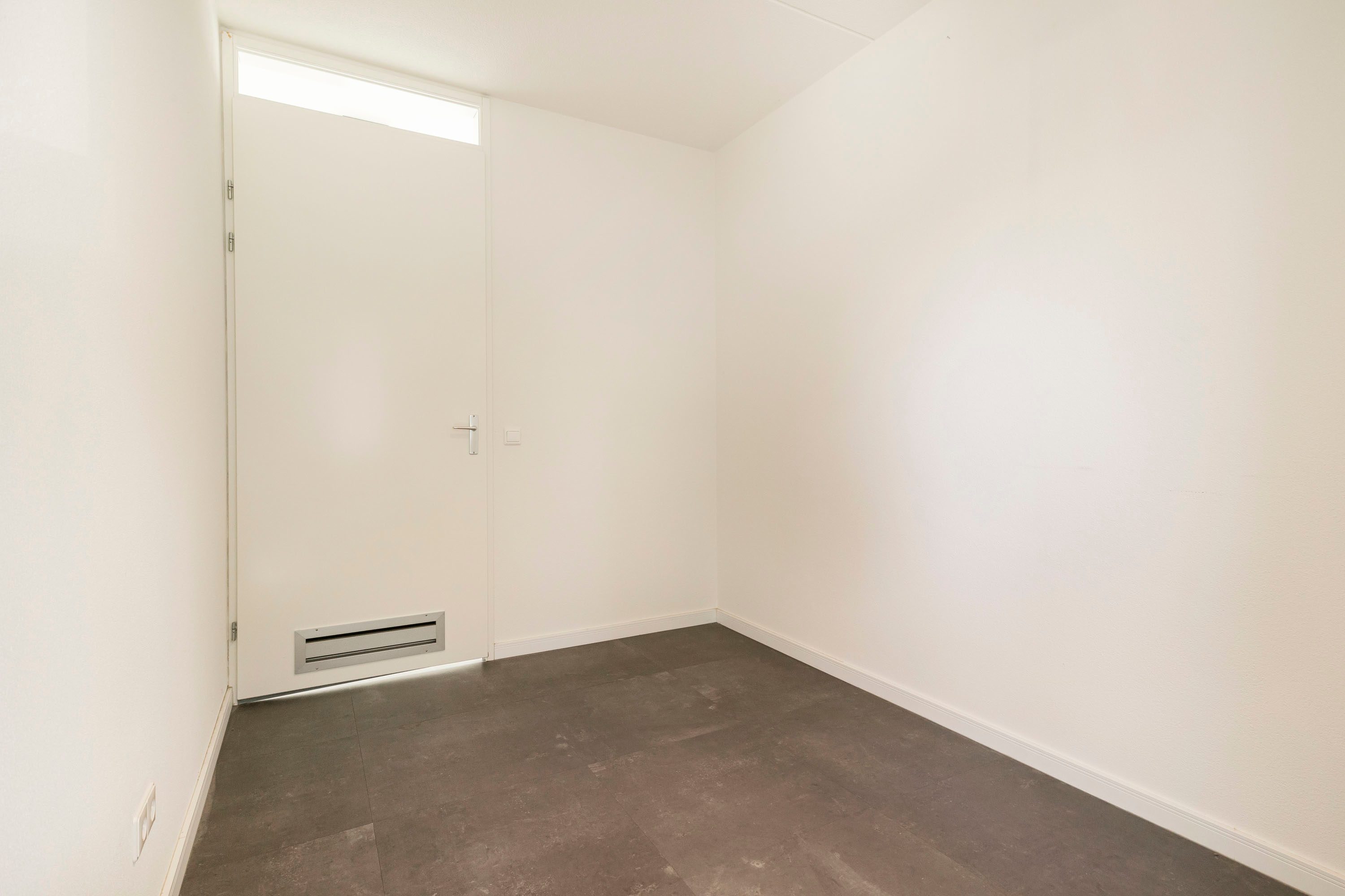 Je komt binnen via de voordeur in de hal met meterkast, toilet en toegang tot de open keuken met aangrenzend de woonkamer. De lichte woonkamer heeft een gezellige zithoek aan de voorzijde en openslaande deuren naar de voortuin. De ruimte is strak afgewerkt met een moderne PVC-vloer en neutrale wanden.