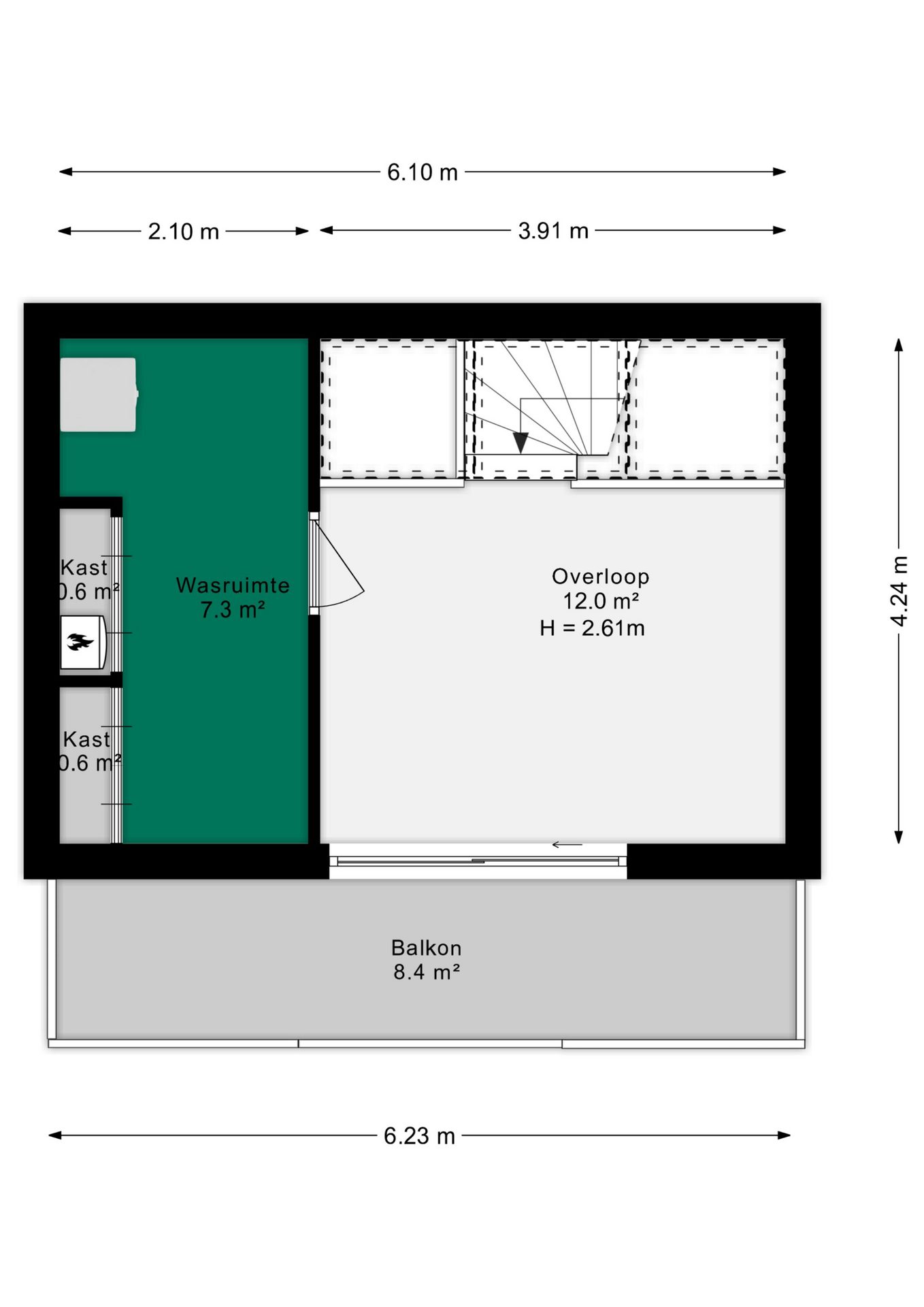 Op de tweede verdieping tref je een mooie open ruimte. Ideaal in te richten als werkplek, extra slaapkamer of speelkamer. Aangrenzend een zeer ruime berging met daarin de technische installatie zoals de CV ketel, wasmachine aansluiting en mechanische ventilatie.