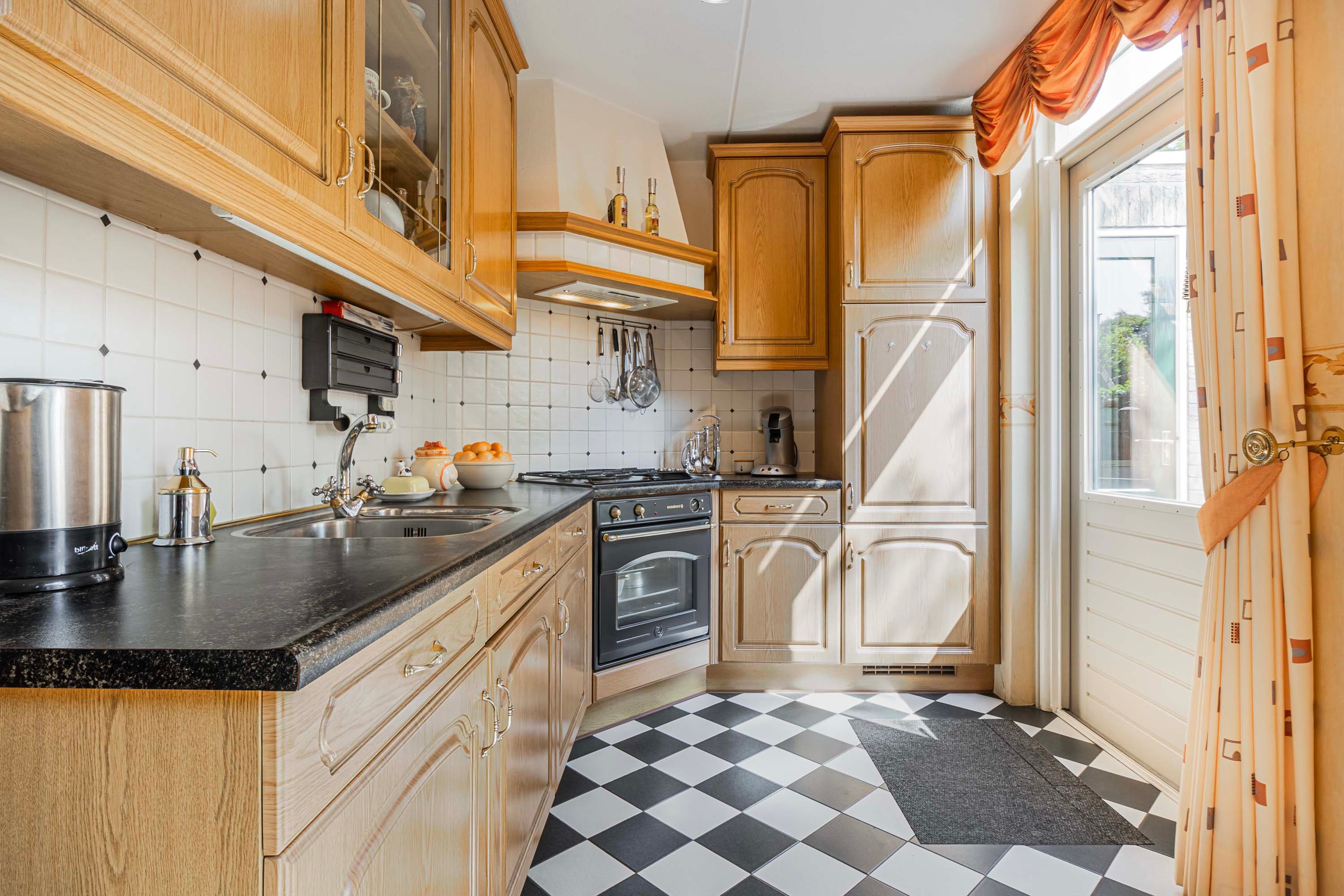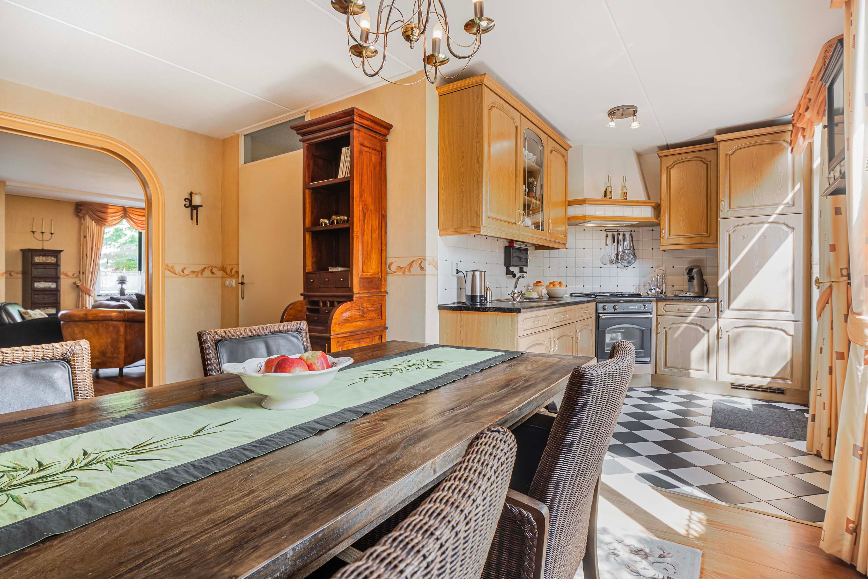 Via de entree, waar zich het toilet, de trapopgang en de meterkast bevinden, betreed je de royale woonkamer. Dankzij de grote raampartijen profiteert de woonkamer van veel natuurlijk daglicht. Er is volop ruimte voor zowel een comfortabele zitbank als meerdere fauteuils. De sfeervolle open haard zorgt voor extra warmte en een knusse ambiance. Vanuit de woonkamer is het eetgedeelte te bereiken, dat voldoende plaats biedt voor een lange eettafel. Vanuit hier loop je door naar de keuken. De keuken is voorzien van diverse inbouwapparatuur, waaronder een gasfornuis, afzuigkap, oven en koelkast. Daarnaast biedt de keuken directe toegang tot de tuin.