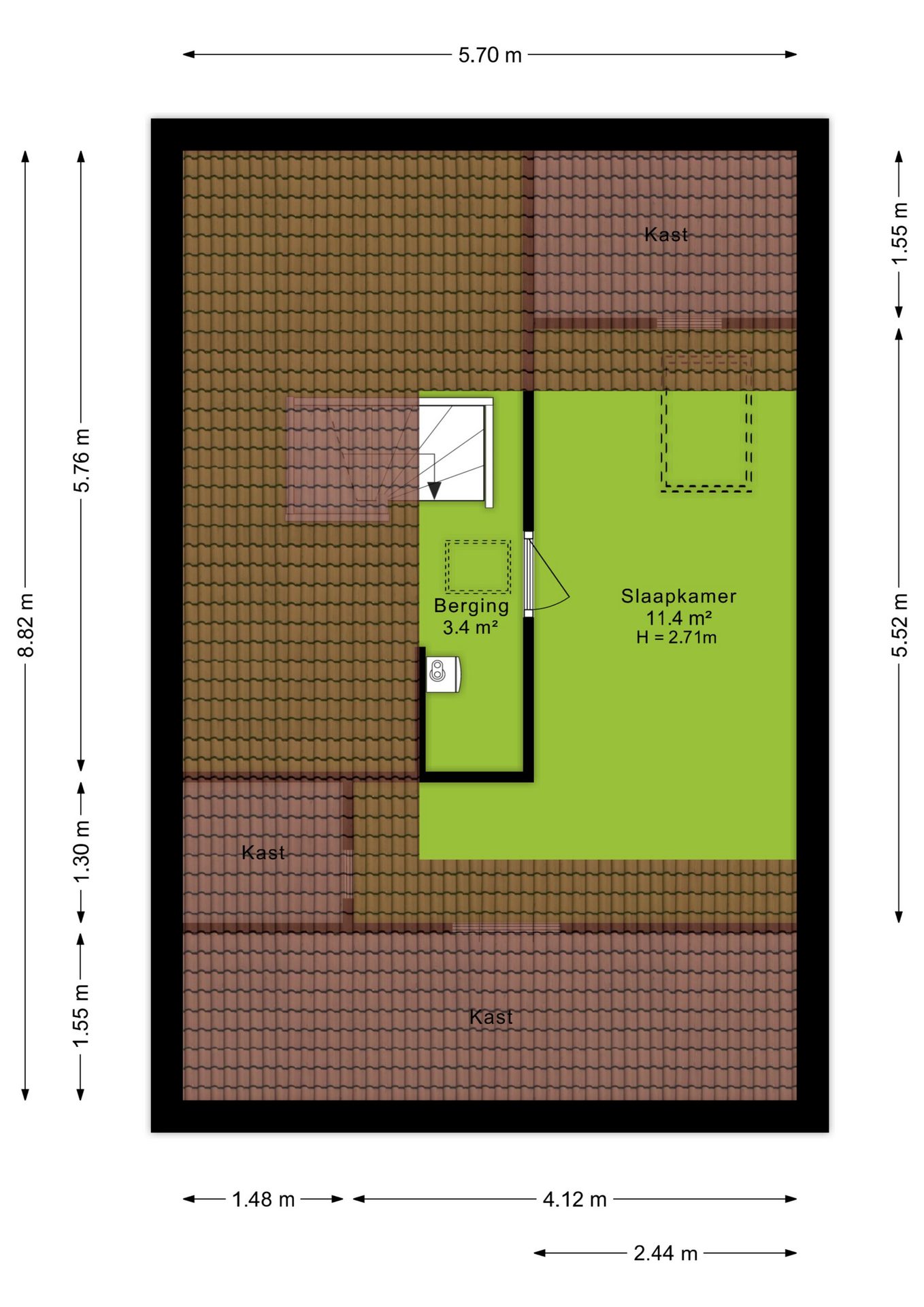 Een vaste trap leidt naar de zolderverdieping, waar een vierde slaapkamer is gerealiseerd met een oppervlakte van 11,4 m². Deze kamer is multifunctioneel en kan bijvoorbeeld gebruikt worden als werk- of sportruimte. De zolder beschikt over dakramen en biedt daarnaast veel bergruimte.
