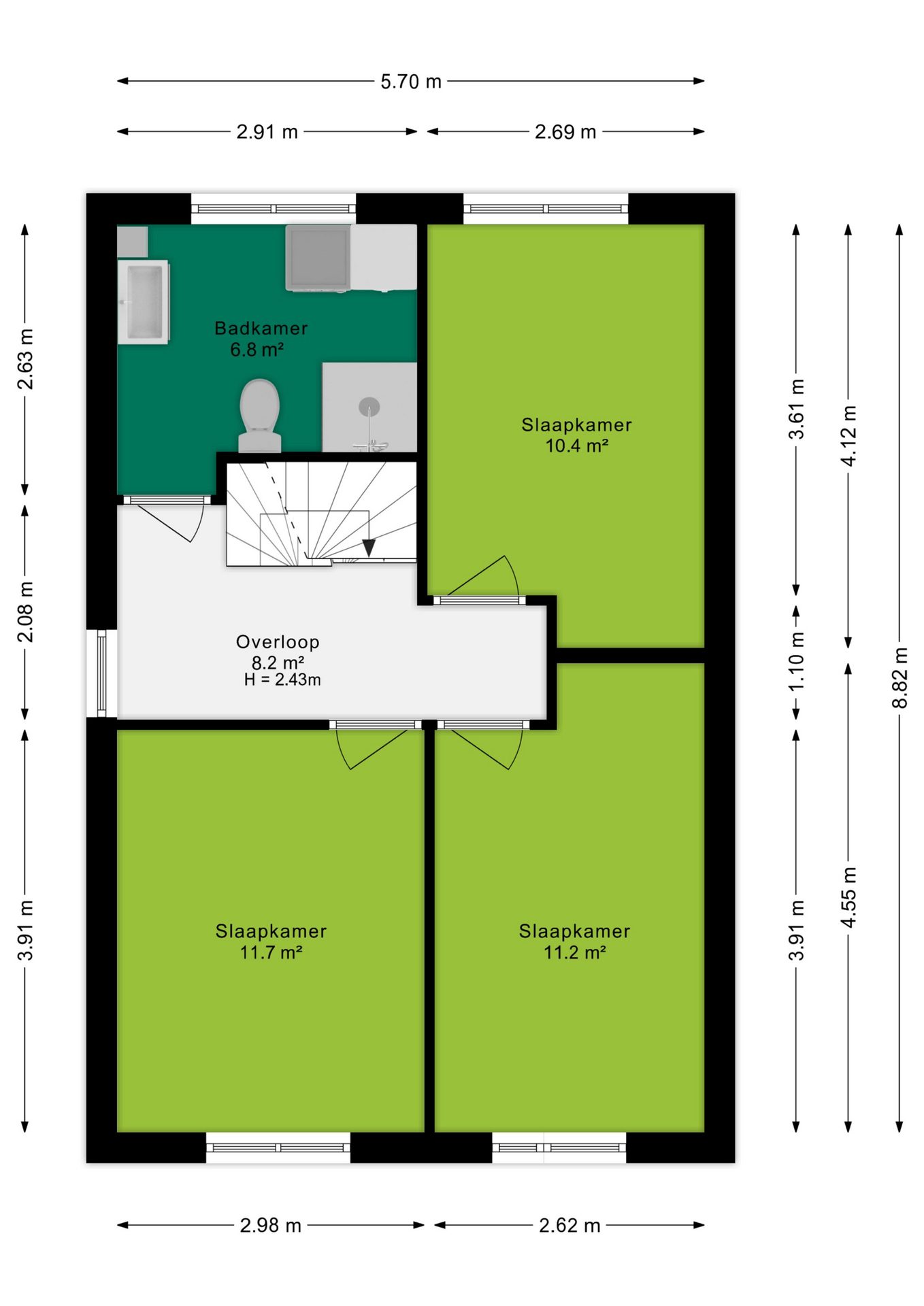 De ruime overloop geeft toegang tot alle vertrekken op deze verdieping. Er zijn drie lichte slaapkamers met oppervlaktes van respectievelijk 11,7 m², 11,2 m² en 10,4 m². Alle kamers zijn voorzien van ramen, wat zorgt voor veel daglicht. De badkamer heeft een wastafelmeubel, toilet en een douche. Tevens zijn hier de aansluitingen aanwezig voor de wasmachine en droger. Het raam in de badkamer zorgt voor natuurlijke ventilatie.
