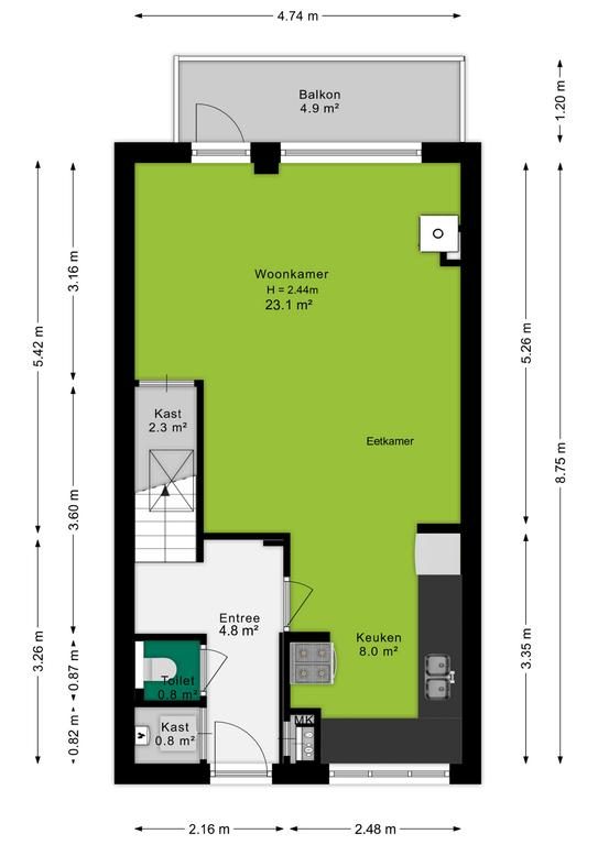 Het appartement is uitgerust met een nette laminaatvloer. Op de begane grond zijn de wanden en het plafond gestuct.