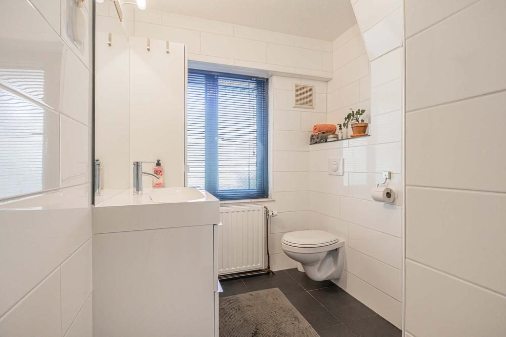 De badkamer is voorzien van een douchehoek, een tweede toilet, een wastafel met spiegel en wastafelmeubel.