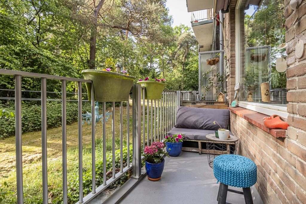 Via de woonkamer is een praktische trapkast bereikbaar met daarin een luik dat, via een vaste trap, toegang geeft tot de ruime berging. Het balkon is bereikbaar vanuit de woonkamer en gelegen op het zonnige zuid-oosten. Door het vele groen rondom de appartementen zit je hier heerlijk privé, kijk je naar het groen en met wat geluk zie je eekhoorntjes voorbij komen.