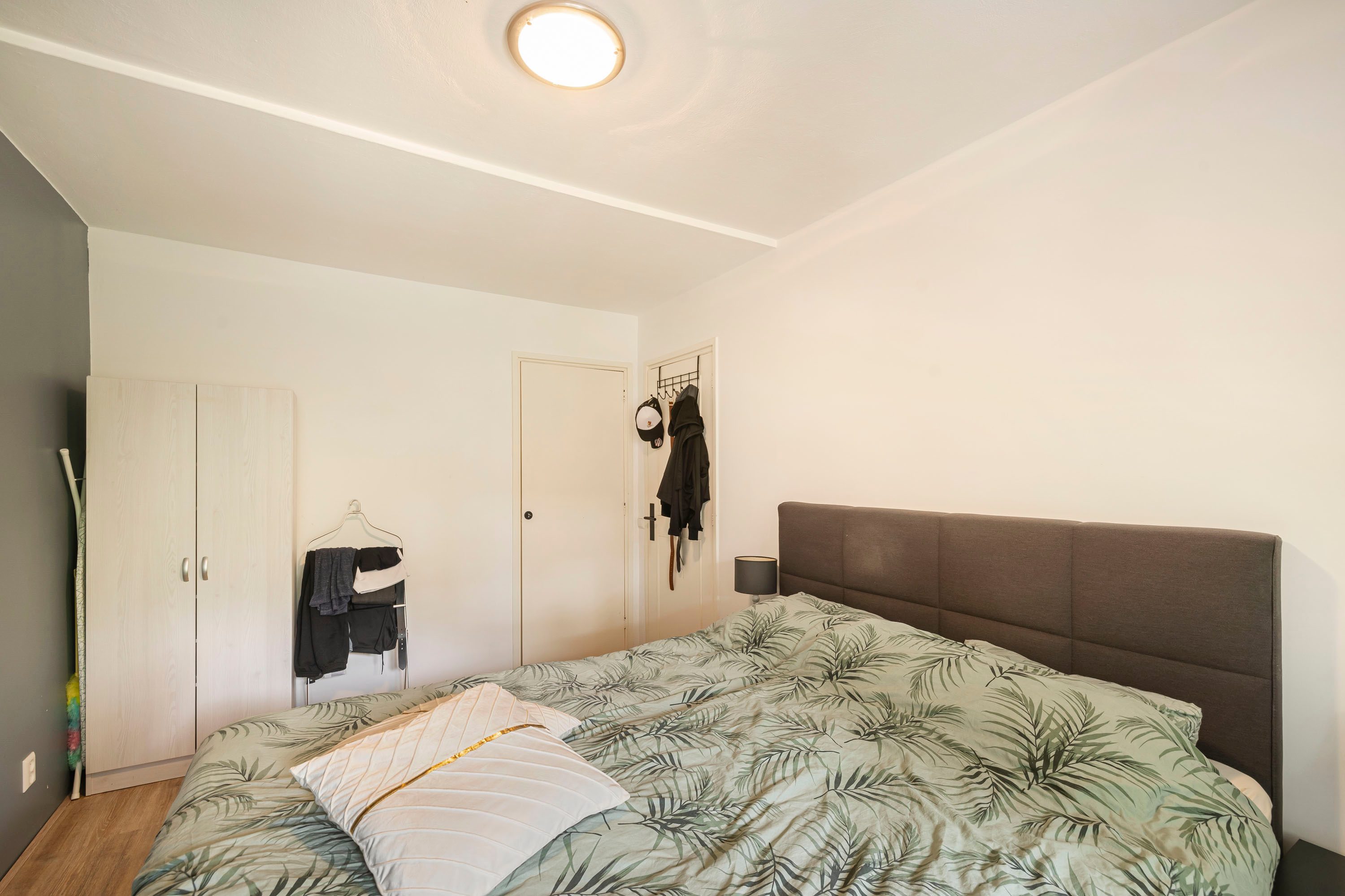 Via de vaste trap kom je op de overloop, die toegang geeft tot drie slaapkamers van 6,5 m², 9,7 m² en 12 m². Alle kamers zijn recht opgetrokken en voorzien van een nette laminaatvloer. Daarnaast zijn er op deze verdieping vier inbouwkasten aanwezig, wat zorgt voor veel opbergruimte. De badkamer aan de voorzijde heeft een moderne en rustgevende uitstraling, met een inloopdouche, wastafelmeubel en toilet.