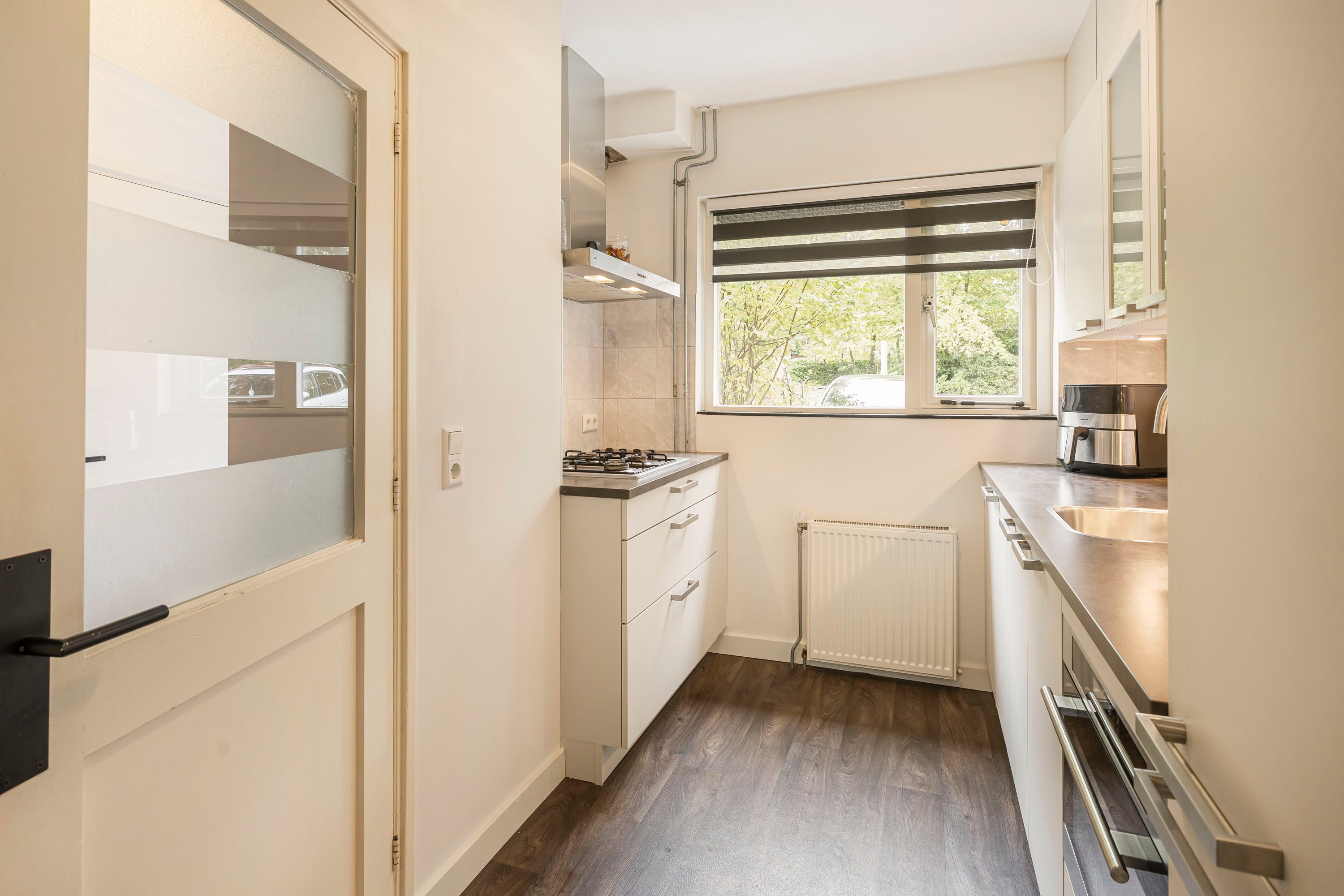 De ruime hal geeft toegang tot het toilet, praktische trapkast, vaste kast en de keuken. De keuken is opgesteld in lichte kleuropstelling met bovenkasten voor een extra bergruimte. De moderne keuken is vernieuwd in 2020 en voorzien van een kookplaat, oven-combimagnetron, koelvriescombinatie en vaatwasser. Vanuit de keuken is er een open verbinding met de woonkamer, die dankzij de ramen over fijn daglicht beschikt. Via een deur in de woonkamer stap je het balkon op, dat een fijne plek biedt om van de middagzon te genieten.