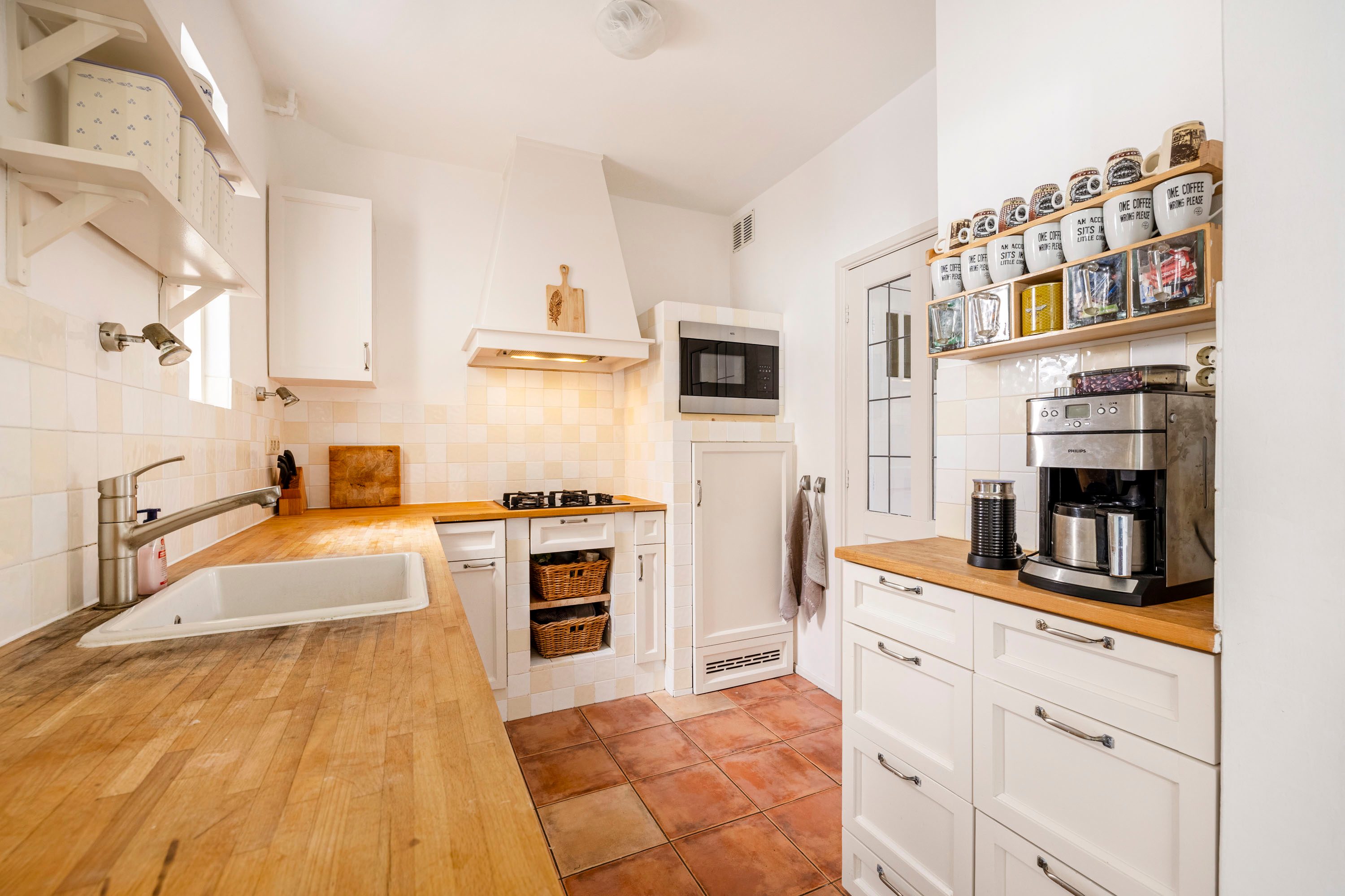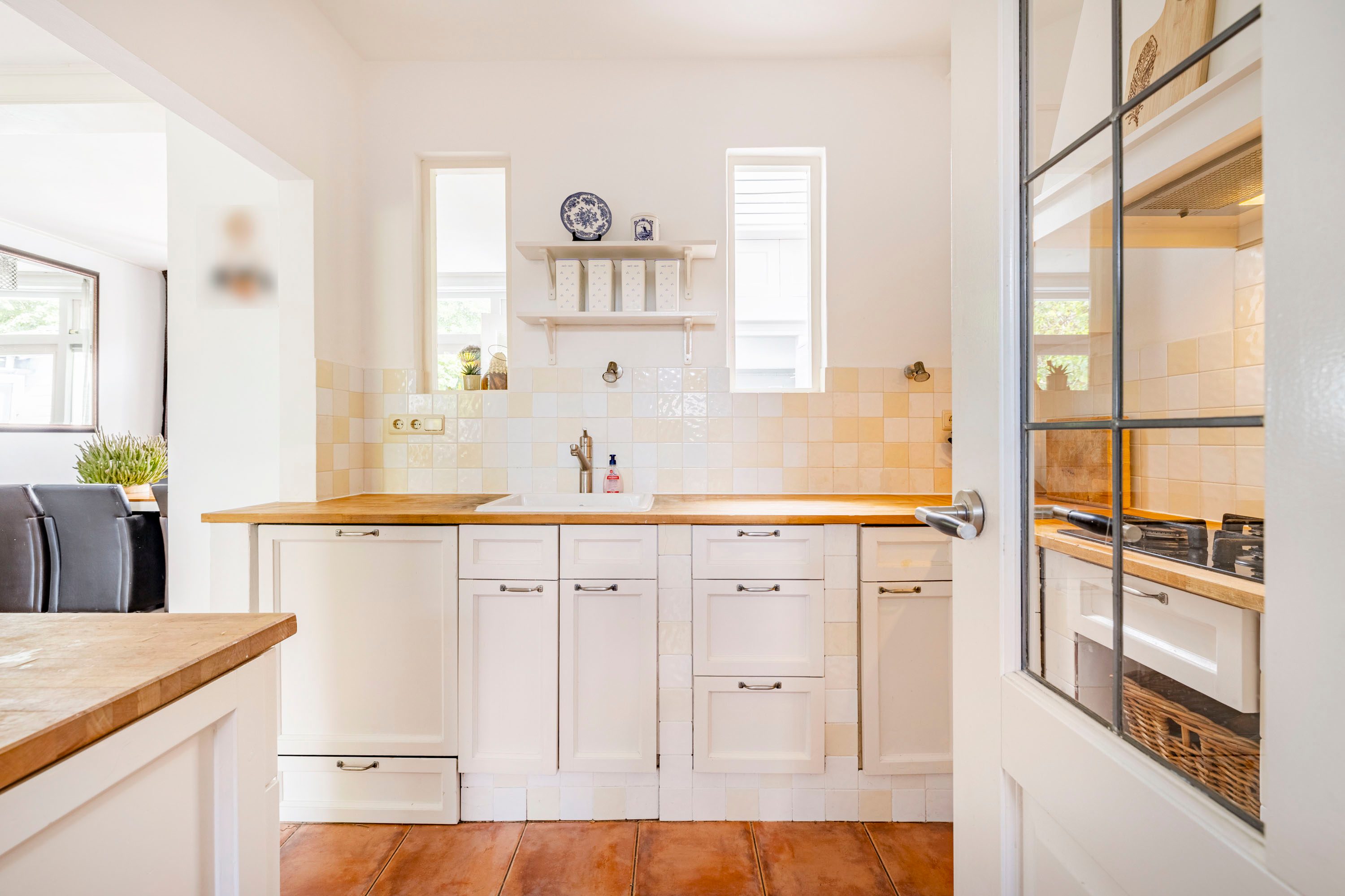 De half open keuken is uitgevoerd in een lichte kleurstelling. Het houten werkblad biedt een mooie uitstraling die past bij de woning. De keuken is volledig uitgerust met diverse inbouwapparatuur, te weten: