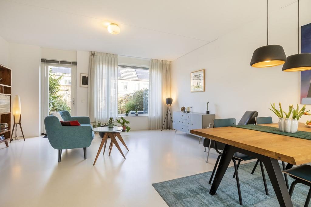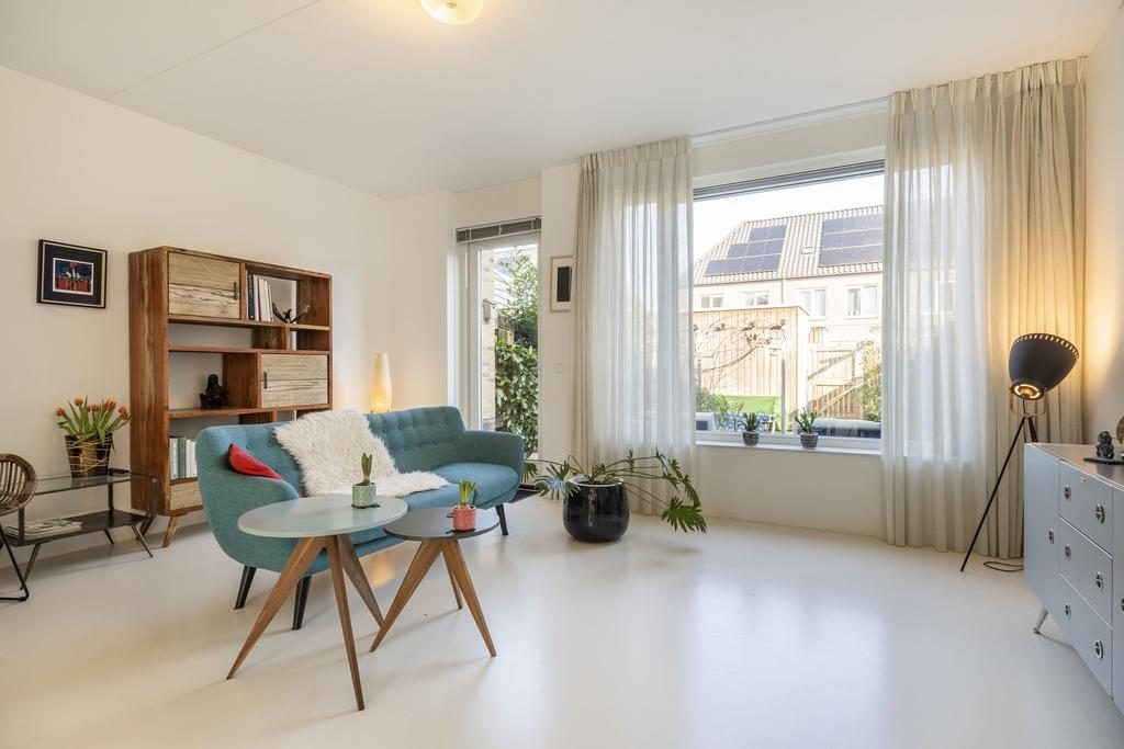 De heerlijke tuingerichte woonkamer beschikt over een kunststof pu-gietvloer en middels een deur is achtertuin gelegen op het noorden te bereiken. De gehele begane grondvloer is voorzien van comfortabele vloerverwarming. De trapkast in de woonkamer biedt extra opbergruimte.