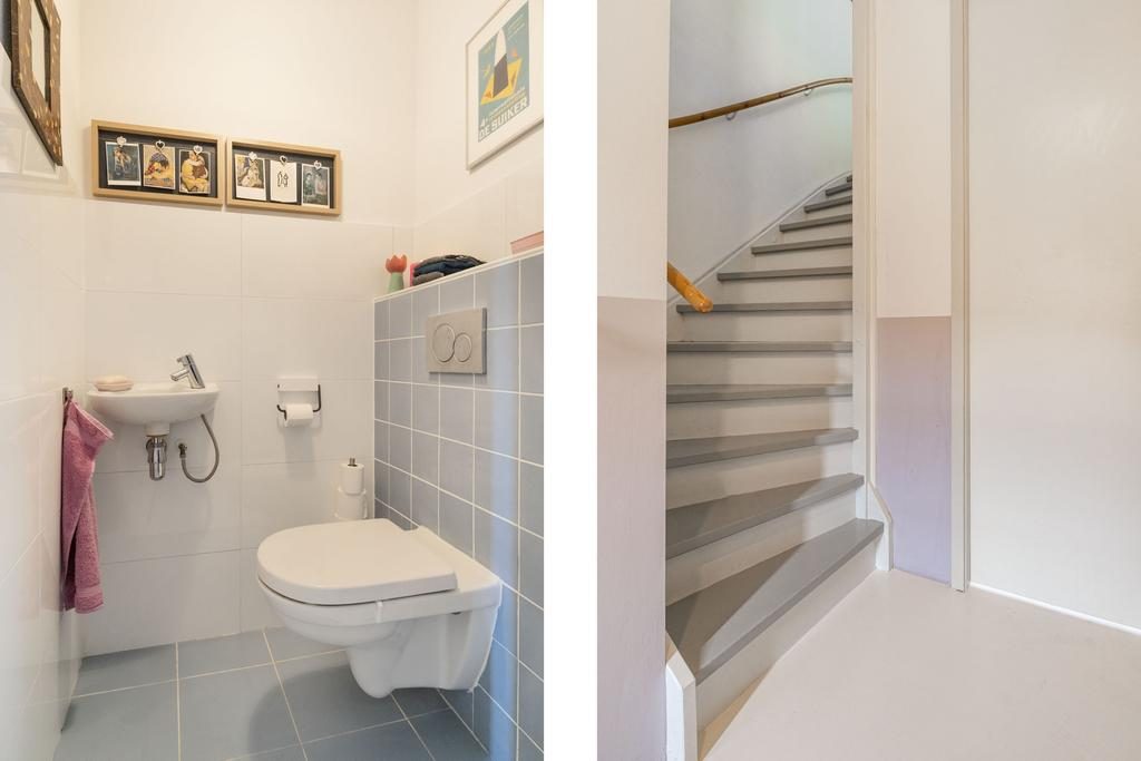 Via de entree kom je bij de hal met moderne meterkast, toiletruimte voorzien van zwevend toilet met fonteintje en trapopgang naar de eerste verdieping.