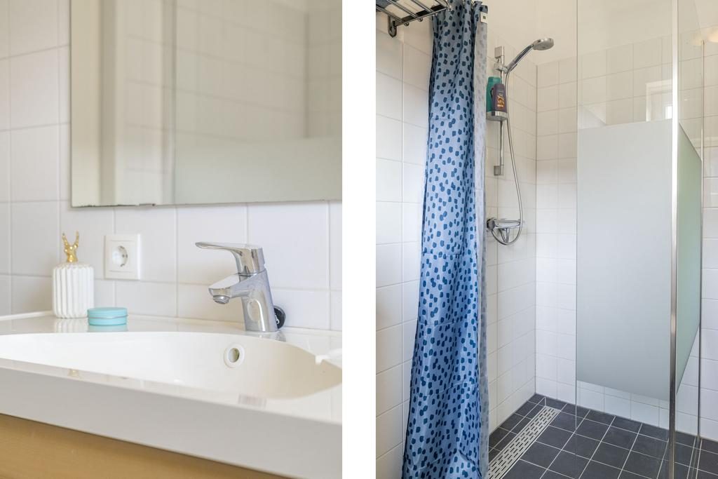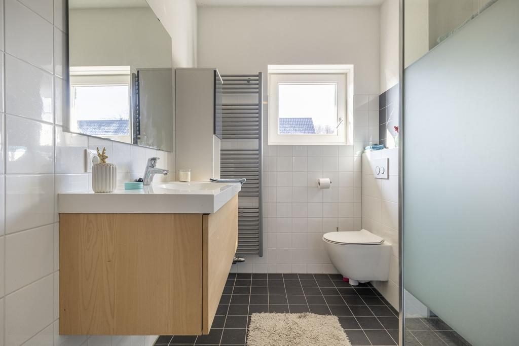 De badkamer is ingedeeld met een inloopdouche voorzien van een thermostaatkraan, 2e zwevend toilet en wastafelmeubel. Ventilatie vindt plaats middels de mechanische ventilatie en/of het raam. De wanden zijn voorzien van strak tijdloos licht tegelwerk in combinatie met een antraciet-kleurige vloertegel.