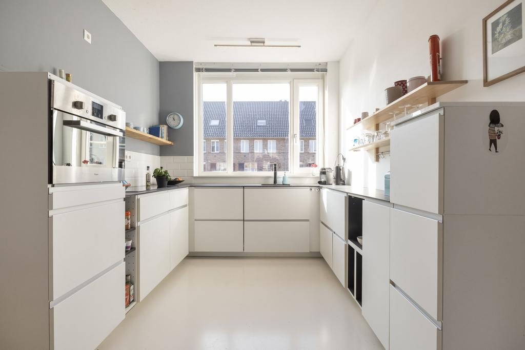 Aan de voorzijde van de woning is de keuken gesitueerd. De keuken is opgesteld in een L-vorm en beschikt over veel opbergruimte en diverse inbouwapparatuur, te weten: