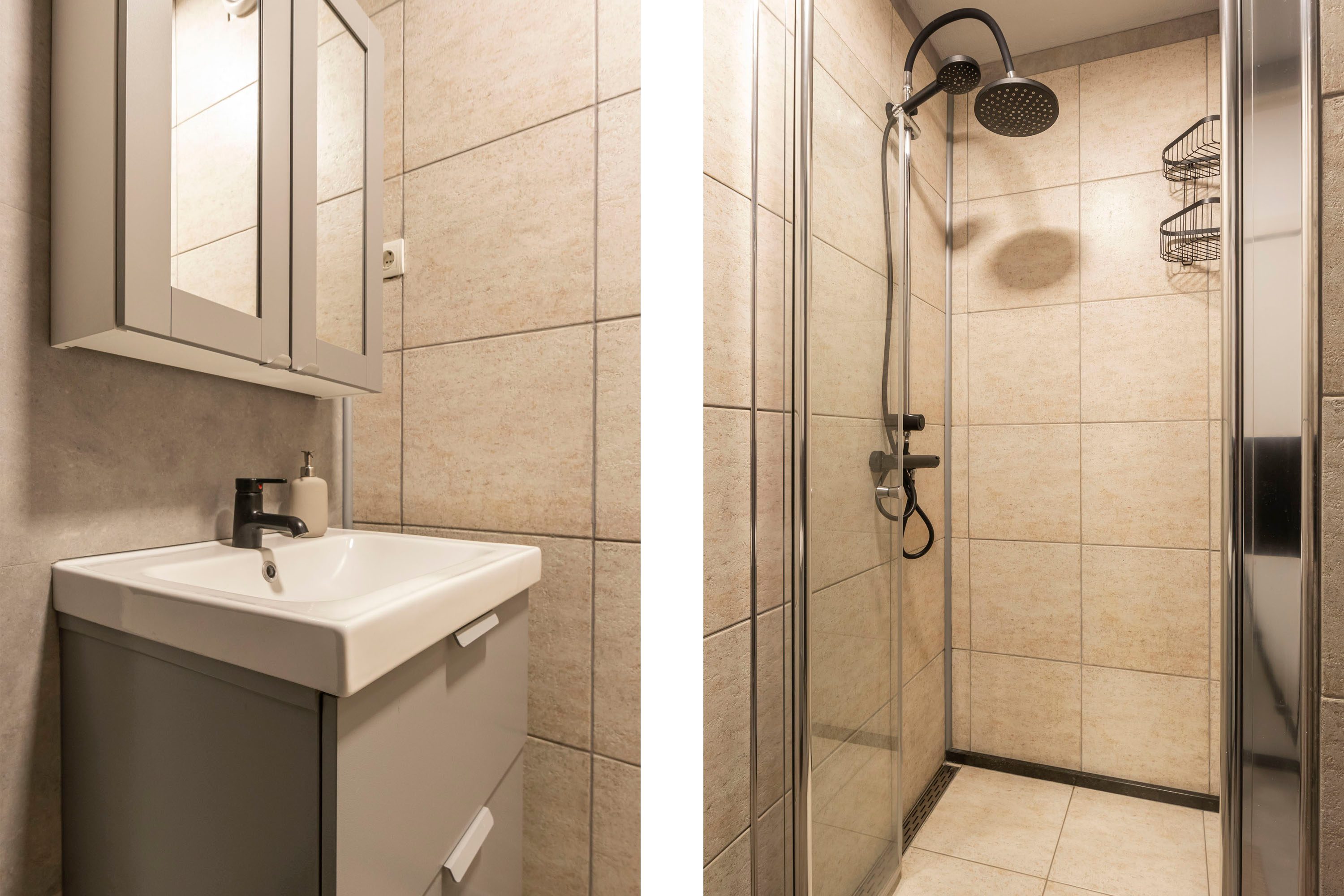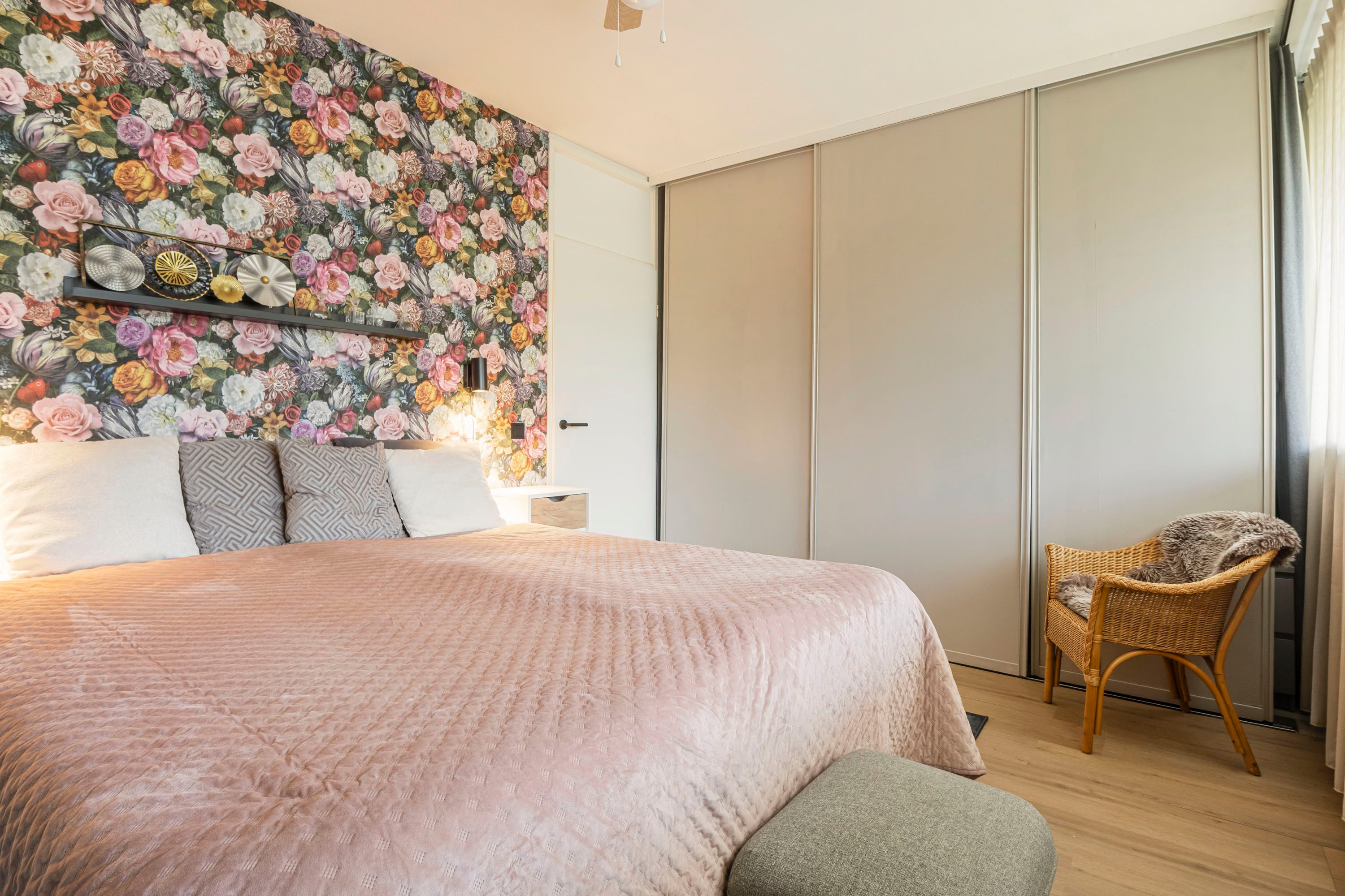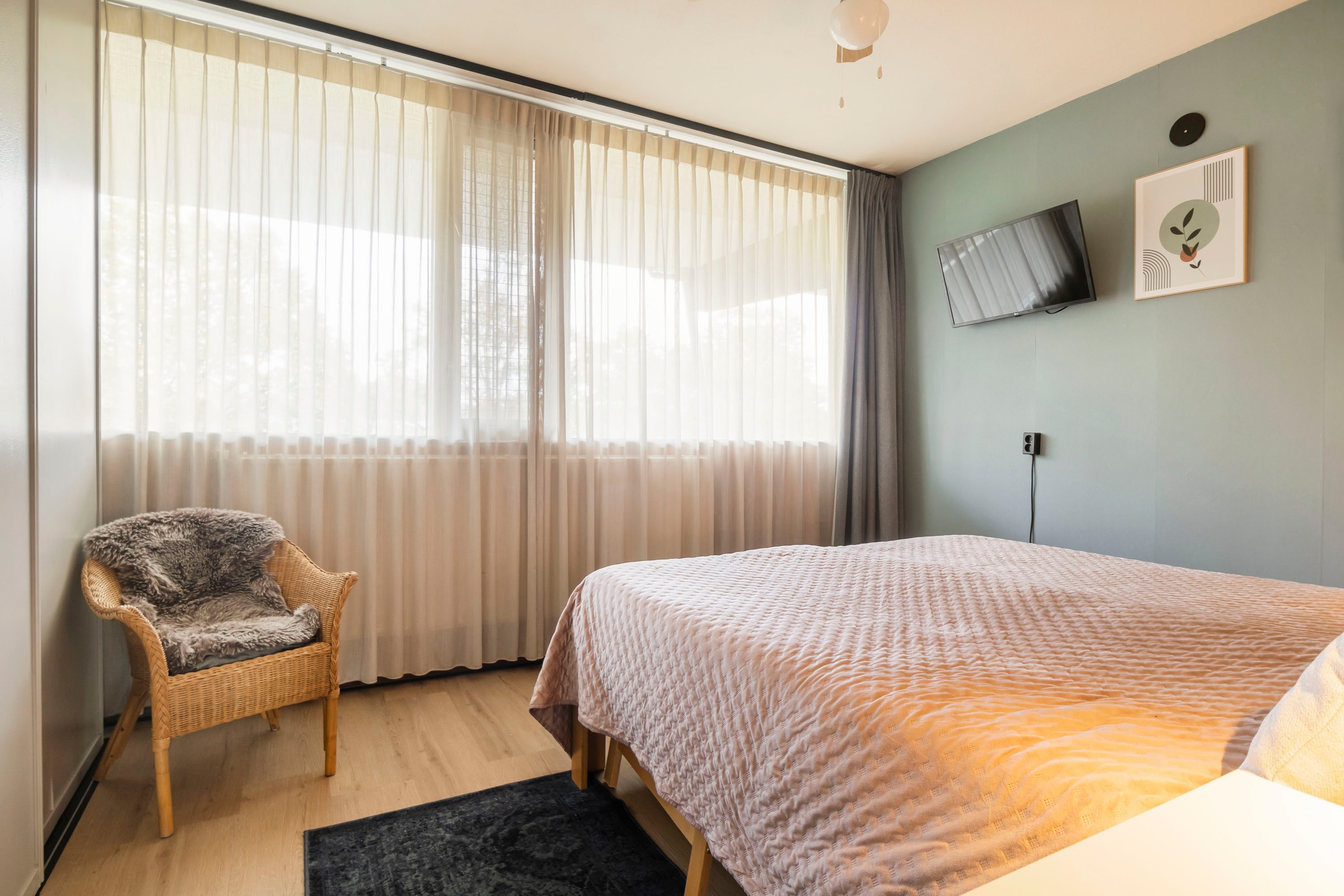 De woonkamer is bereikbaar via een schuifdeur met matglas en beschikt over een kunststof schuifpui die toegang geeft tot het balkon. De airconditioning kan zowel koelen als verwarmen en er zijn elektrische rolluiken aanwezig, wat bijdraagt aan het wooncomfort. Vanuit de woonkamer is de eerste slaapkamer bereikbaar, voorzien van een tv-aansluiting en een kast die ter overname is. De tweede slaapkamer ligt aan de andere zijde van de hal en heeft directe toegang tot het balkon. Deze ruimte kan ook perfect worden gebruikt als kantoor, logeerkamer of eventueel teruggebracht worden tot 2 aparte kamers. De badkamer beschikt over een douche en wastafelmeubel, terwijl het toilet zich apart bevindt voor extra gemak. Daarnaast is er een inpandige berging van circa 2 m² met ruimte voor opslag.