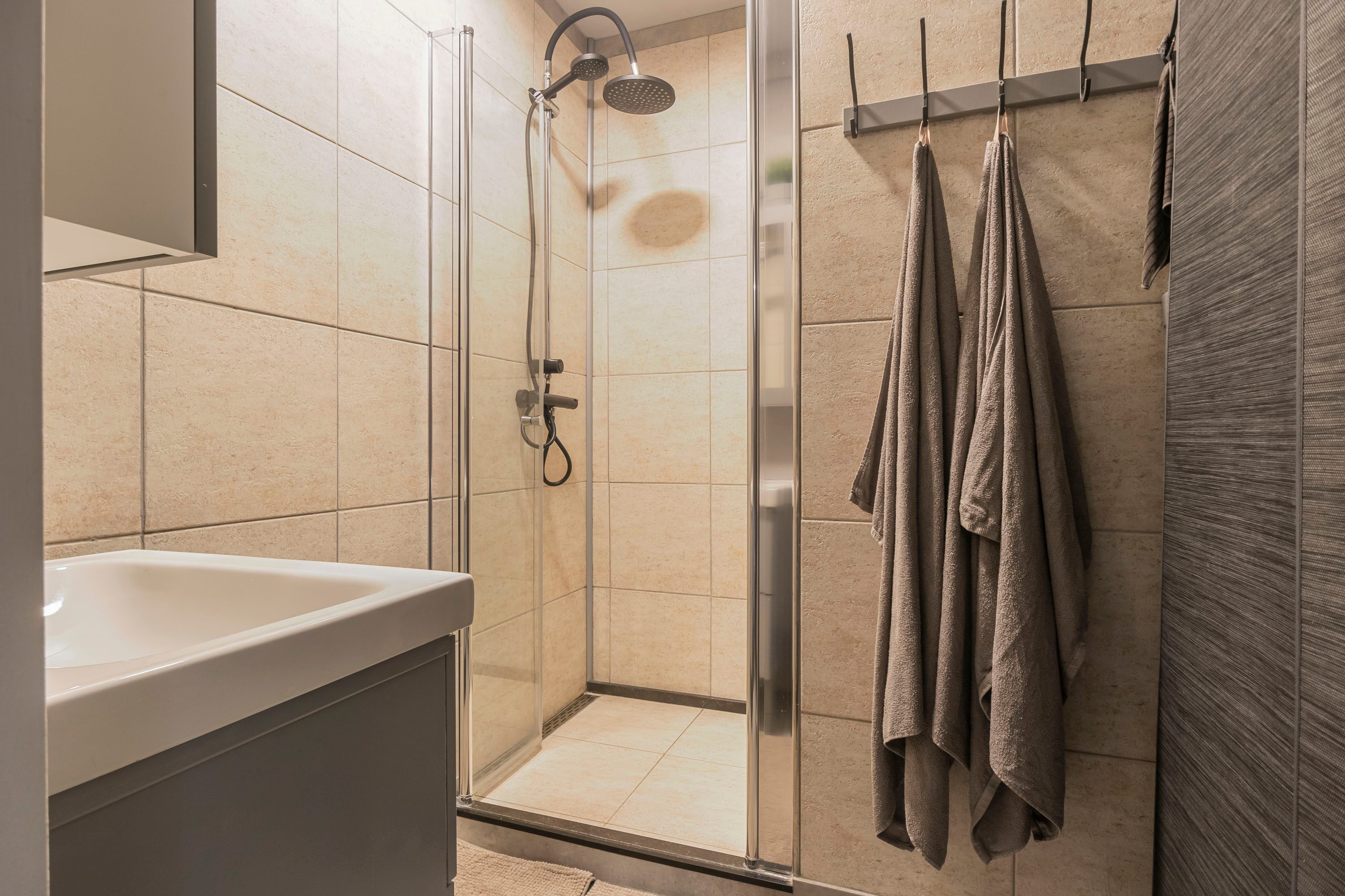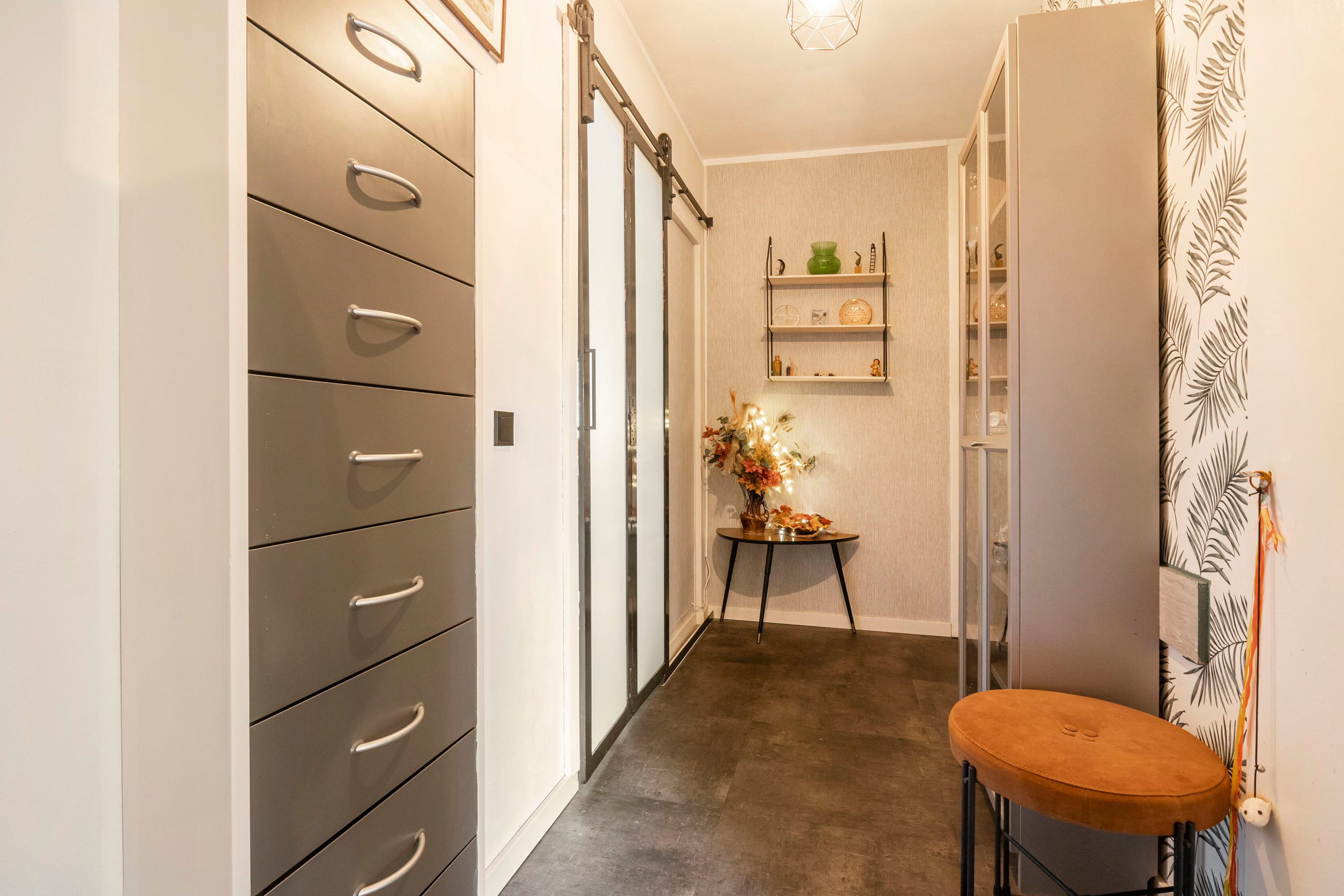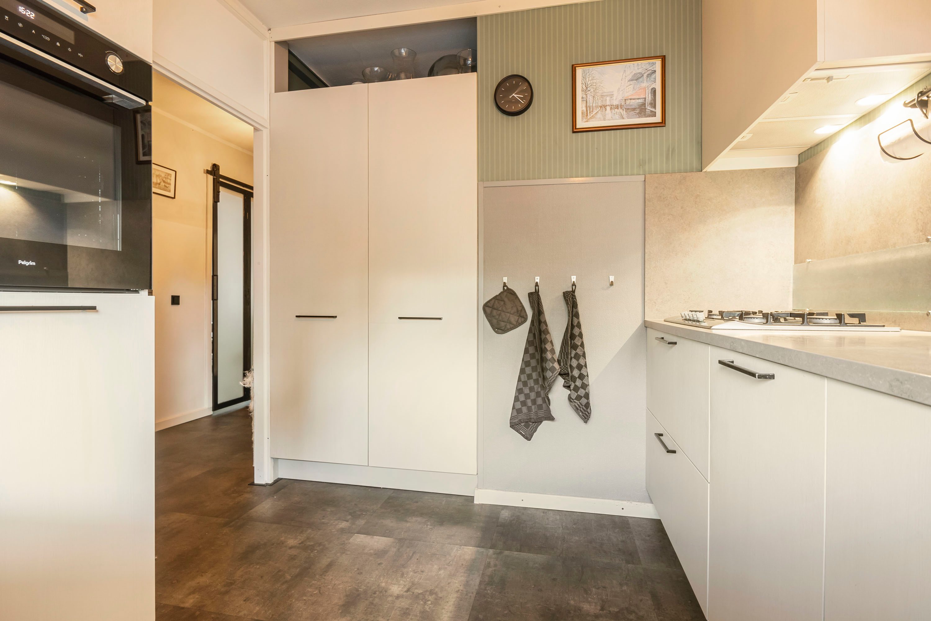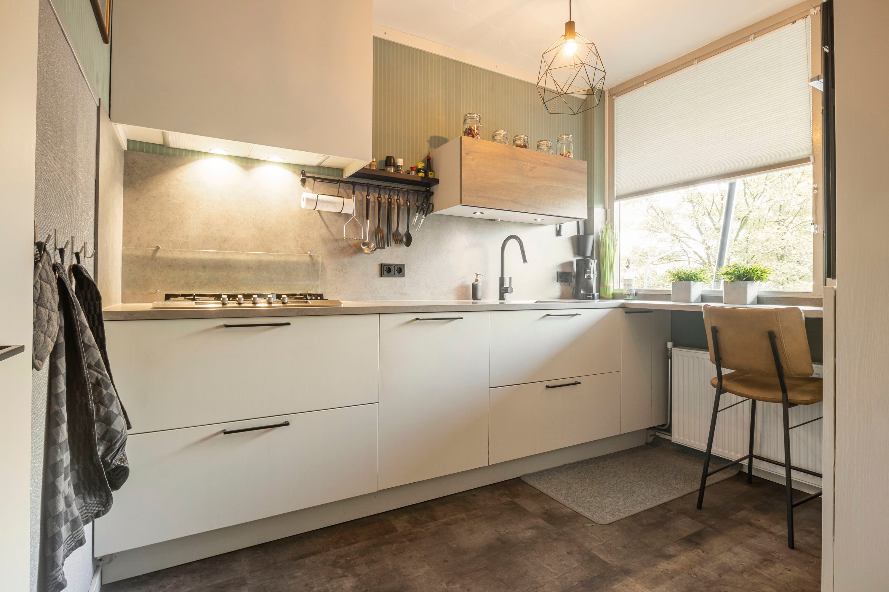 Bij binnenkomst in de entree vind je de meterkast. Direct bij binnenkomst in de hal bevindt zich de moderne keuken, voorzien van een combi-oven/magnetron, gasfornuis, koelkast en een doorlopend aanrechtblad bij het raam dat als gezellig zitje kan worden gebruikt. De inbouwspotjes zorgen voor aangenaam werklicht en de praktische indeling biedt veel opbergruimte.