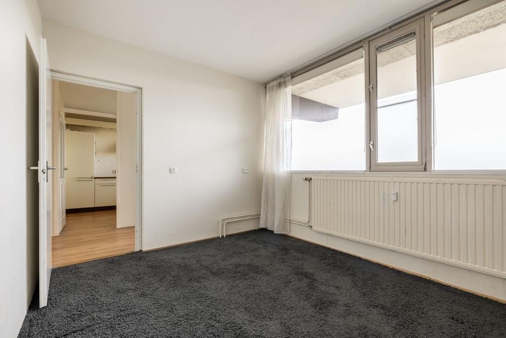 Aan de voorzijde van de woning bevindt zich de slaapkamer. Aangrenzend ligt de ruime woonkamer, die dankzij de grote raampartijen volop daglicht binnenlaat. Vanuit de woonkamer bereik je via een schuifdeur het balkon.