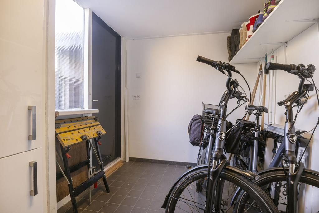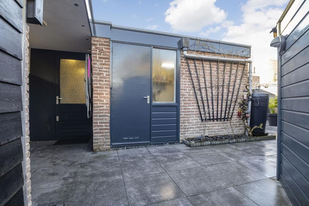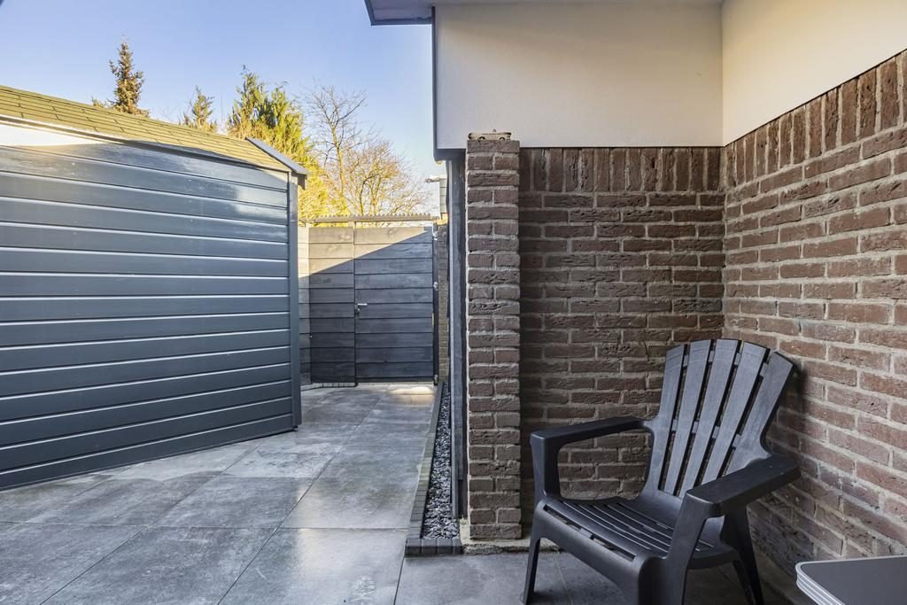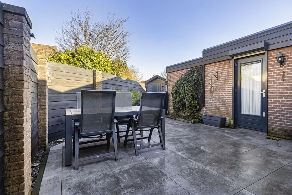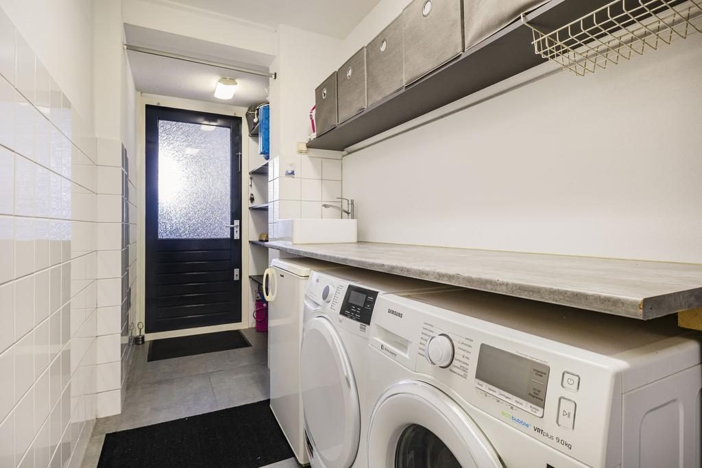 De bungalow beschikt over een fijne bijkeuken met wasmachine- en drogeraansluiting biedt extra opslagruimte en toegang tot een kleine overkapping en de beschutte achtertuin. Aan de achterzijde is er bovendien een schuur én een houten berging aanwezig.