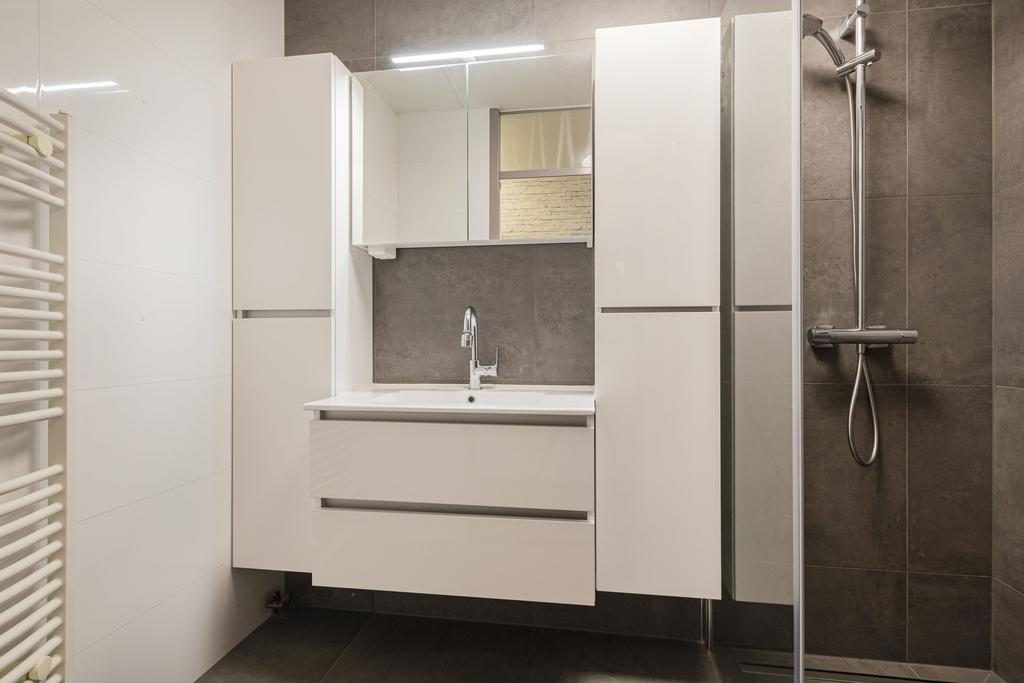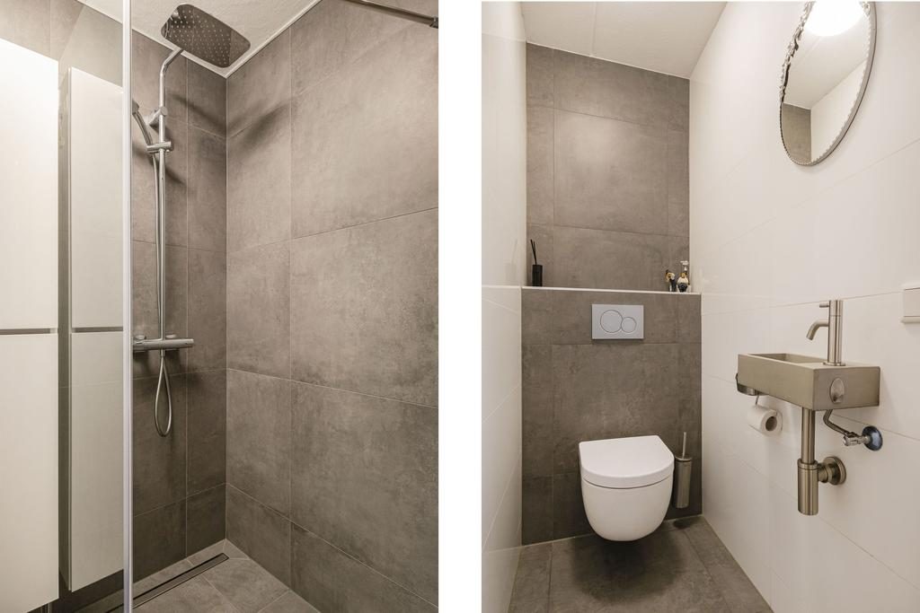 De moderne badkamer is vernieuwd in 2020 en is voorzien van een ruime inloopdouche met vloerdrain en regendouche, een wastafelmeubel, spiegelkast en handdoekradiator. Tevens beschikt de bungalow over een separate toiletruimte met modern tegelwerk, wandcloset en een fonteintje.