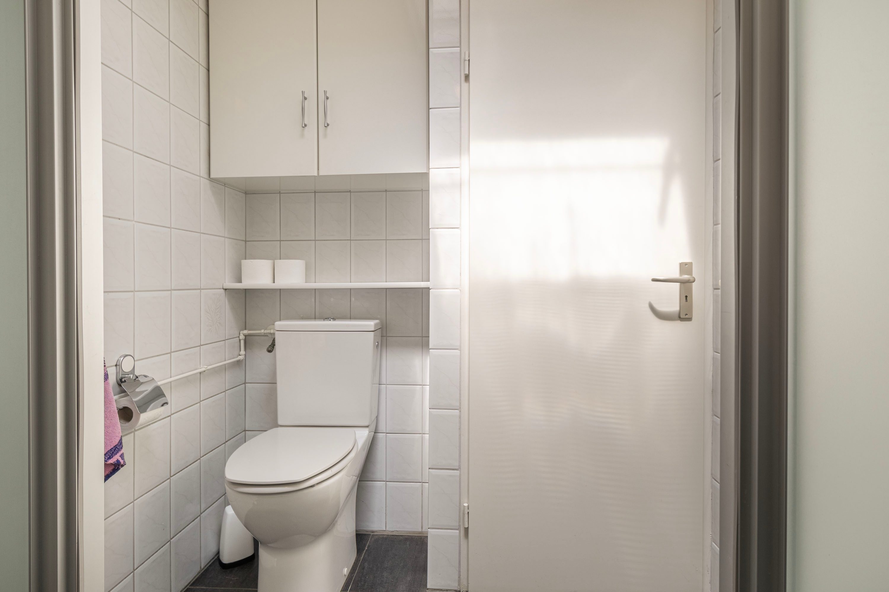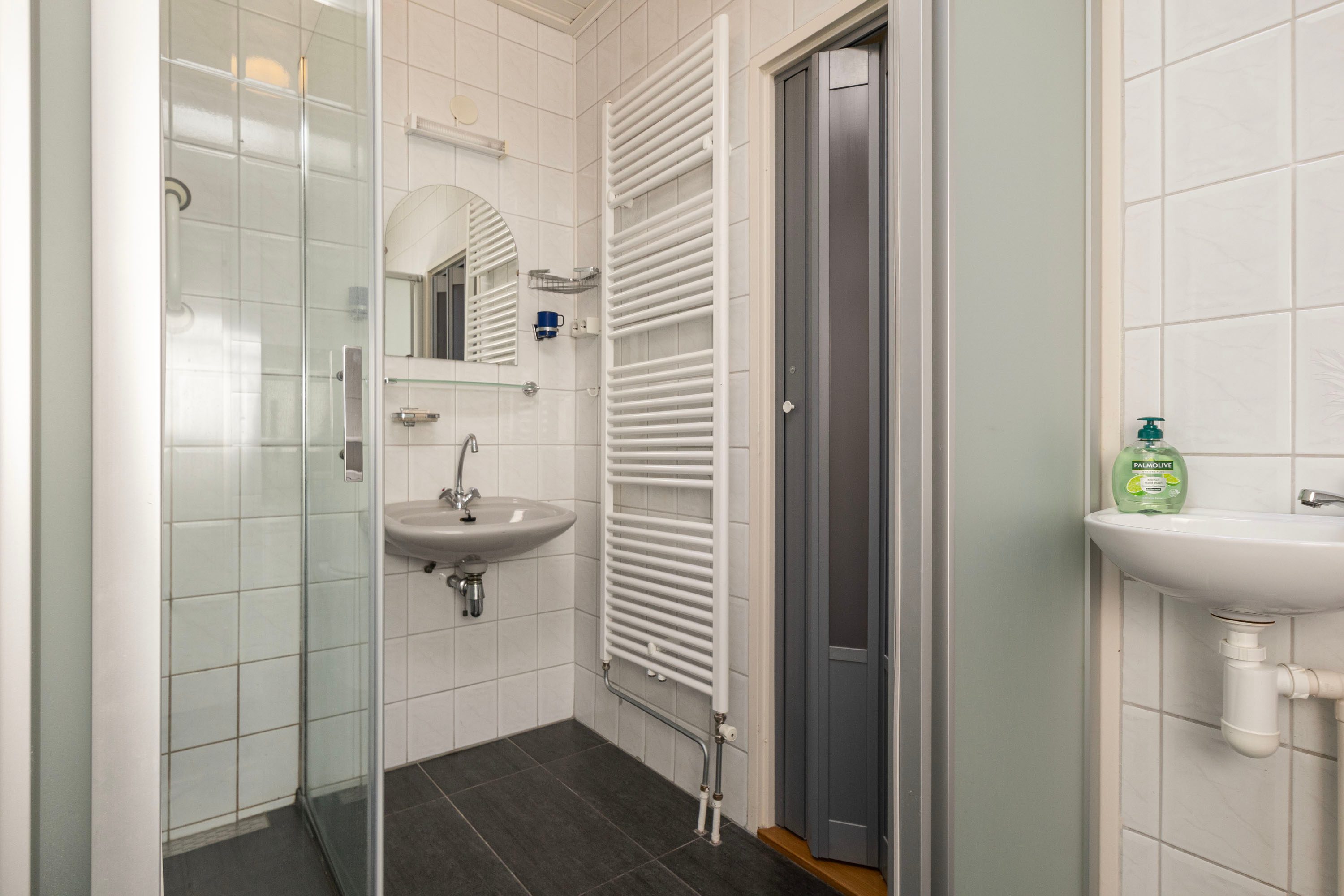 De badkamer is modern afgewerkt met witte en antracietkleurige tegels en beschikt over twee wastafels, een toilet en een douchehoek.